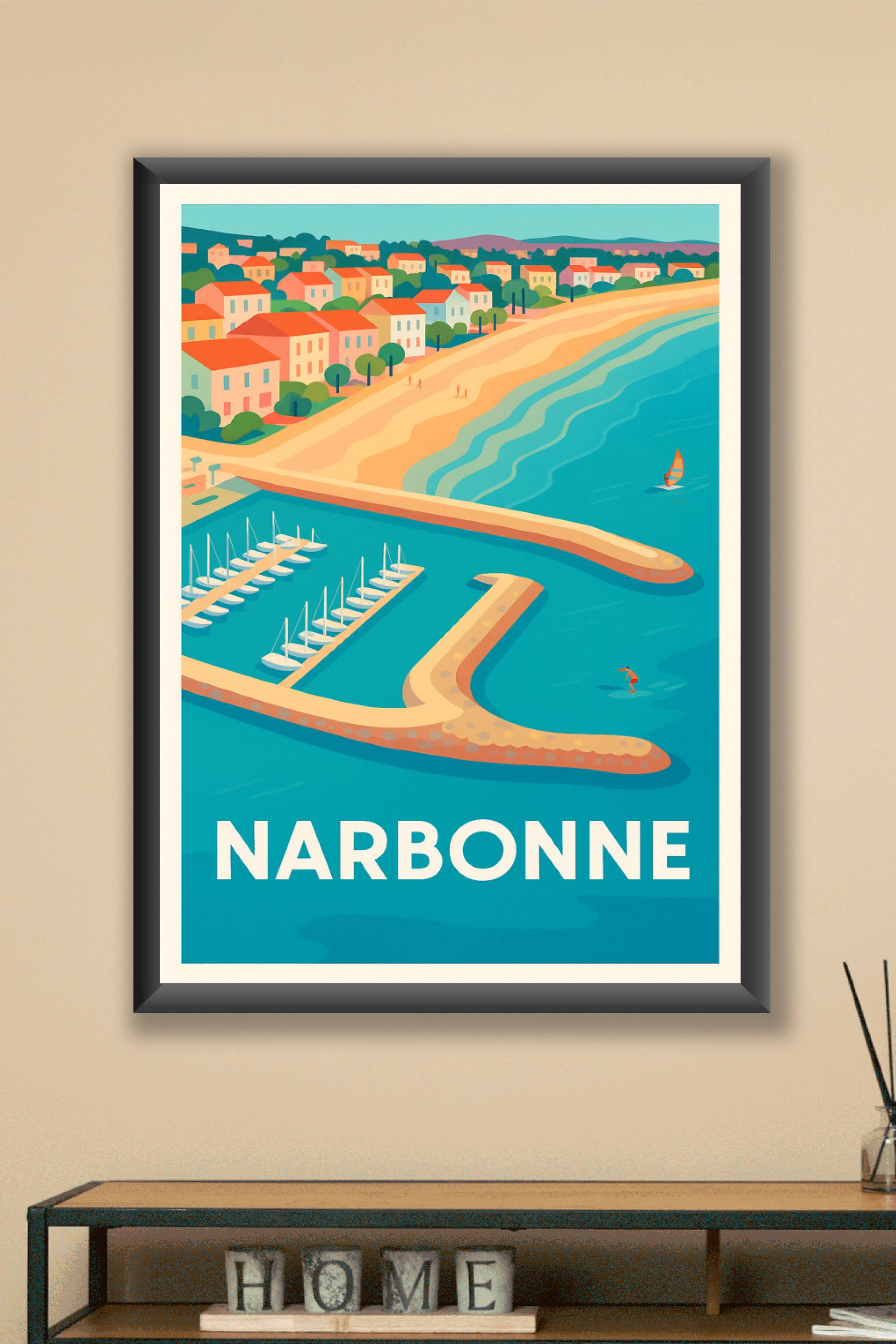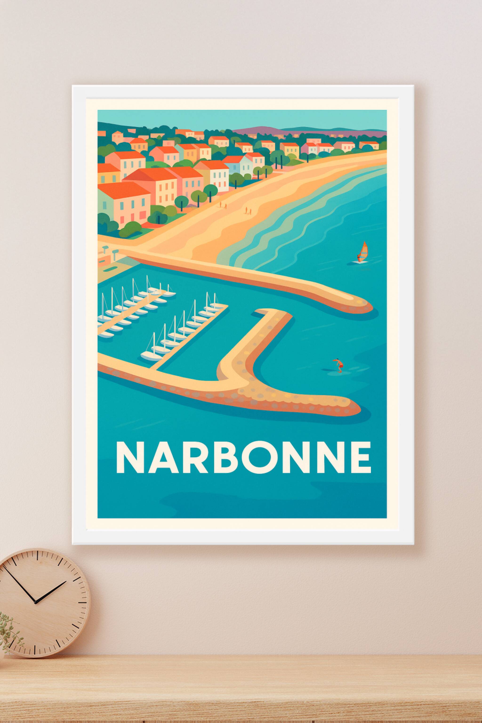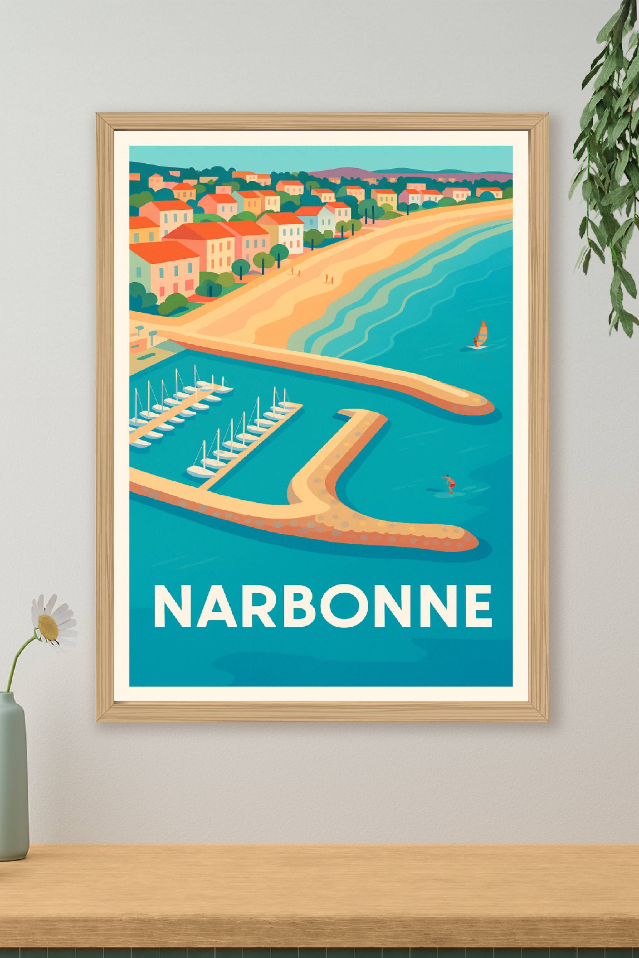 Découvrez Narbonne sous un angle graphique et enchanteur avec cette affiche au style vibrant et épuré. Le poster illustre la charmante côte, ses pl...