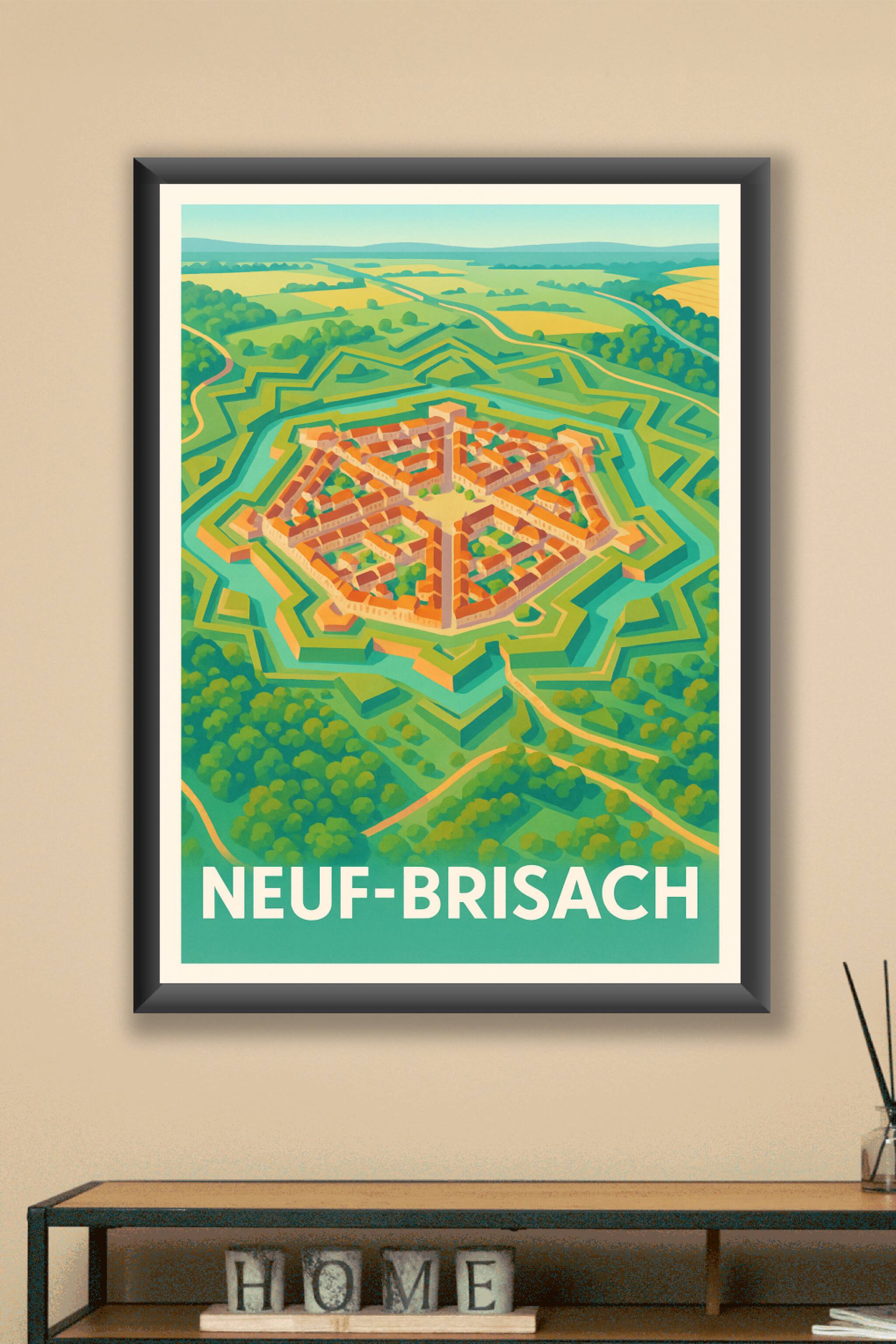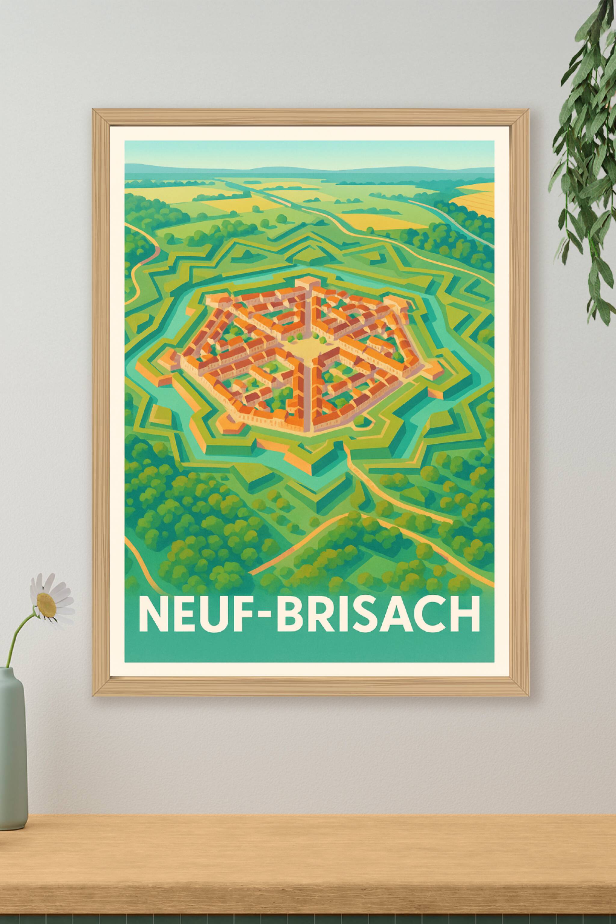 Découvrez la remarquable architecture militaire de Neuf-Brisach avec cette affiche illustrée mettant en avant la célèbre citadelle en forme d'étoil...