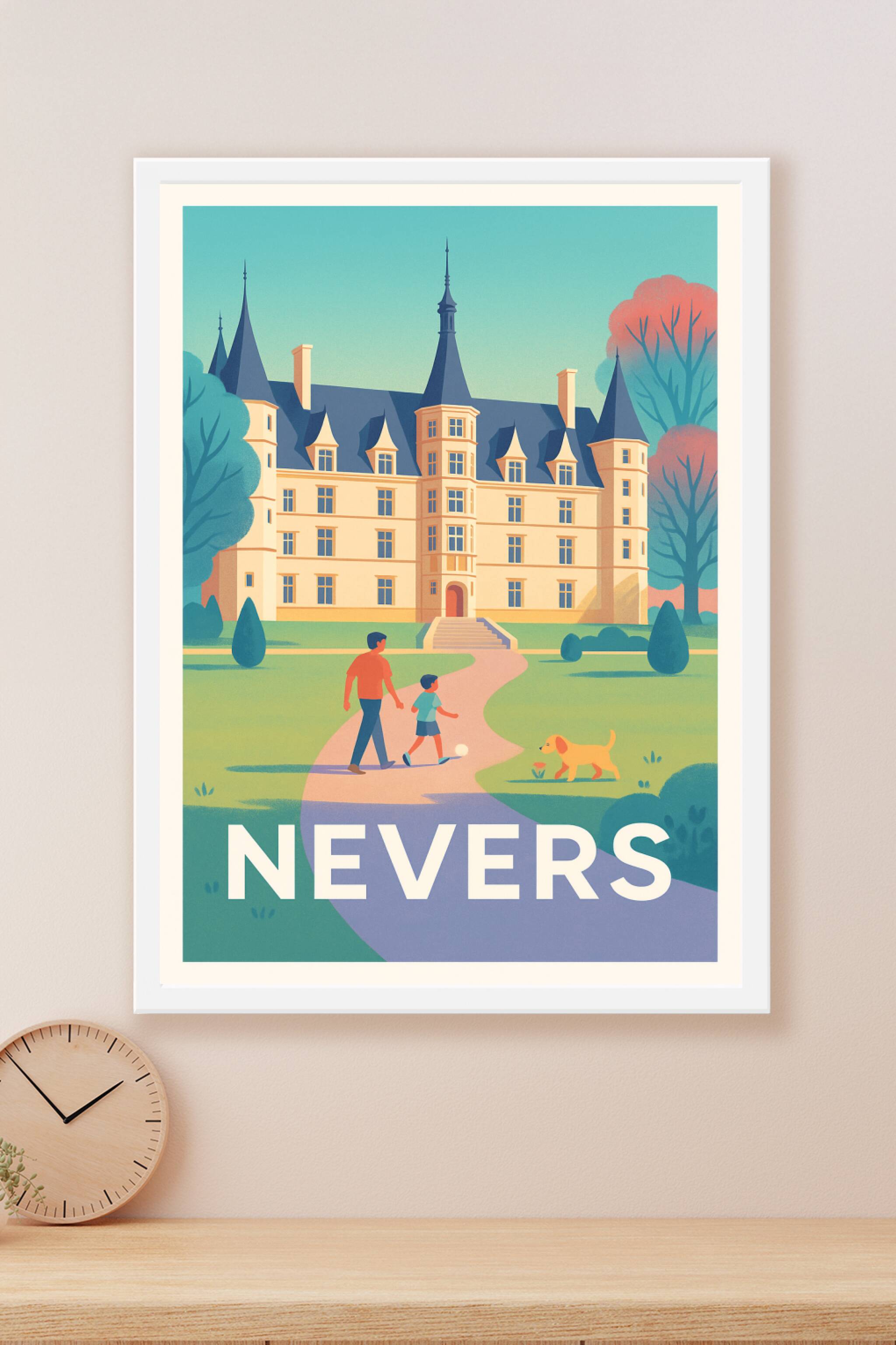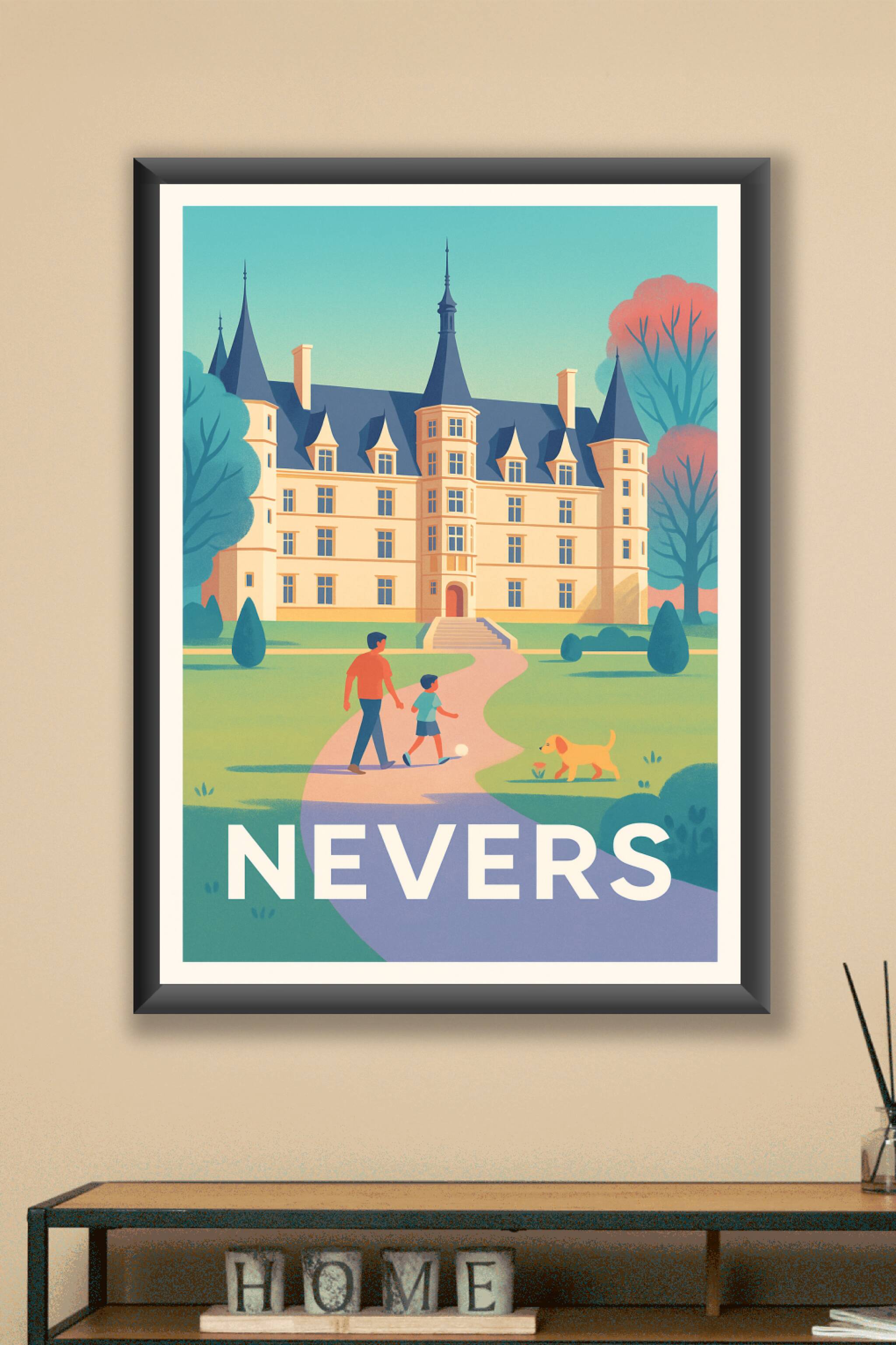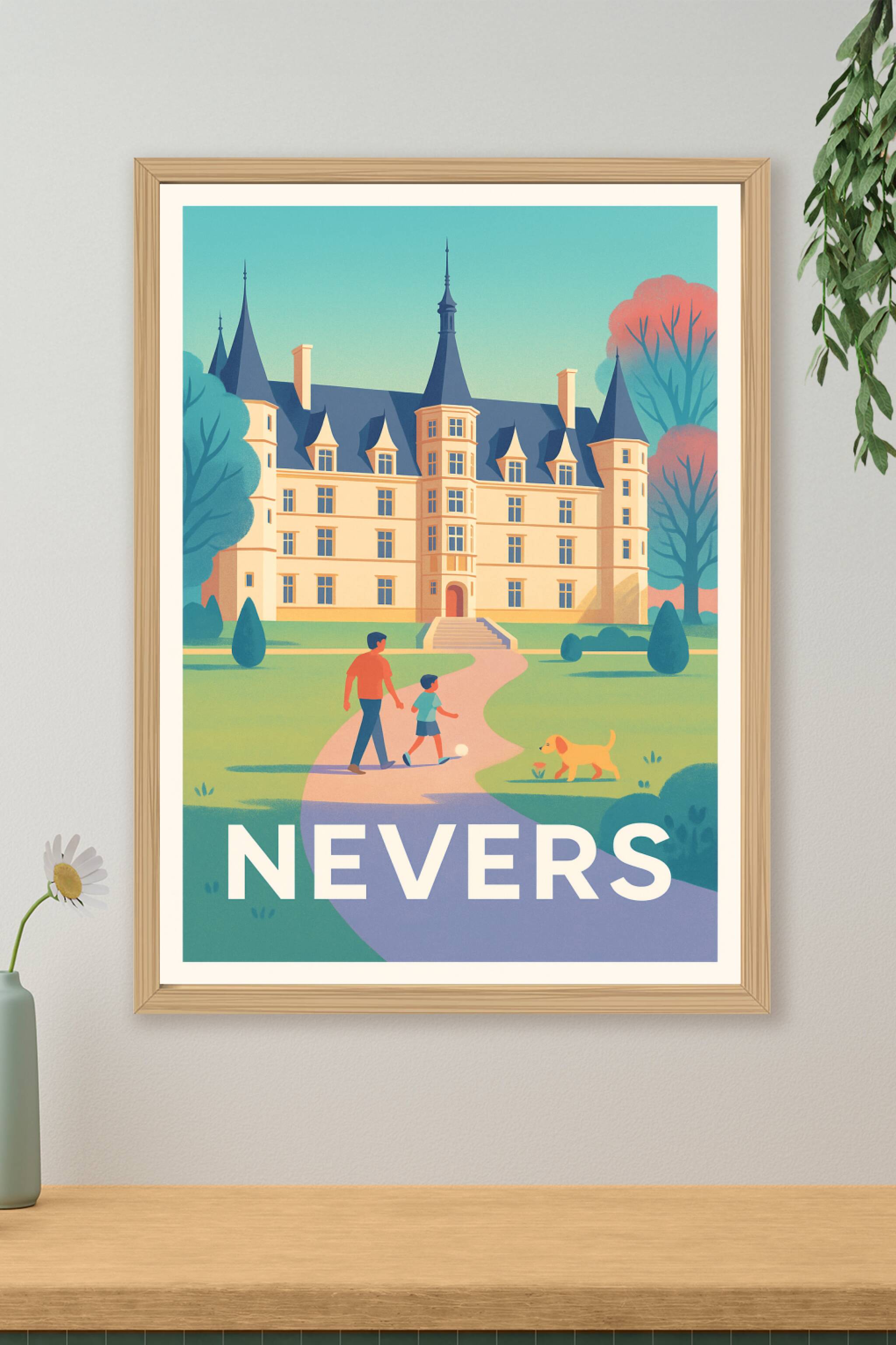 Découvrez cette magnifique affiche représentant le Château de Nevers et son parc paisible, sublimée par une illustration aux tons doux et harmonieu...