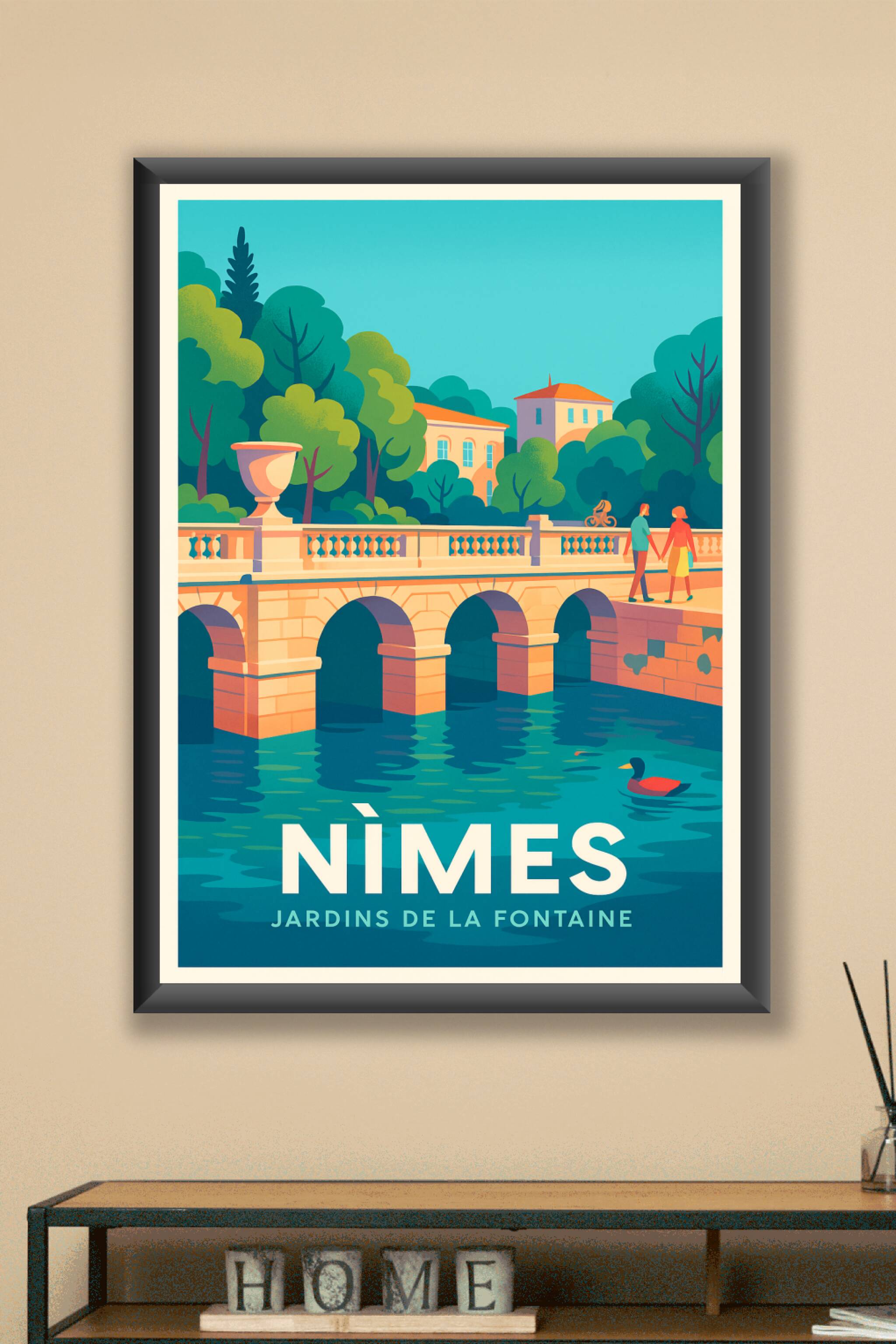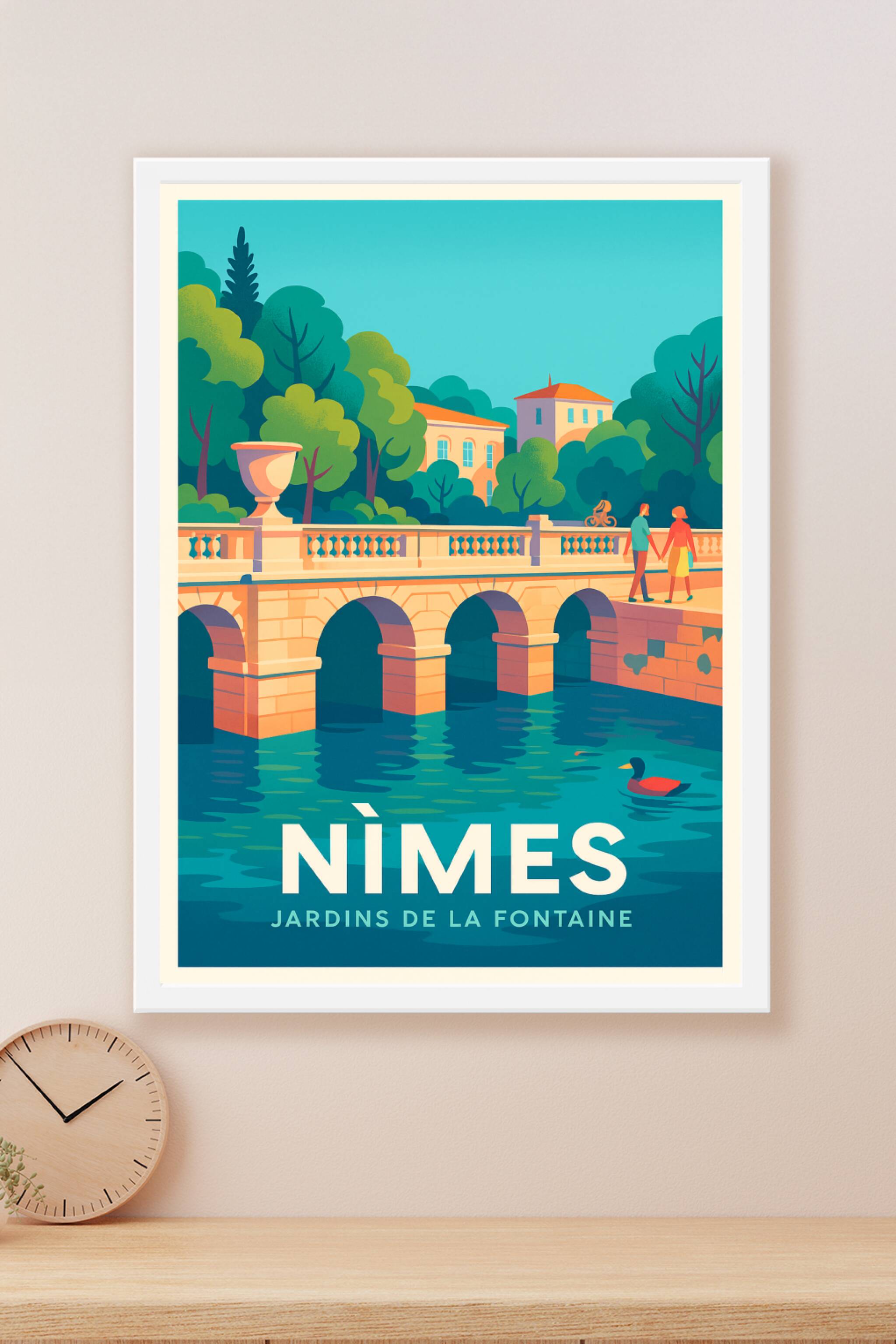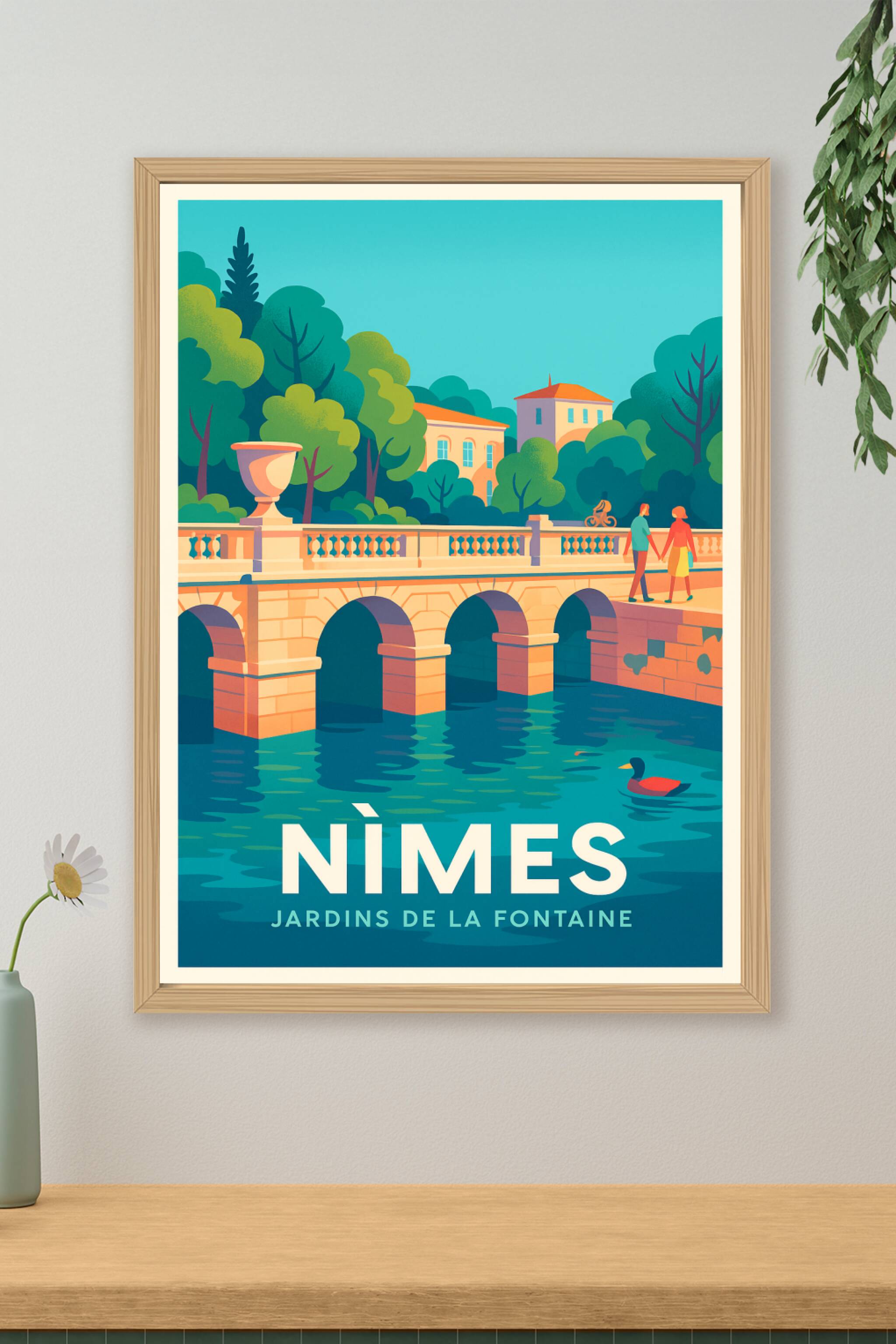 Redécouvrez l'élégance intemporelle des Jardins de la Fontaine de Nîmes avec ce poster illustré aux teintes douces et vibrantes. Cette affiche style néo-rétro capture la sérénité d'un des plus anciens jardins publics d'Europe, entre architecture classique, nature luxuriante et reflets paisibles. Tirage "Fine Art" sur papier 305g coton pour un rendu exceptionnel et une durabilité optimale. Disponible en formats A1 à A4, avec ou sans cadre, cette affiche est idéale pour sublimer votre intérieur ou offrir un souvenir raffiné de la ville romaine de Nîmes. Impression haute qualité 100% fabriquée en France.