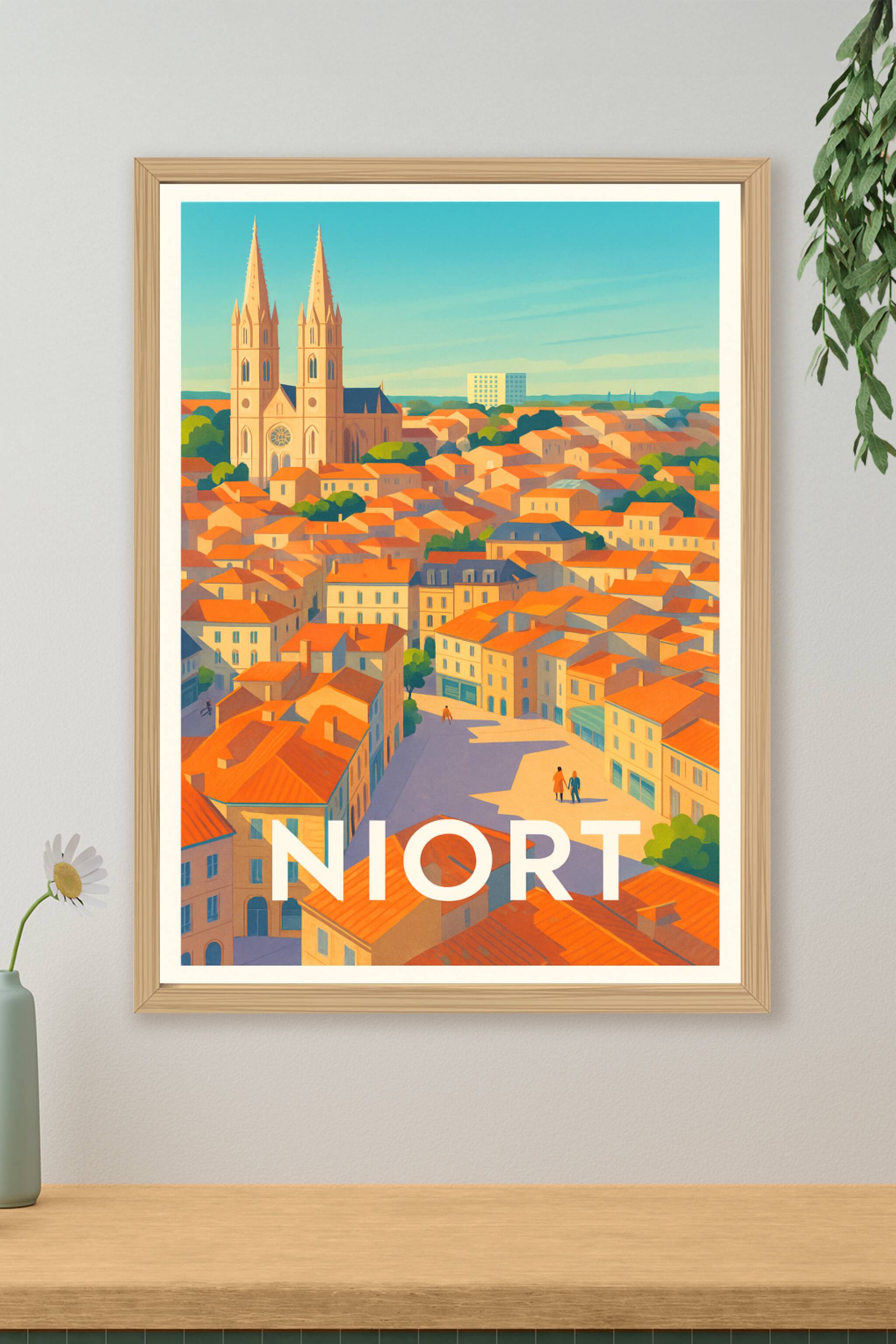 Découvrez Niort sous un nouveau jour avec ce poster illustré mettant en valeur ses maisons aux toits orange et la majestueuse église au centre de l...