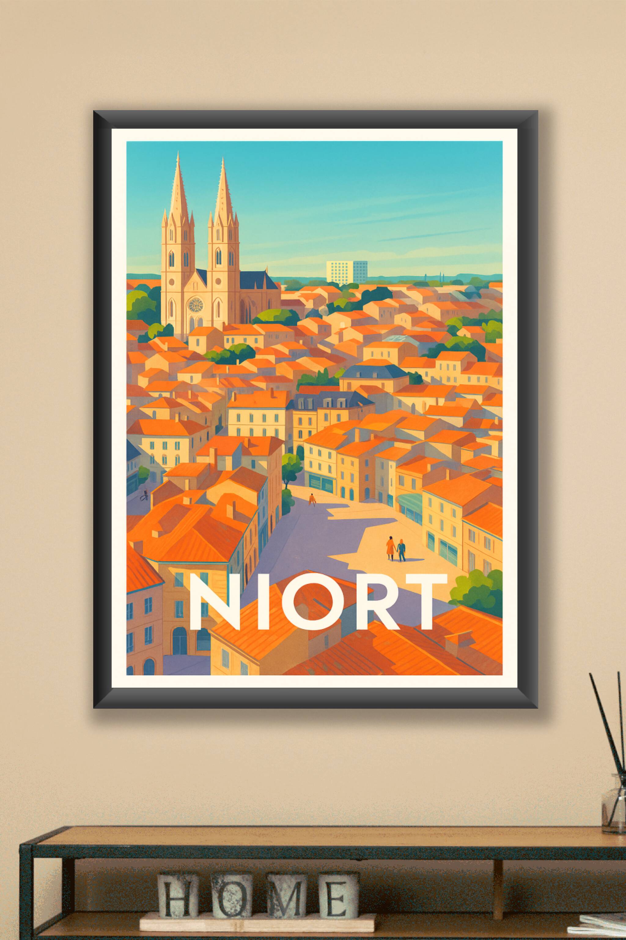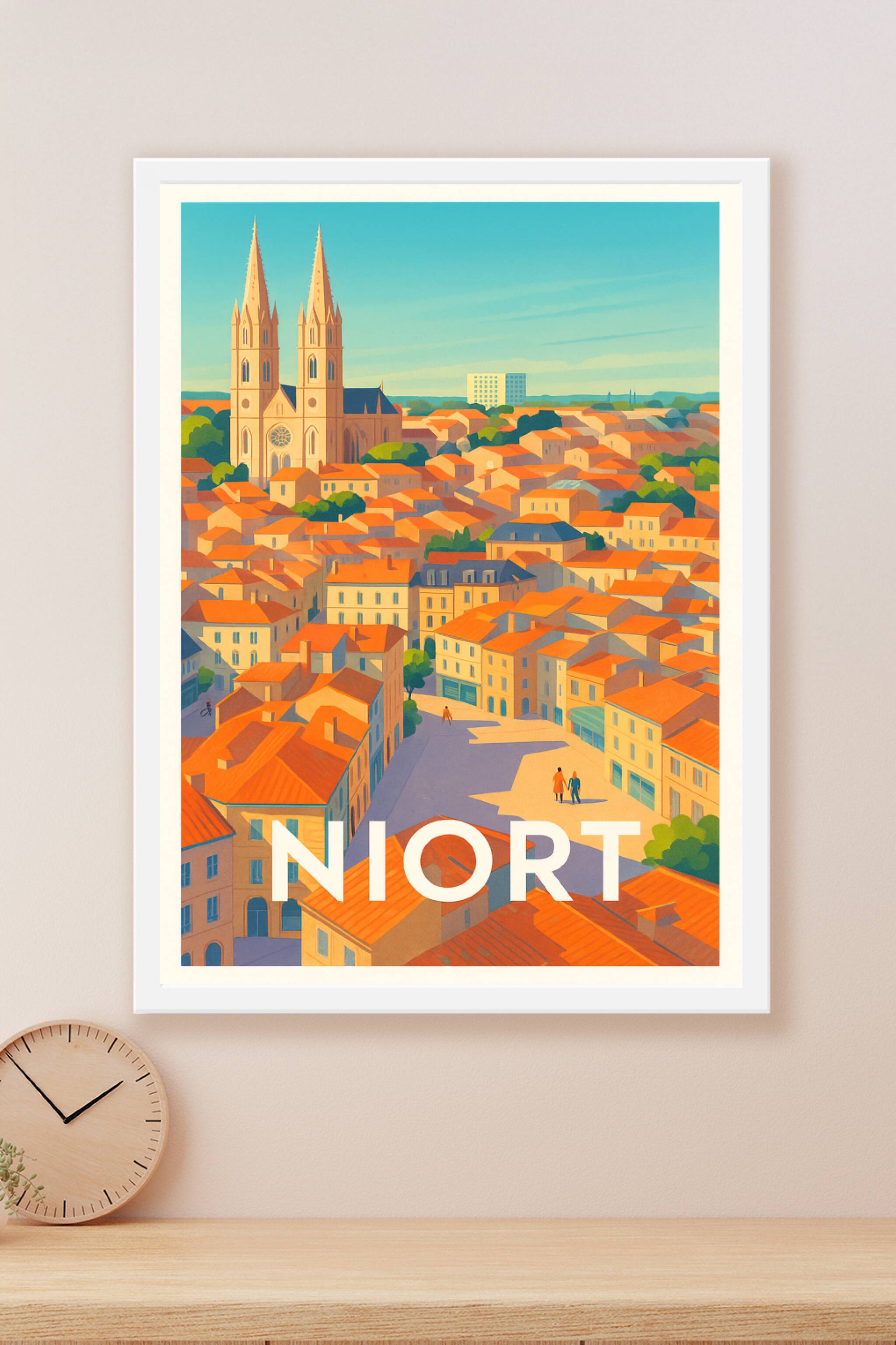 Découvrez Niort sous un nouveau jour avec ce poster illustré mettant en valeur ses maisons aux toits orange et la majestueuse église au centre de la ville. Cette affiche capture l'ambiance chaleureuse et lumineuse de ce lieu emblématique, idéale pour apporter une touche colorée et authentique à votre décoration. Imprimée en tirage "Fine Art" sur un papier 305g coton d'exception, cette affiche offre une qualité d'impression remarquable, fidèle aux détails et aux couleurs chatoyantes. Disponible en formats A1 à A4, avec ou sans cadre, elle s'adapte parfaitement à tous les espaces, que ce soit pour sublimer votre salon, bureau ou pour offrir un souvenir unique de Niort.