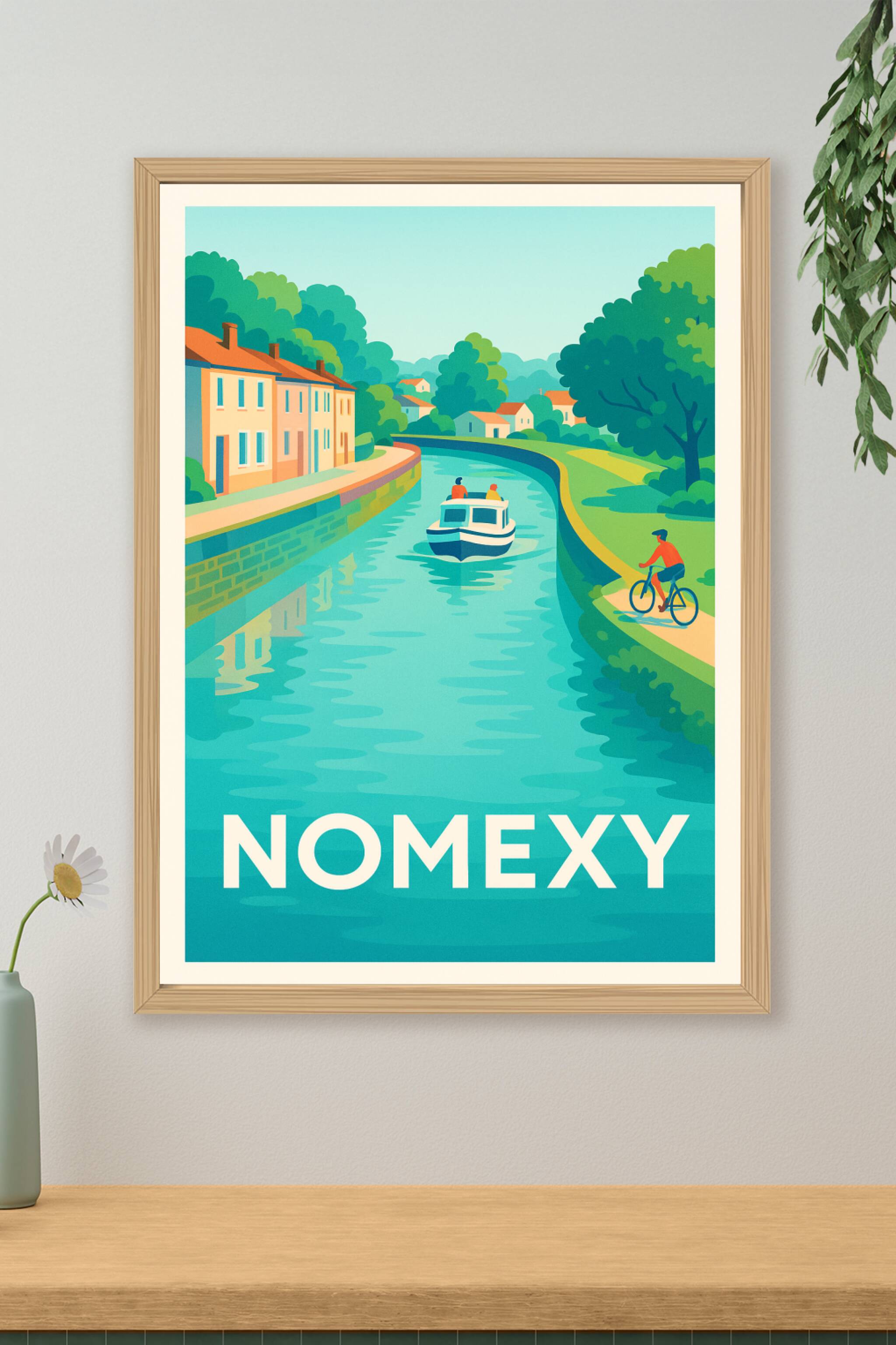 Découvrez l'atmosphère sereine de Nomexy avec ce poster illustré qui capture la douceur d'une promenade en bateau sur le canal bordé de maisons col...
