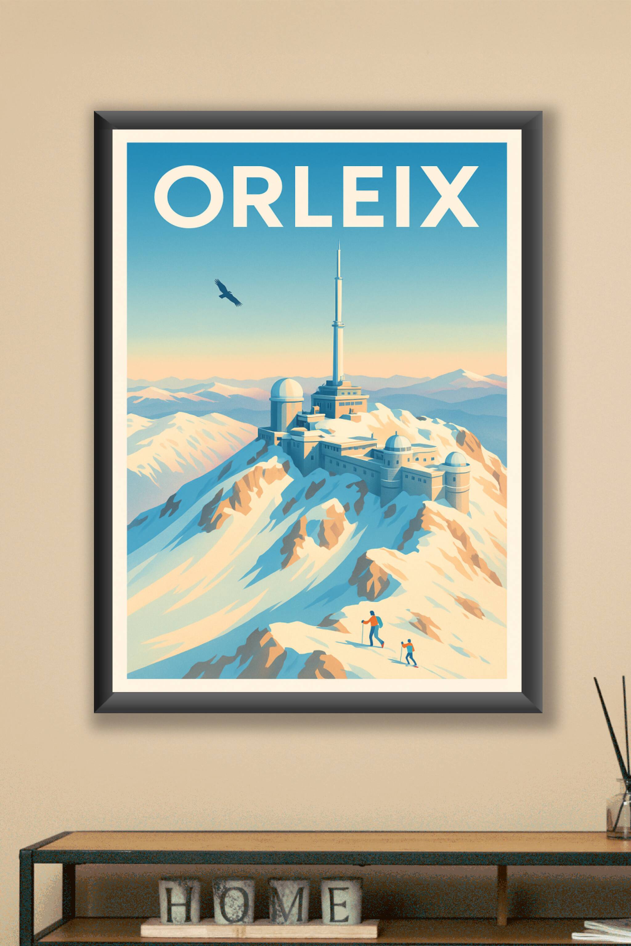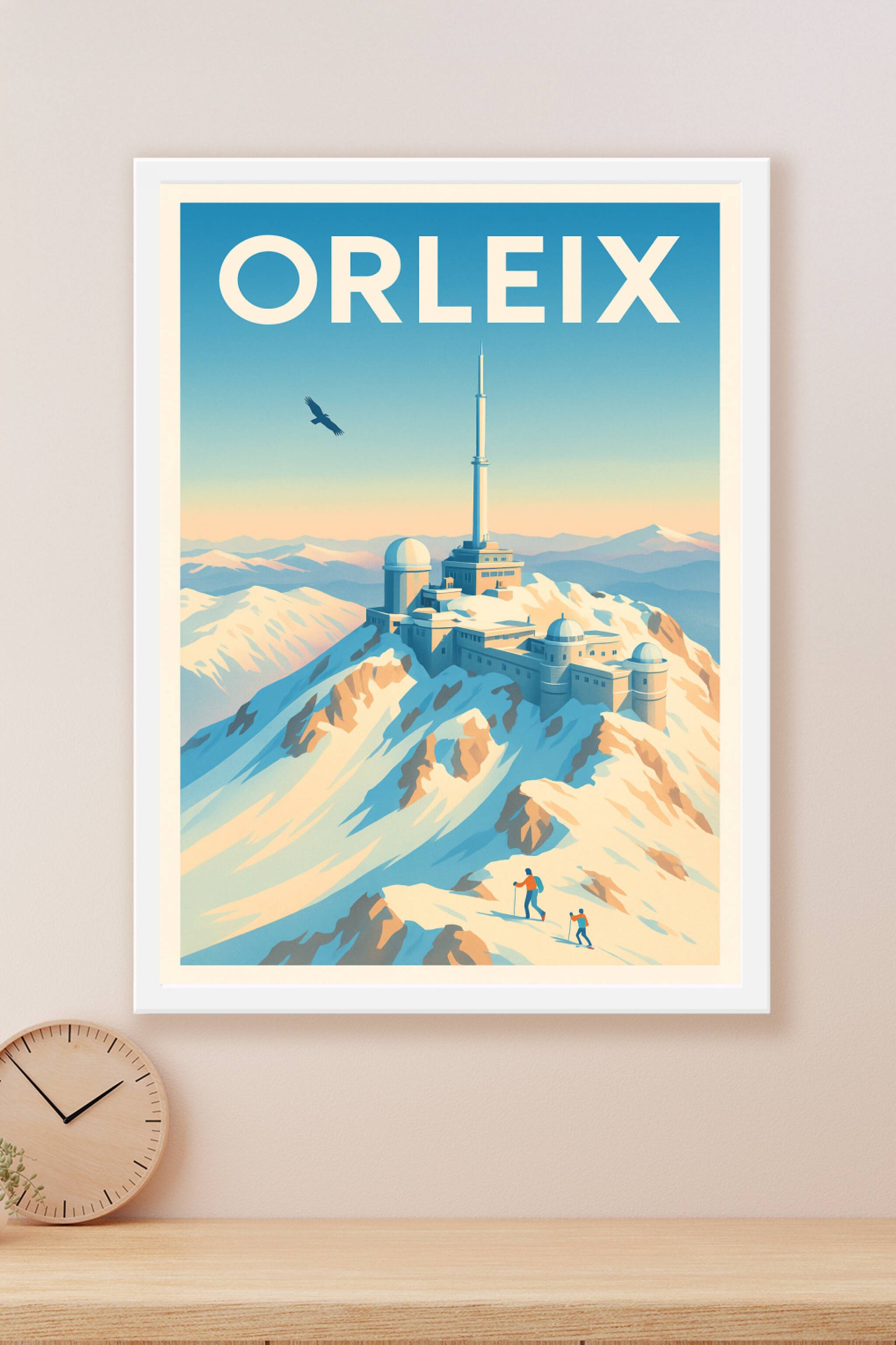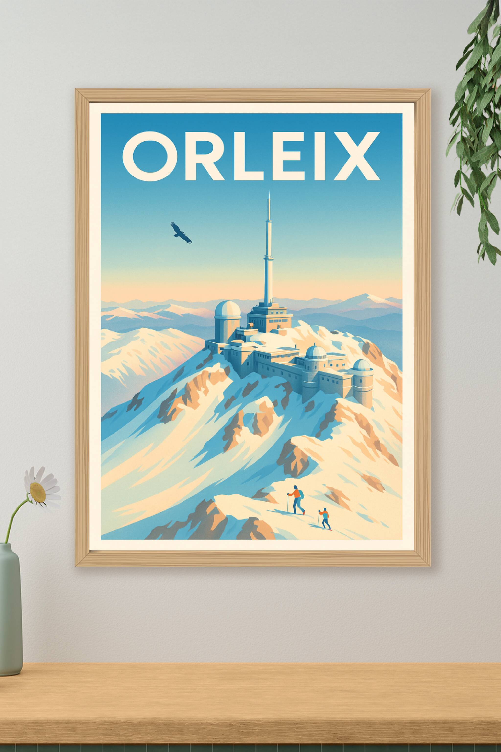 Découvrez la beauté majestueuse des montagnes enneigées d'Orleix avec cette affiche illustrée au style vintage. Représentant une station d'observat...