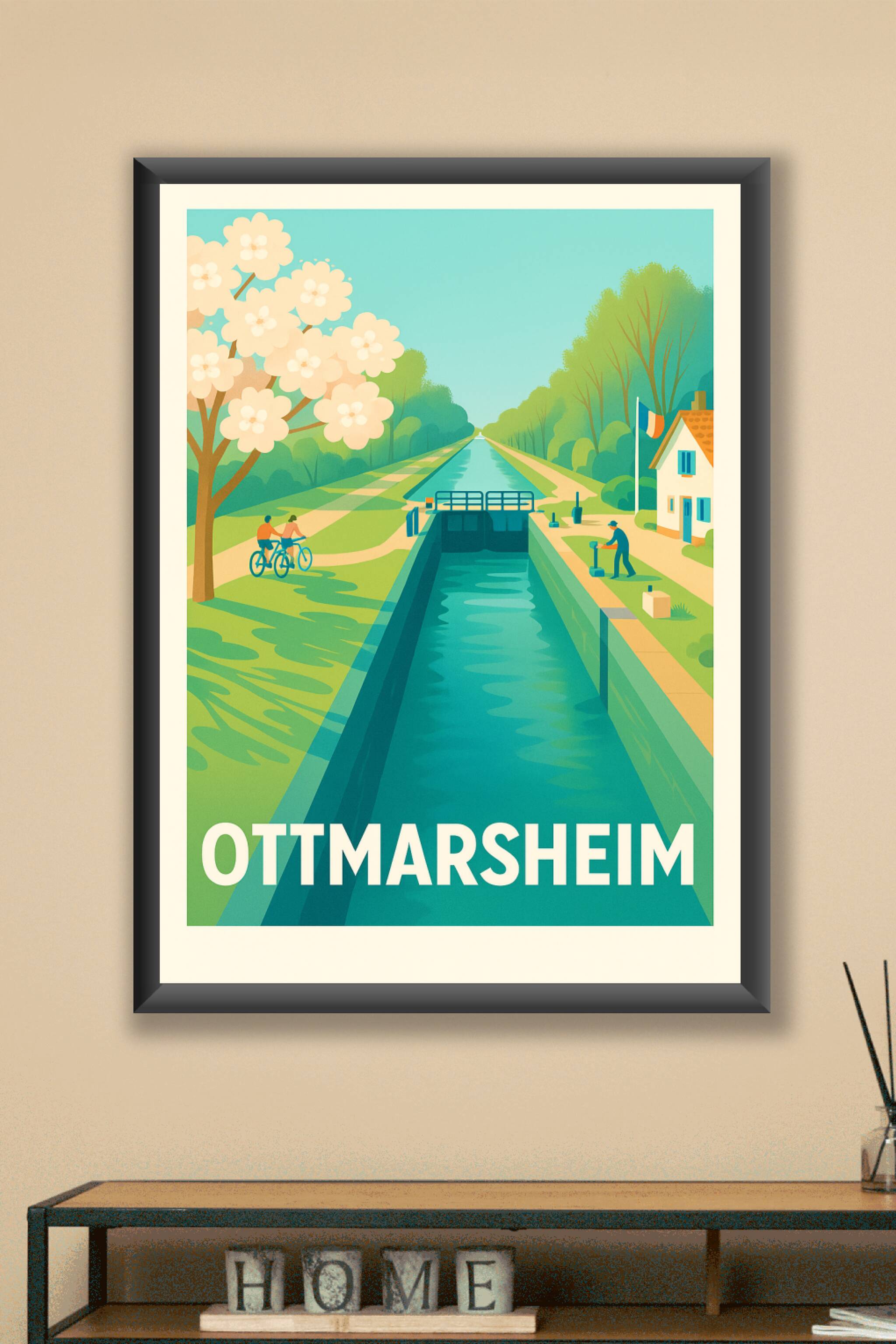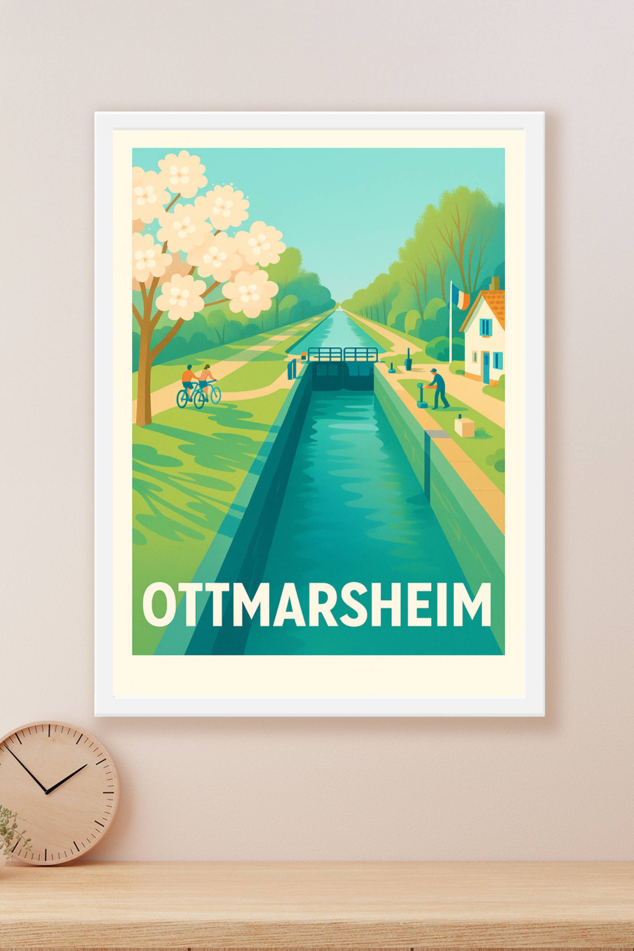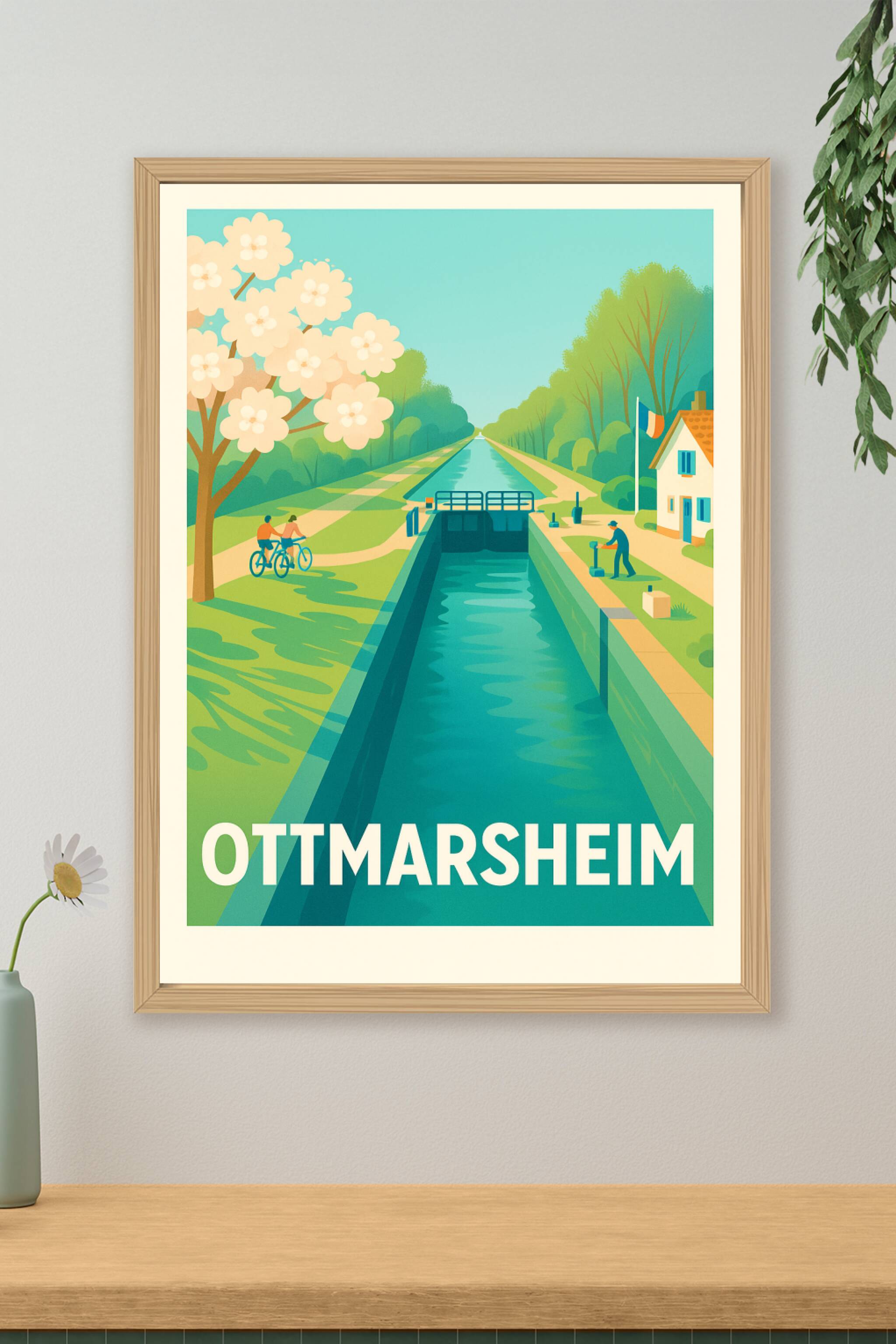 Découvrez la douceur et la tranquillité d'Ottmarsheim avec cette affiche illustrée représentant le canal bordé d'arbres en fleurs et d'une charmant...