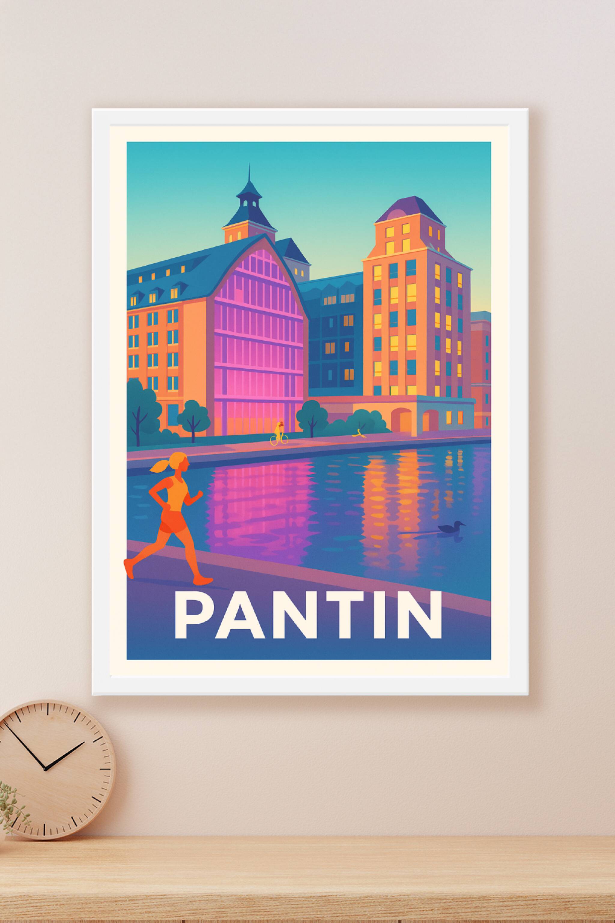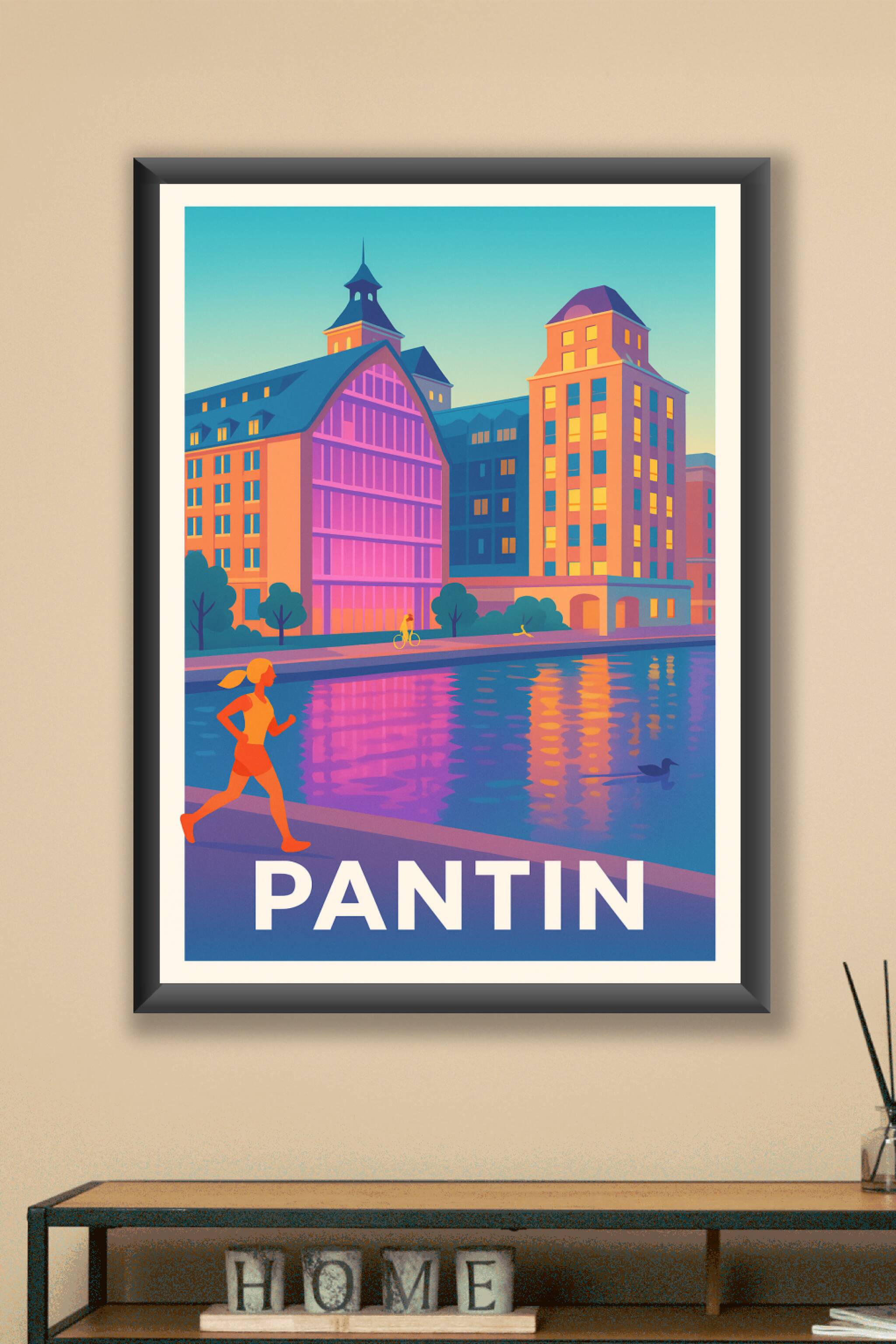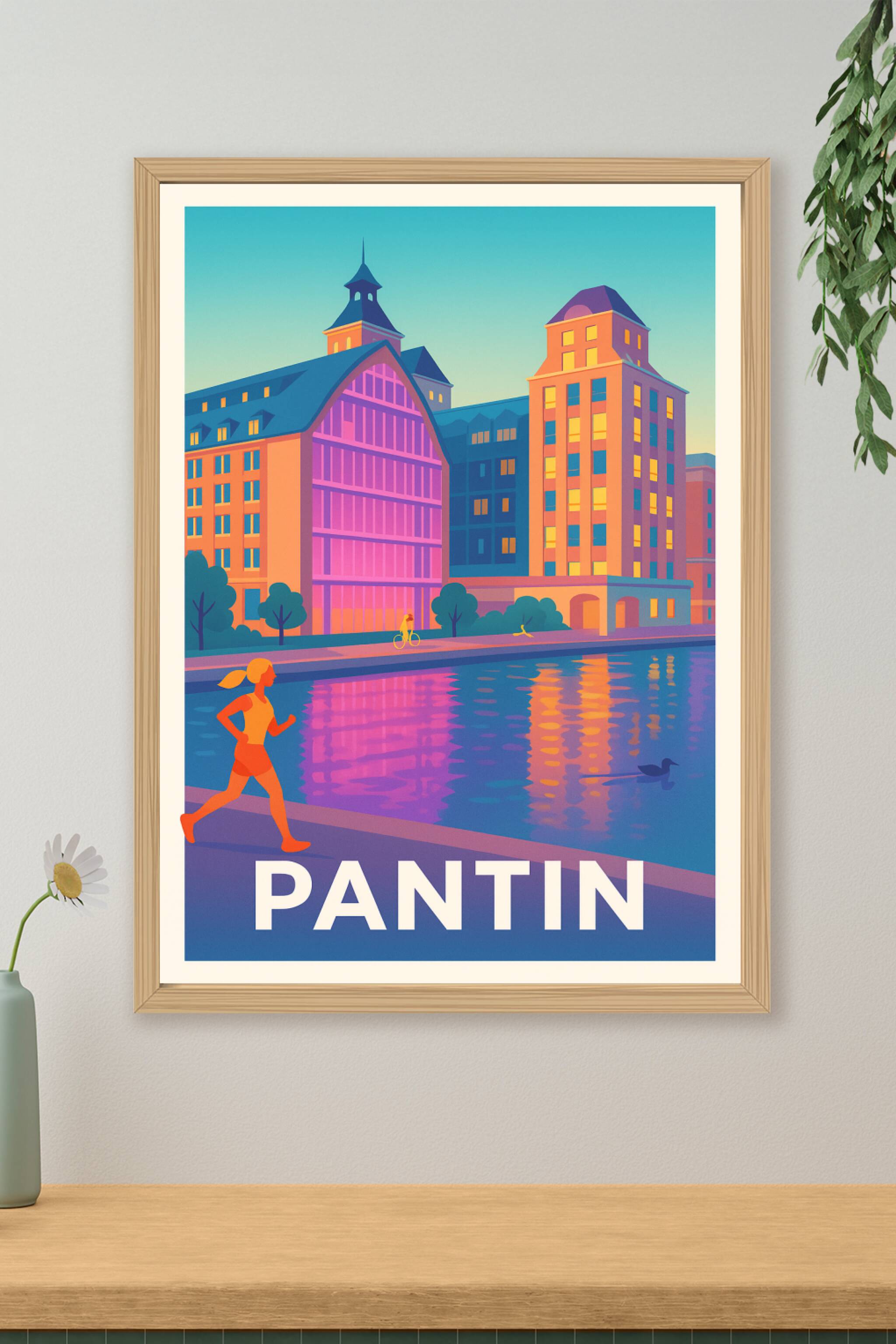 Découvrez le charme contemporain de Pantin avec cette affiche qui capture une scène paisible au bord du canal, baignée dans les teintes chaudes du ...