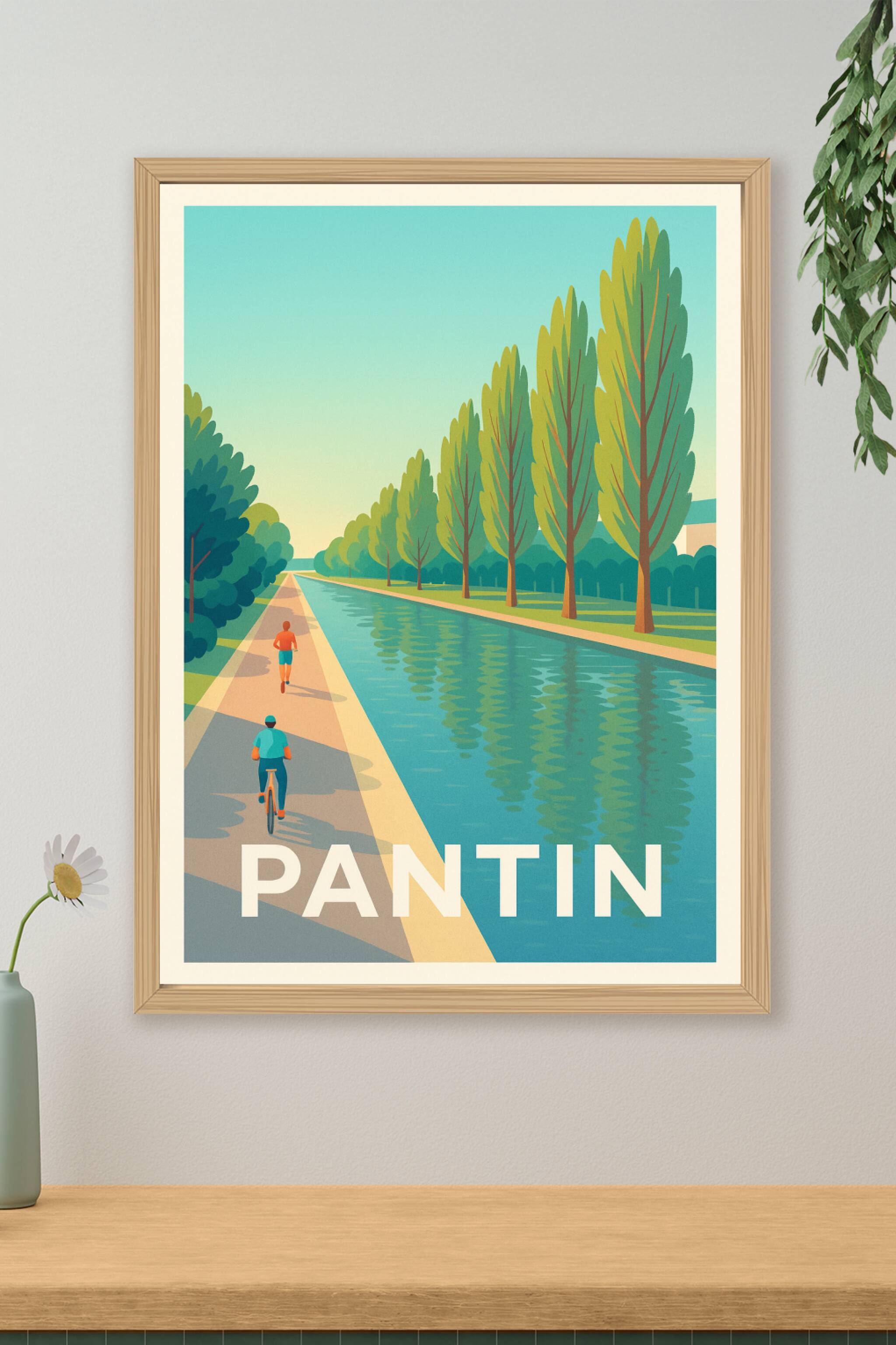 Découvrez la douceur de vivre à Pantin avec cette affiche illustrée mettant en scène une promenade paisible le long du canal bordé de grands arbres...