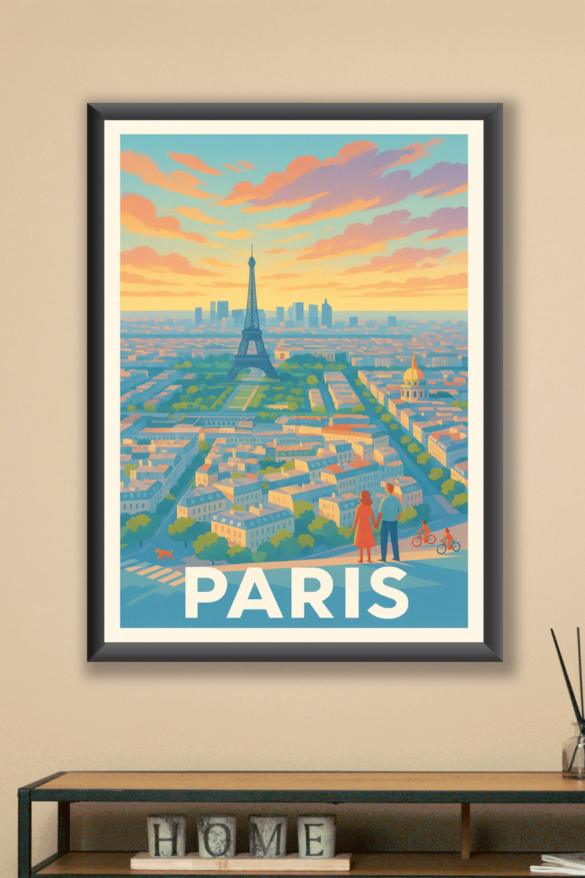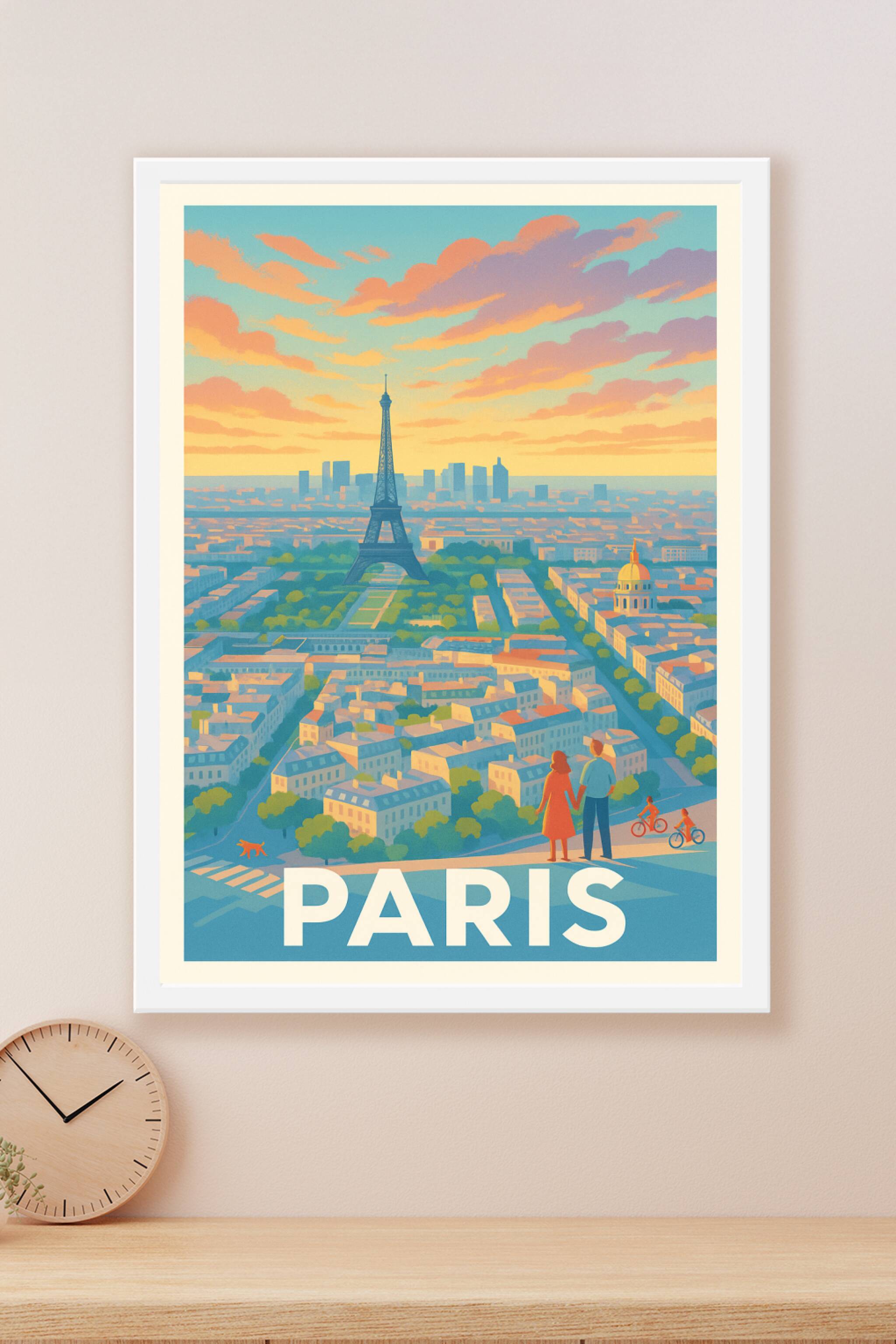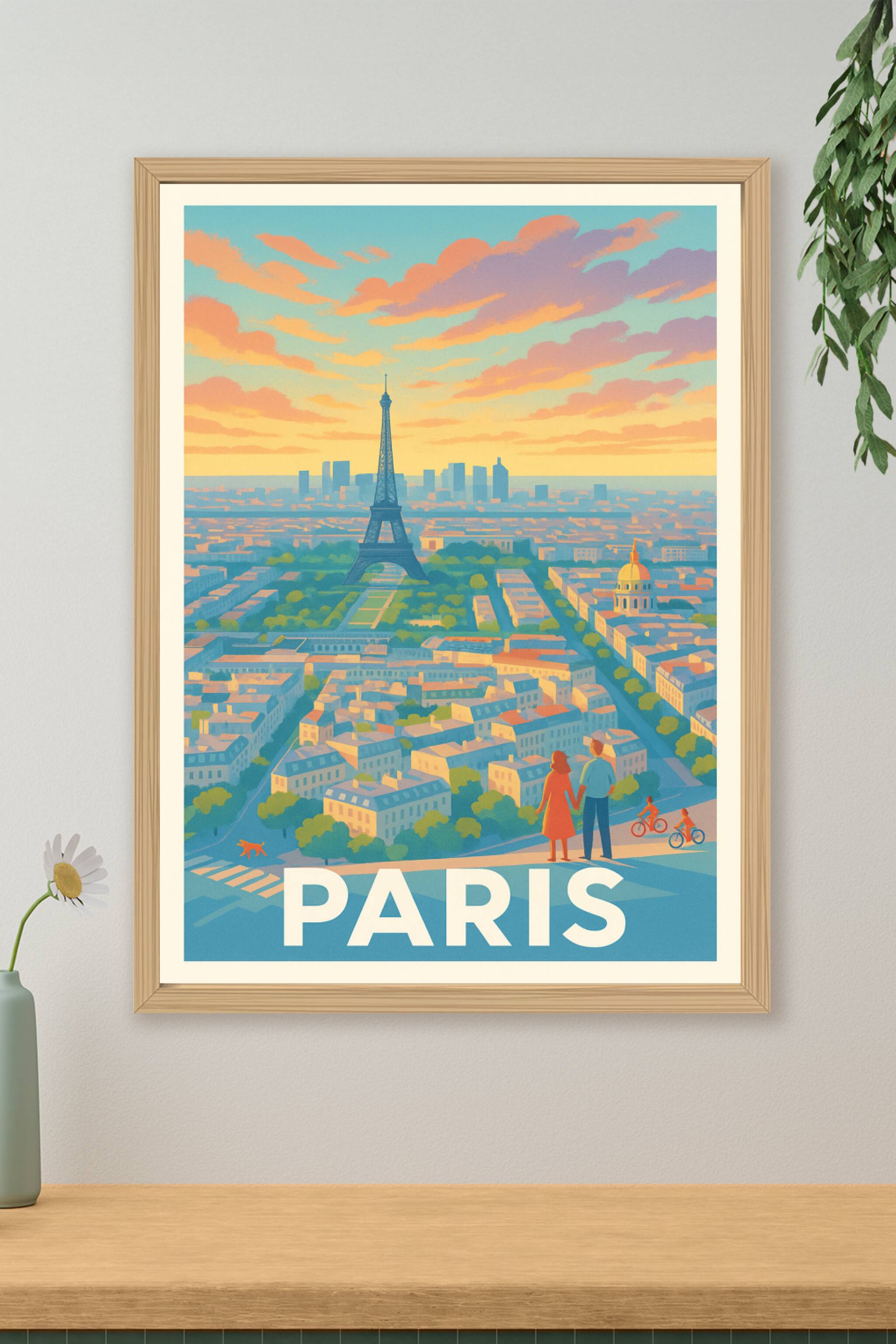 Découvrez la magie de Paris avec ce poster élégant au style néo-rétro. La Tour Eiffel se dresse majestueusement au centre, tandis qu'un couple contemple la vue panoramique baignée de lumière dorée. Entre la silhouette moderne de La Défense et les ruelles charmantes, cette affiche capture l'essence même de la Ville Lumière.