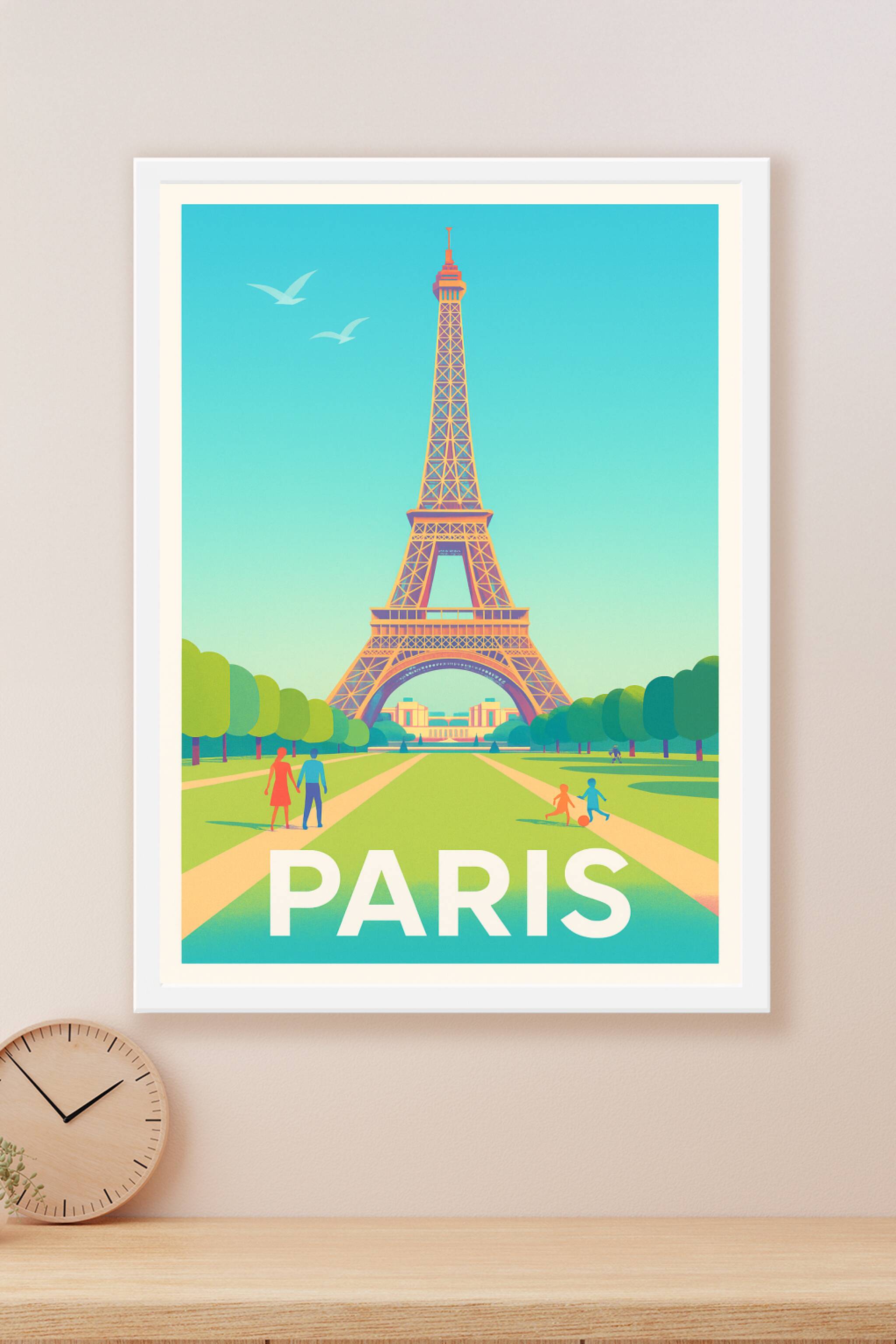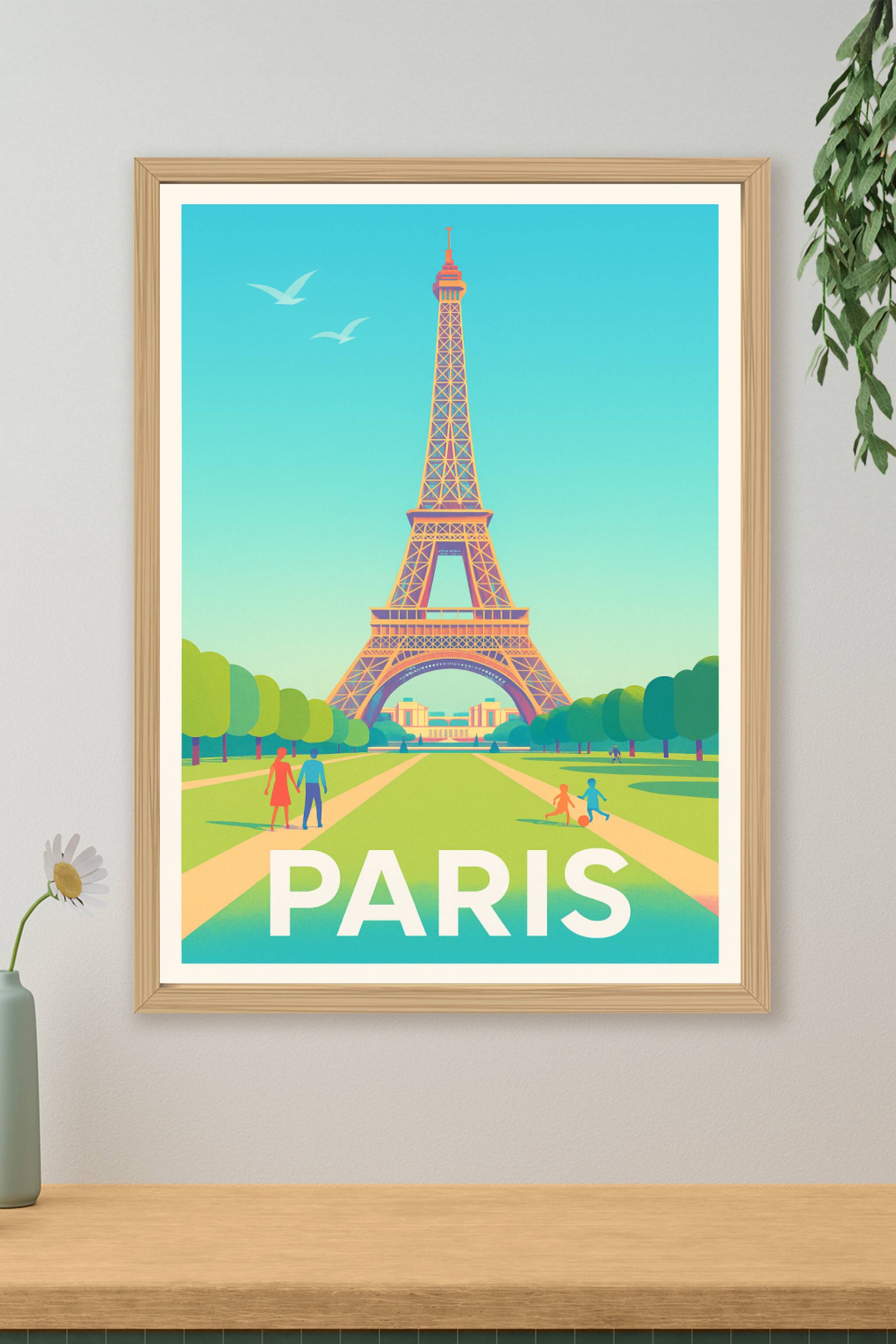 Apportez une touche de charme parisien à votre intérieur avec ce superbe poster néo-rétro illustrant la majestueuse Tour Eiffel sous un ciel bleu é...