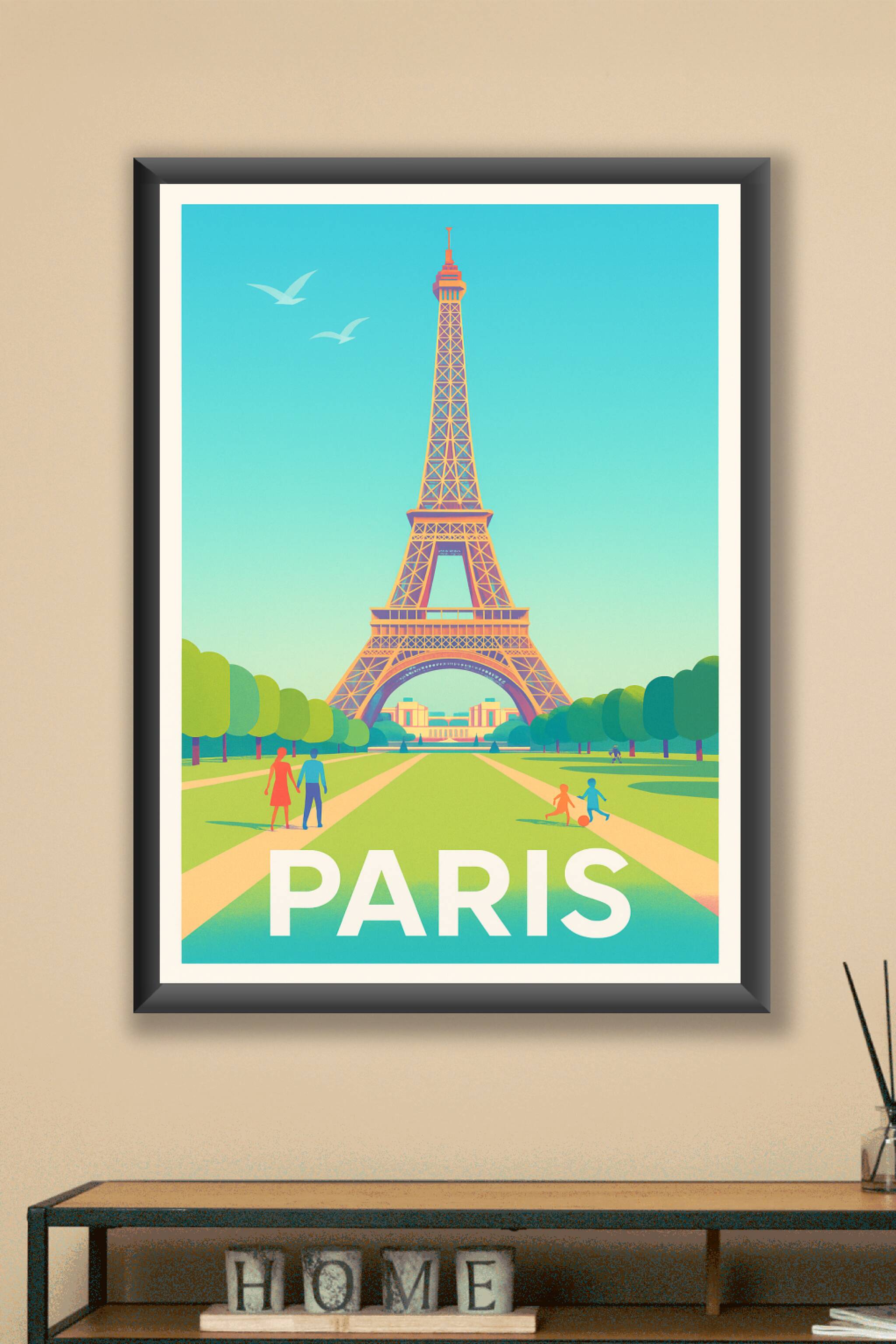 Apportez une touche de charme parisien à votre intérieur avec ce superbe poster néo-rétro illustrant la majestueuse Tour Eiffel sous un ciel bleu éclatant. Entourée de jardins verdoyants et de promeneurs, cette affiche capture l'essence même de Paris.