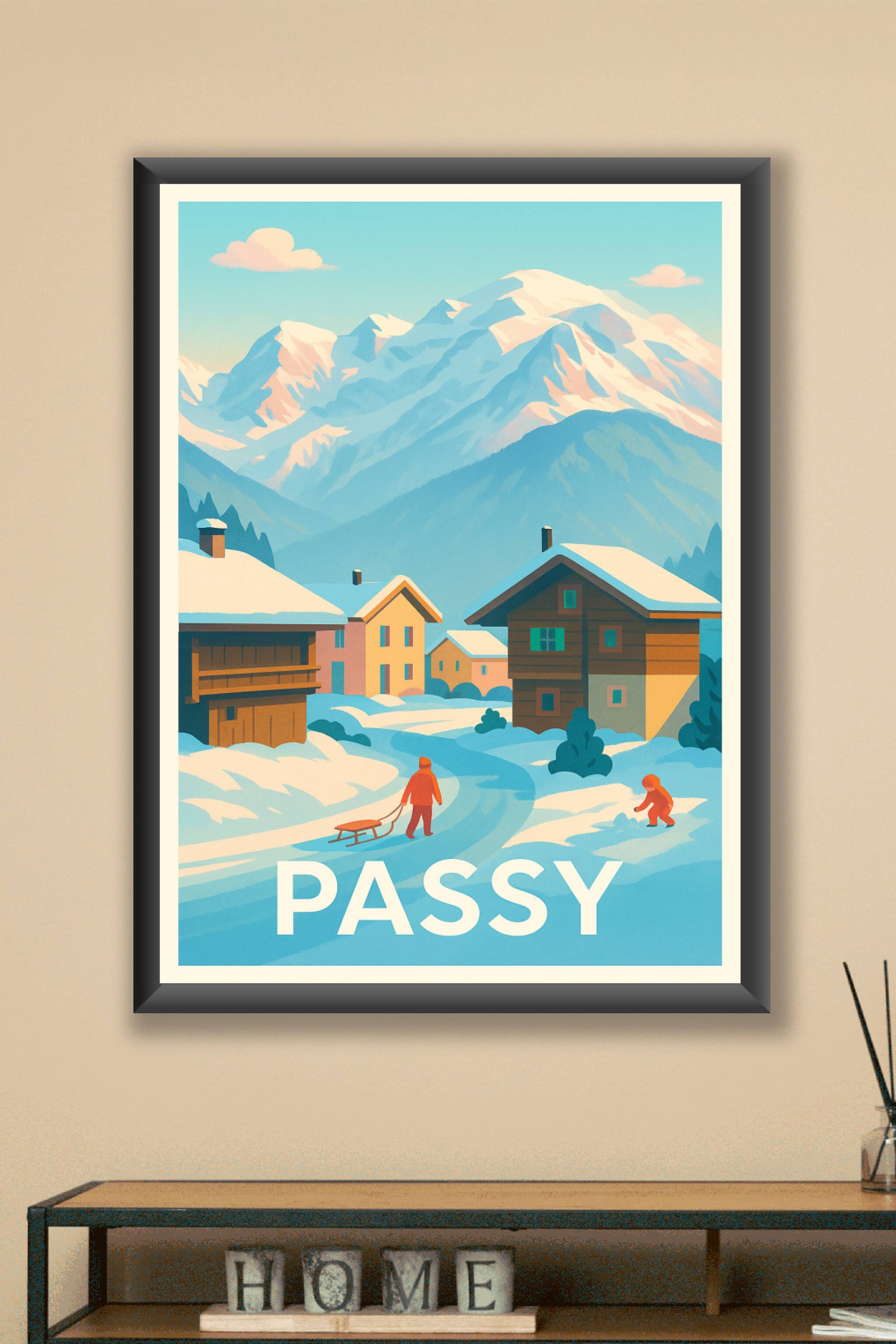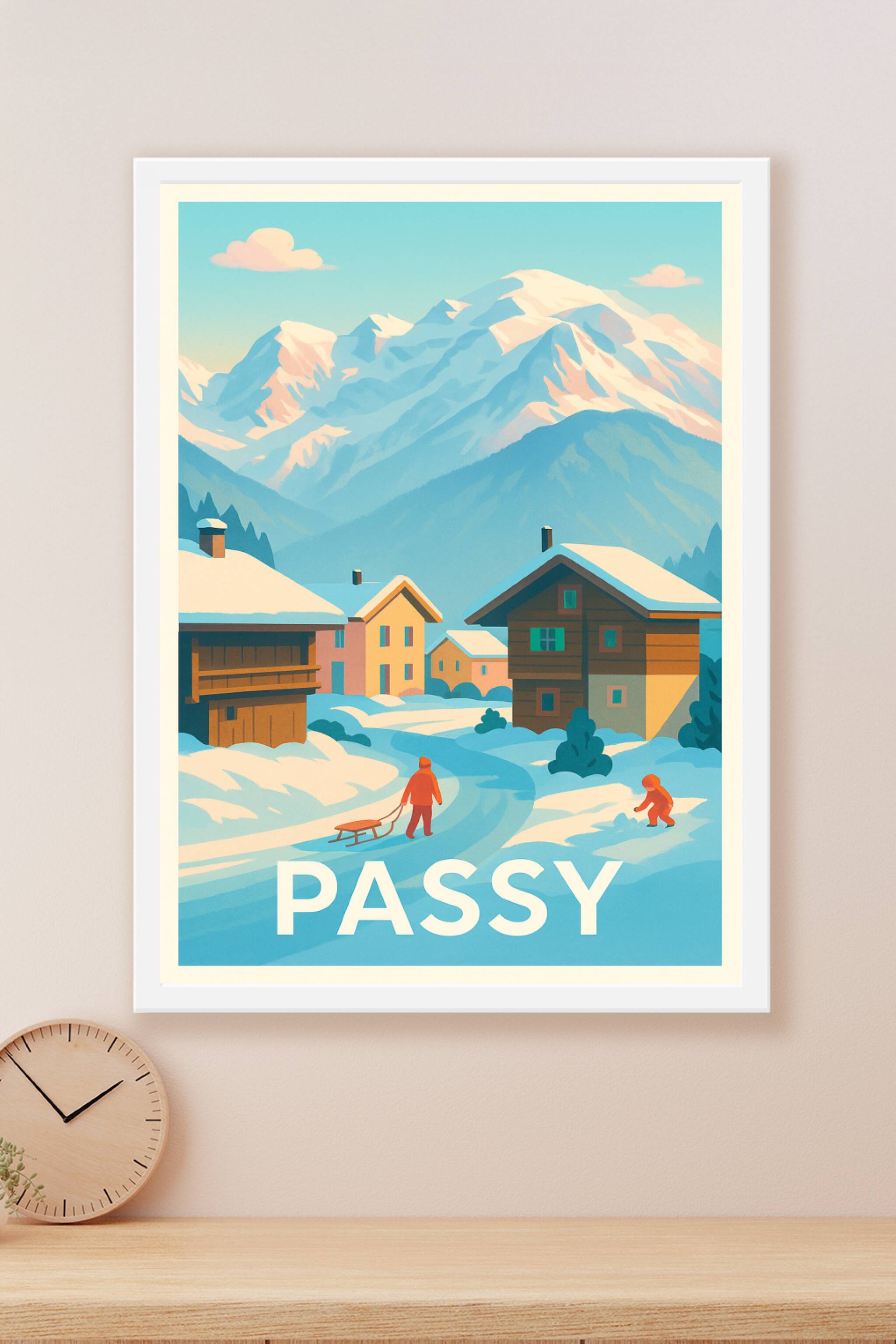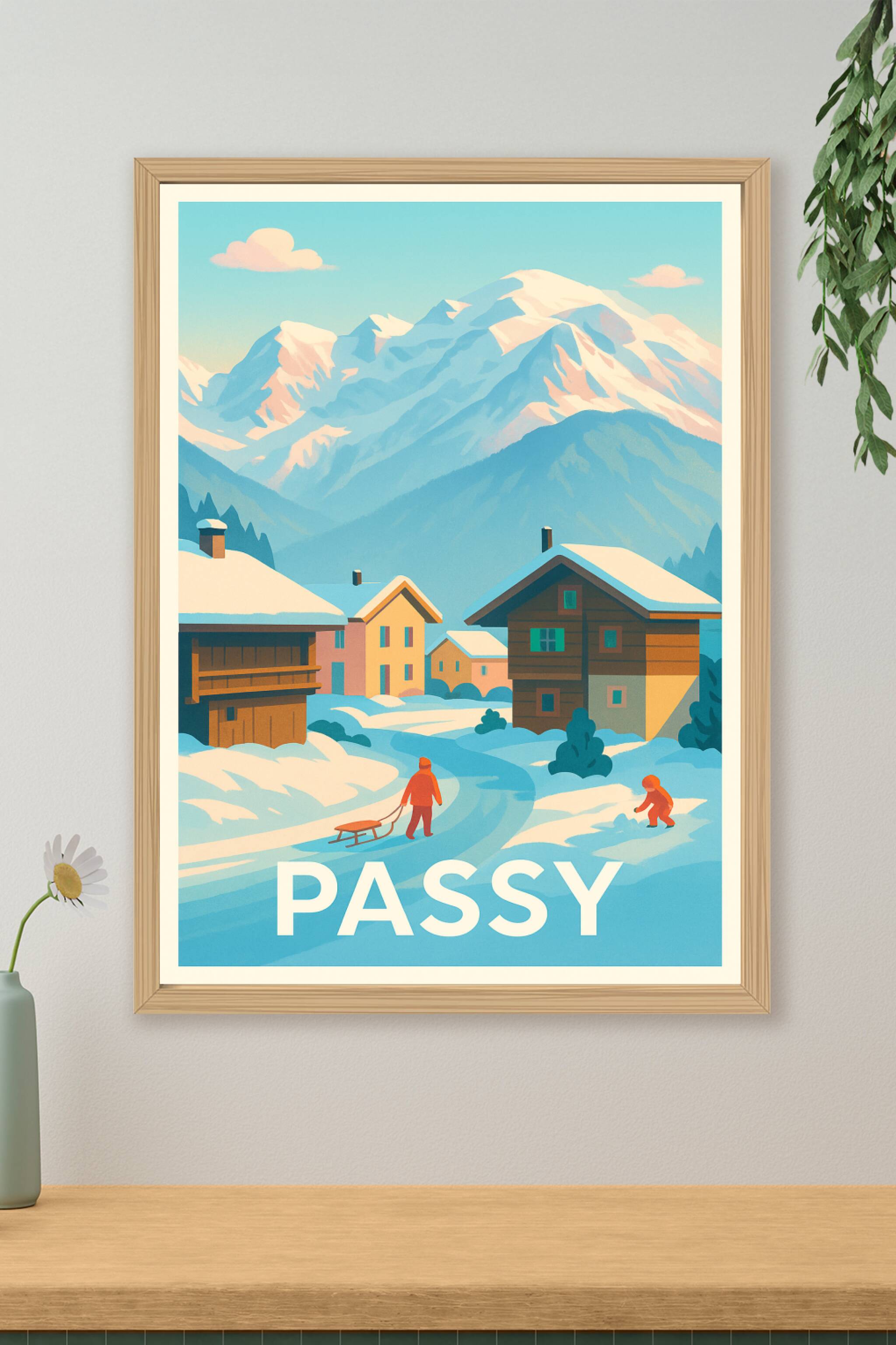 Découvrez toute la magie de l'hiver à Passy avec cette superbe affiche illustrée représentant un village paisible sous la neige, dominé par les maj...
