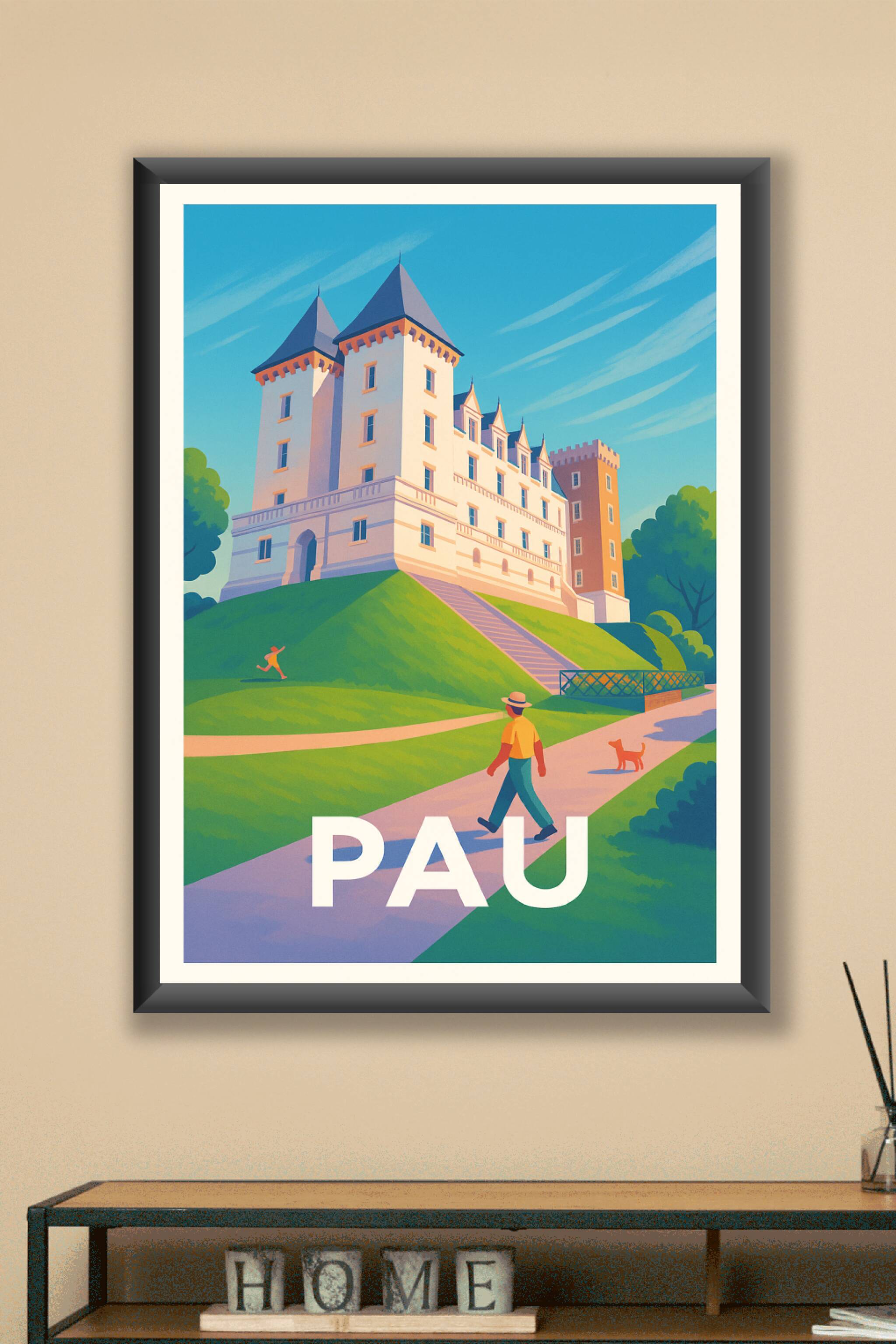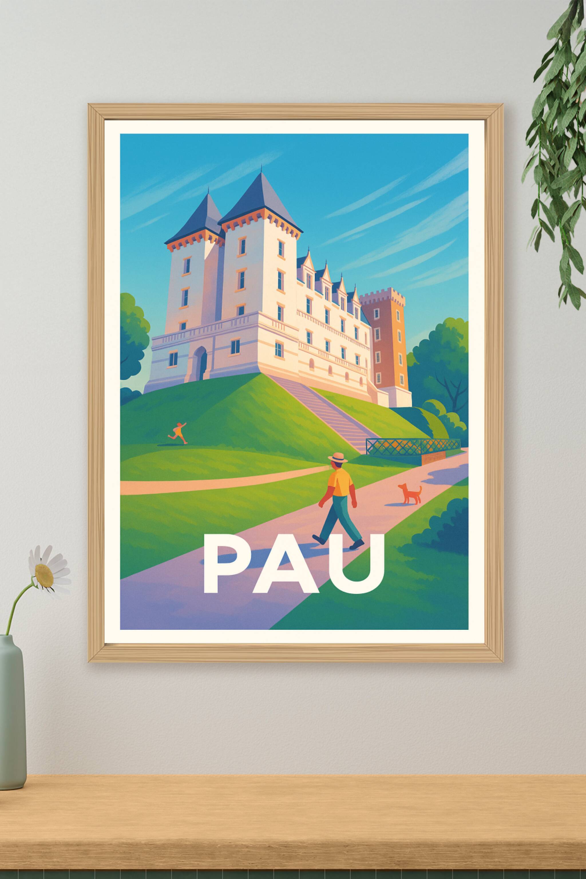 Découvrez l'élégance historique de Pau avec cette affiche illustrée mettant en scène le célèbre Château de Pau sous un ciel azur. Ce poster délicatement coloré capture la douceur de vivre et le charme architectural de la ville, idéale pour apporter une touche raffinée à votre décoration intérieure. Imprimée en tirage Fine Art sur papier 305g coton, cette affiche garantit une qualité d'impression exceptionnelle et une longue tenue des couleurs. Disponible du format A1 au format A4, avec ou sans cadre, cette œuvre s'adapte parfaitement à tous les espaces. Apportez une note culturelle et lumineuse à votre intérieur ou offrez un souvenir unique et sophistiqué de Pau.
