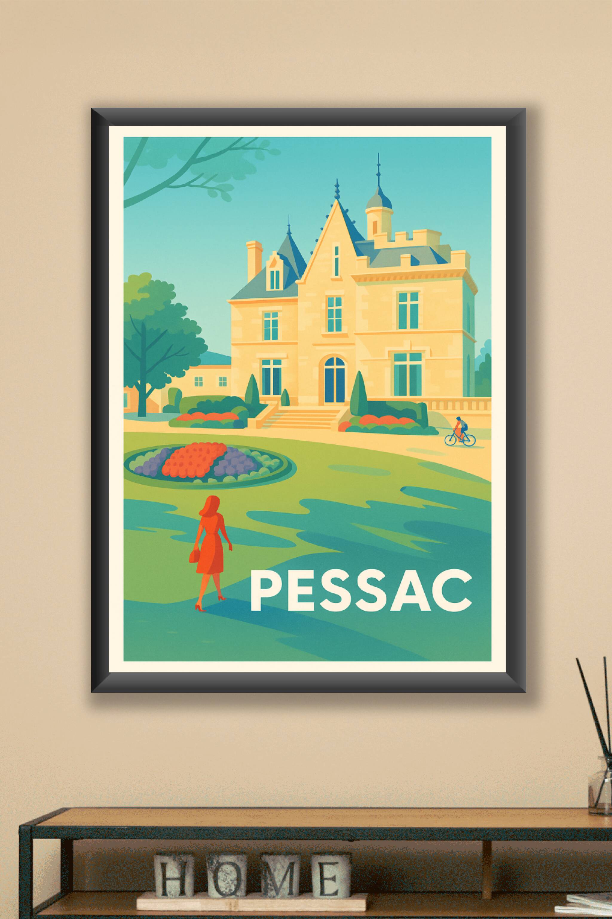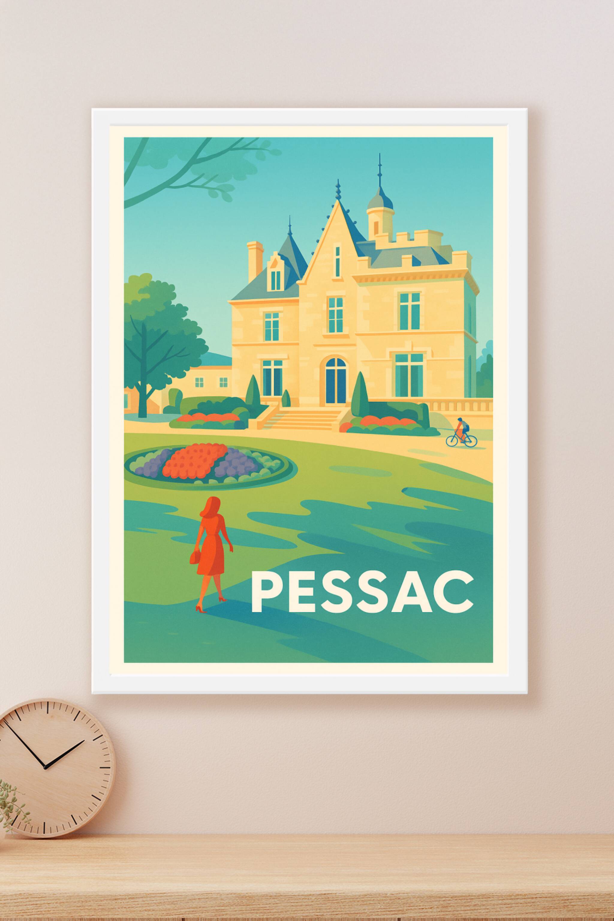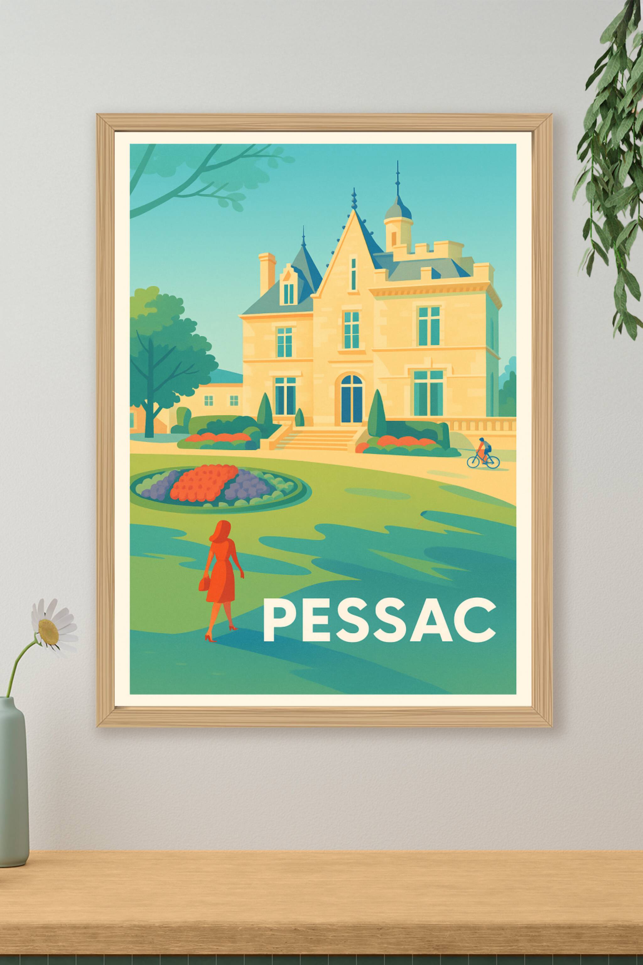 Découvrez la beauté intemporelle de Pessac à travers cette affiche au style vintage et coloré, mettant en lumière une demeure élégante et son jardi...