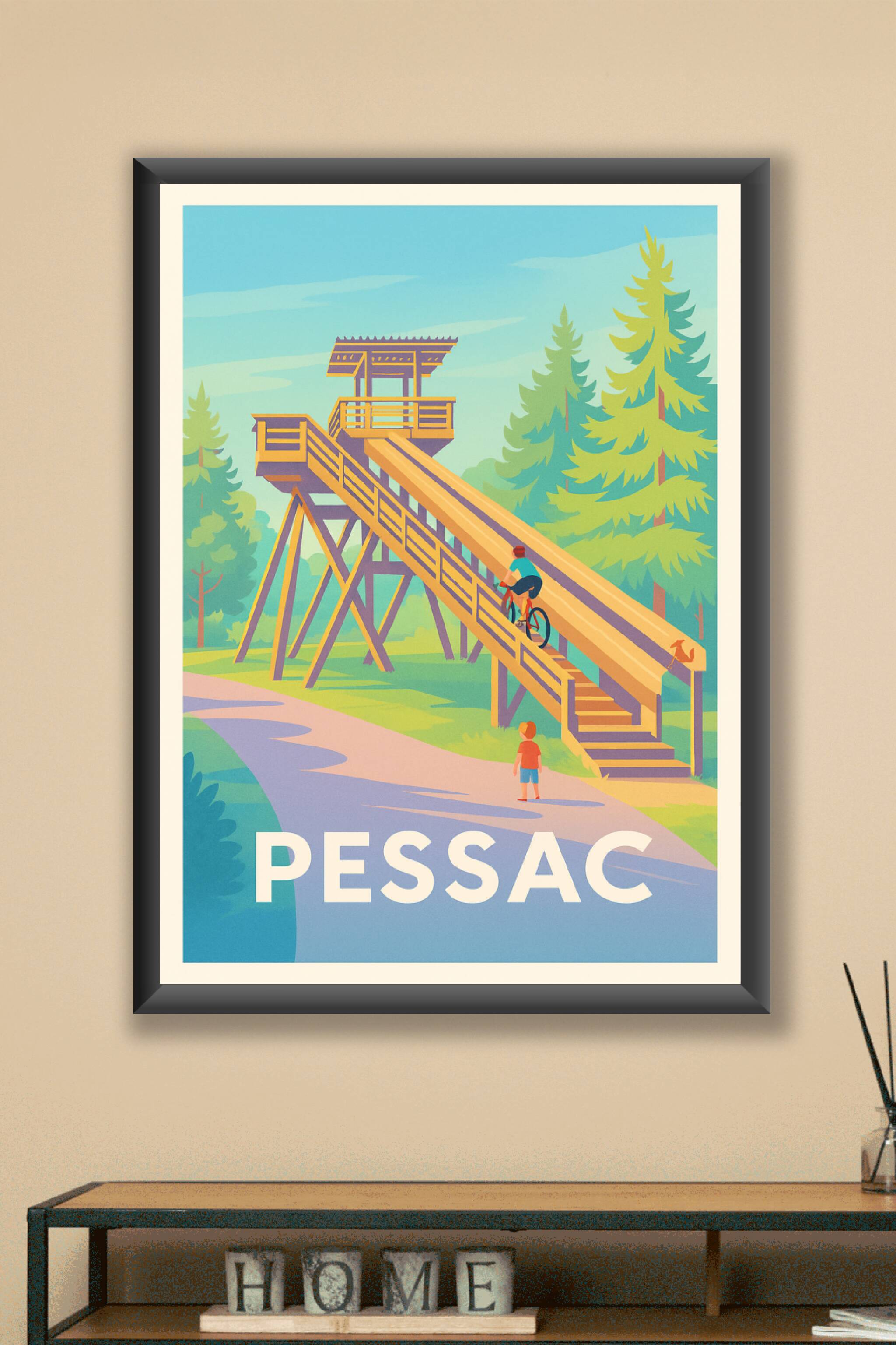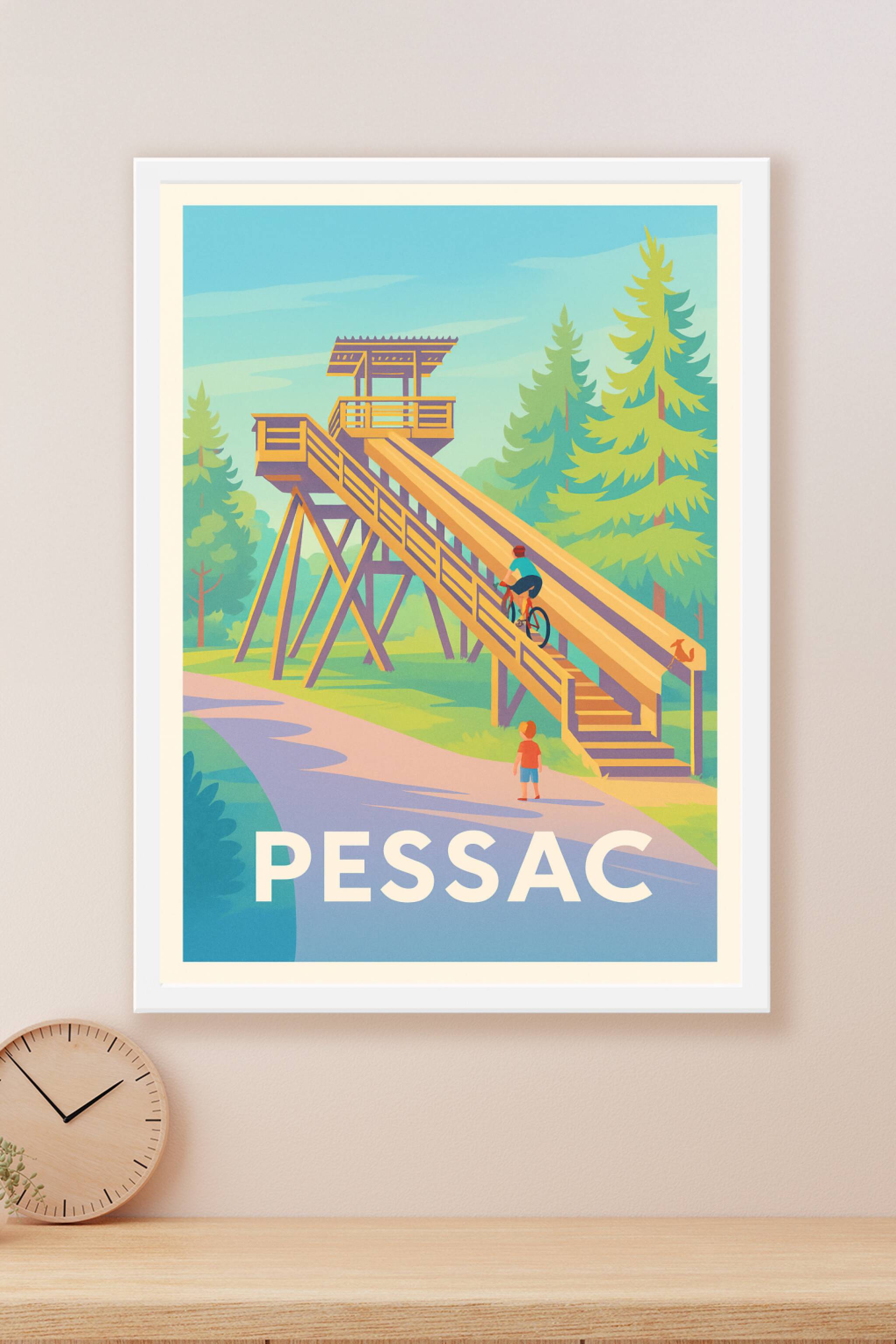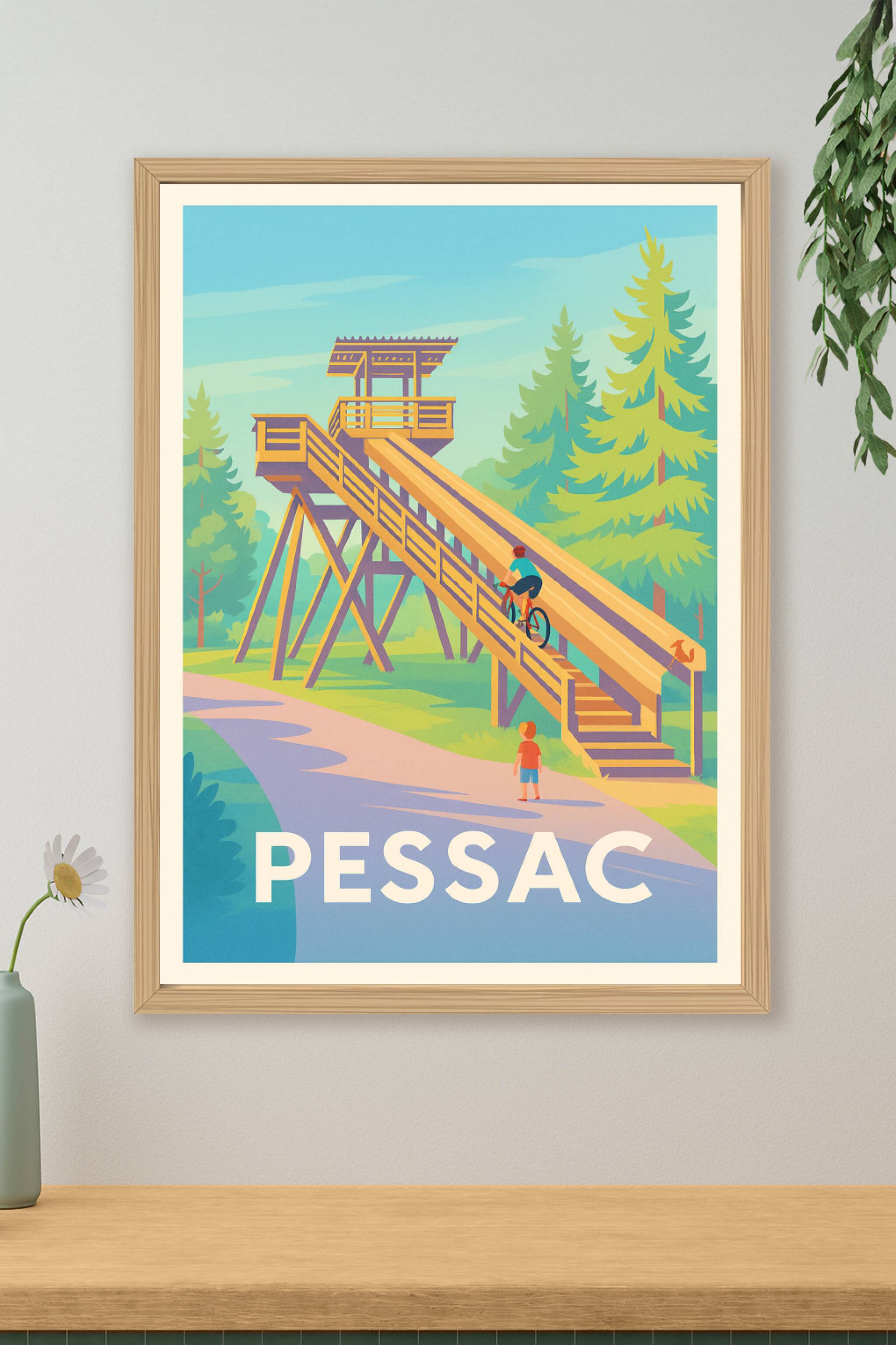 Découvrez l'esprit nature et sportif de Pessac avec cette affiche illustrée mettant en scène un paysage boisée et une structure en bois idéale pour...