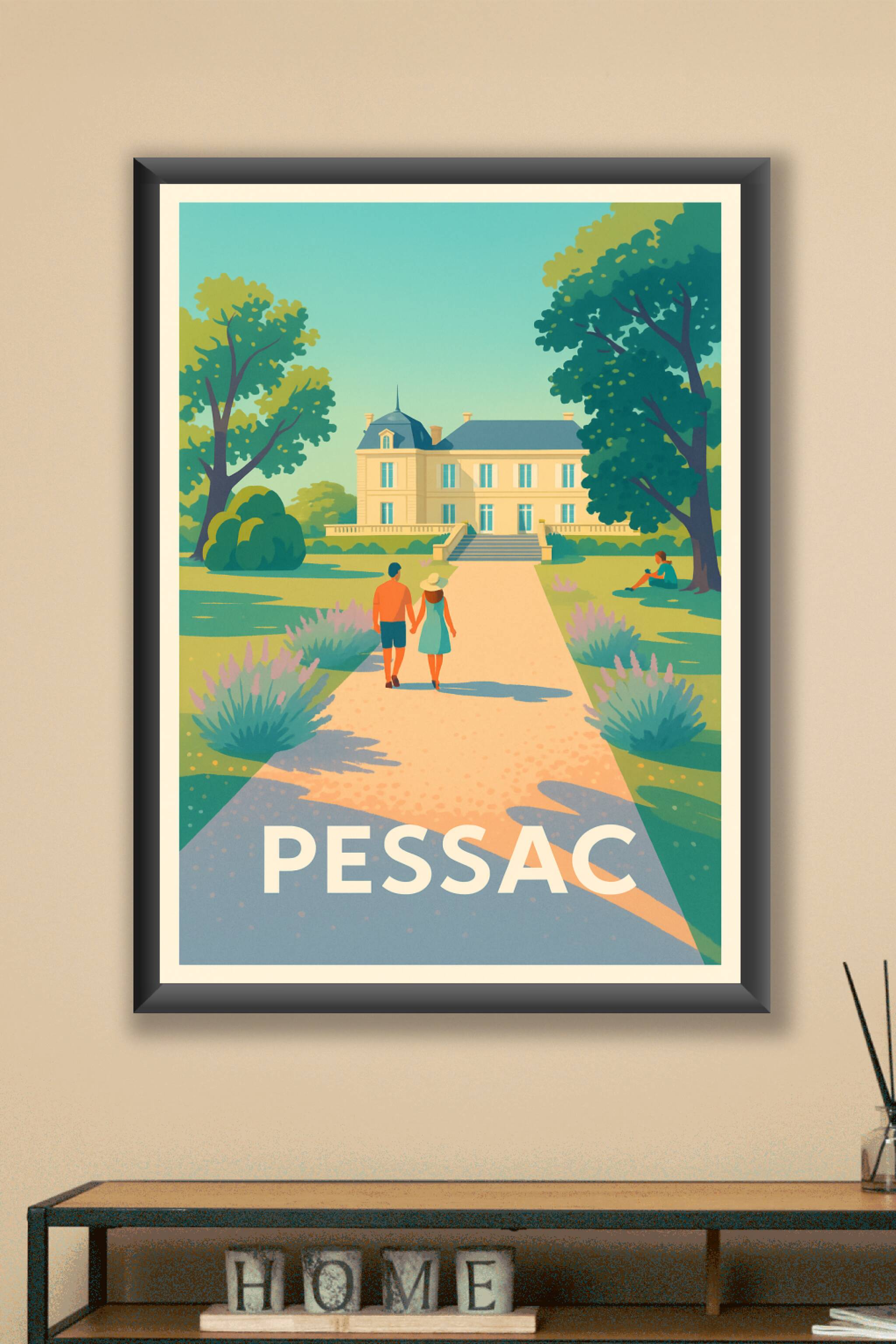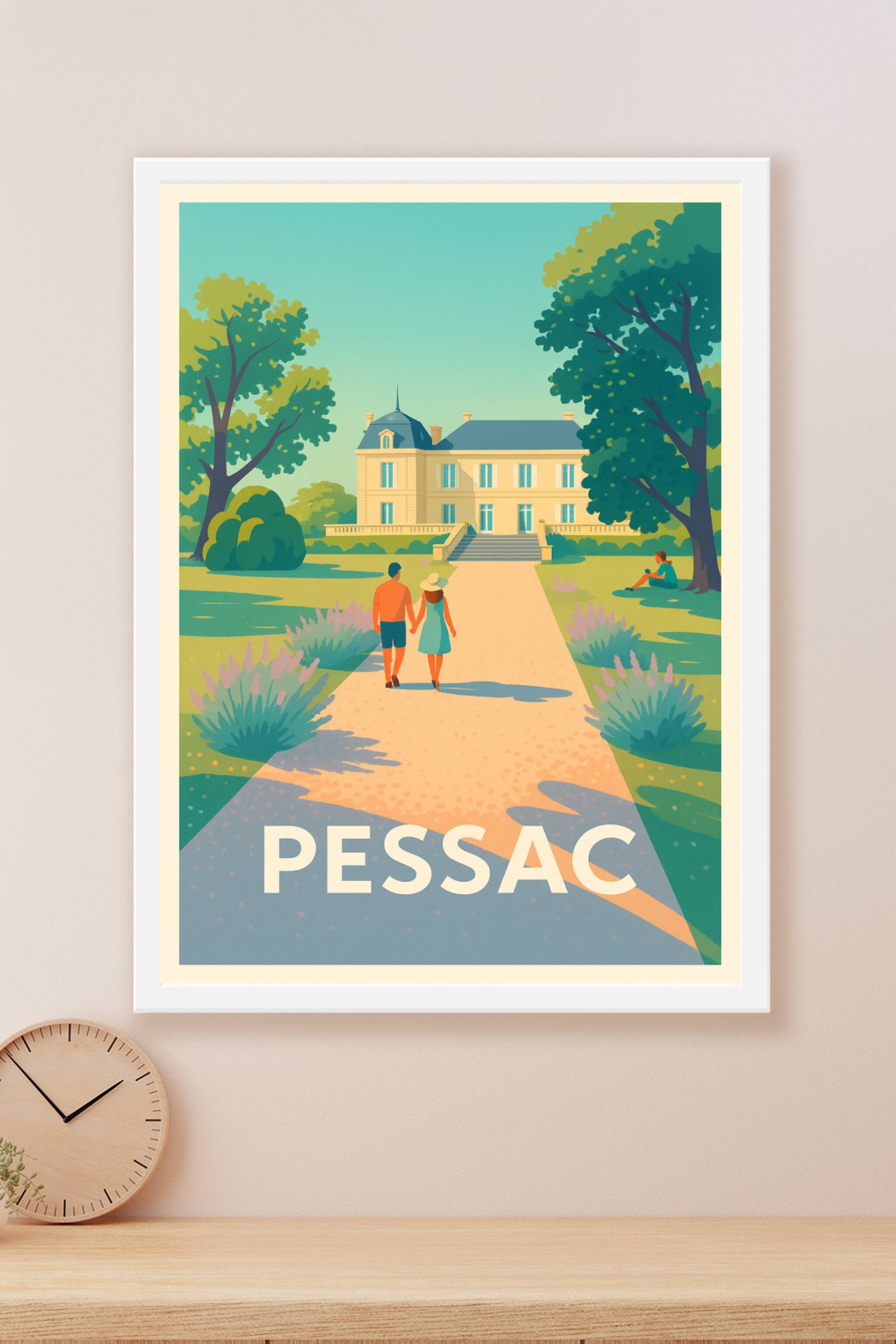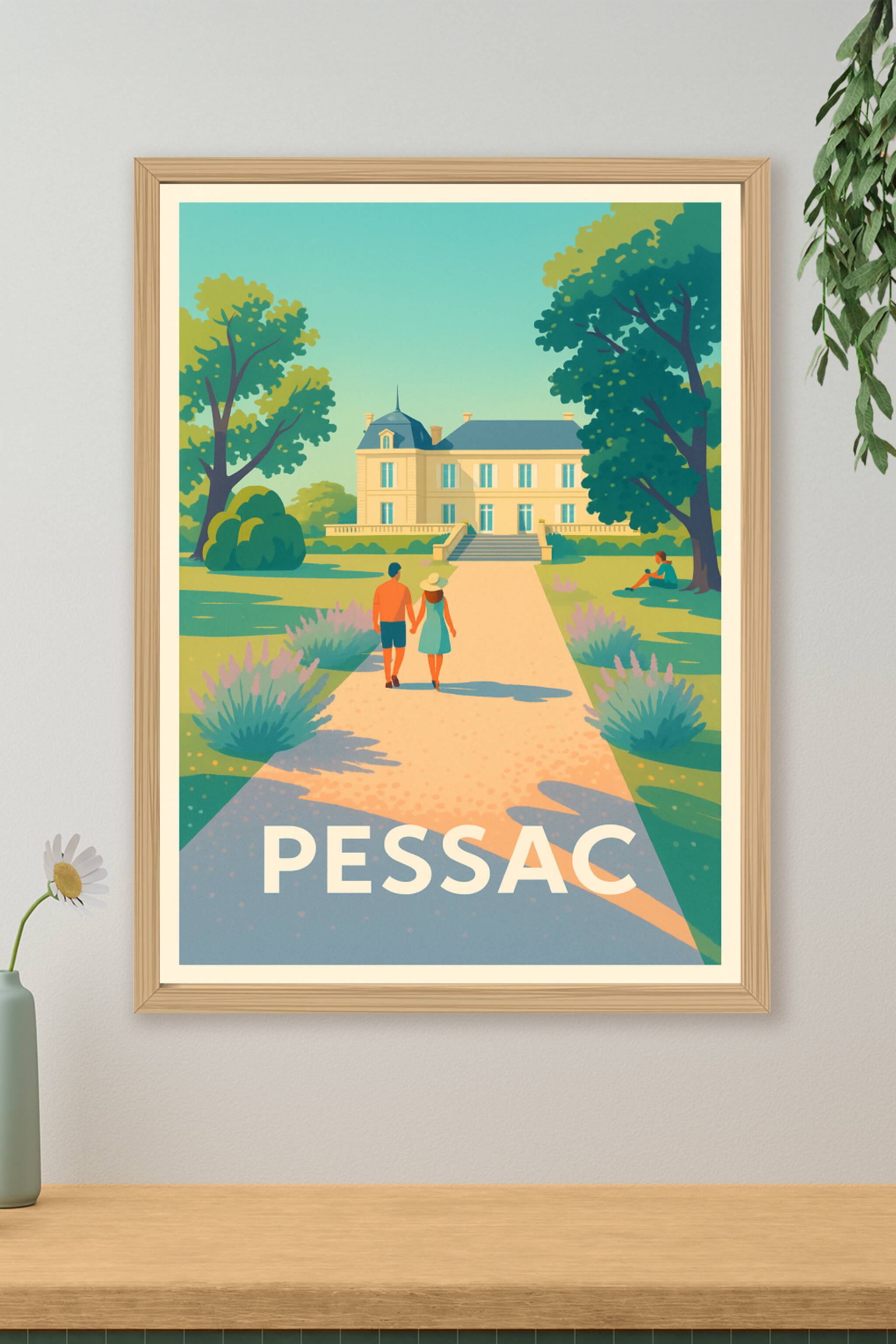 Découvrez l'élégance et la sérénité de Pessac à travers cette affiche illustrée, mettant en scène une promenade romantique vers un magnifique châte...