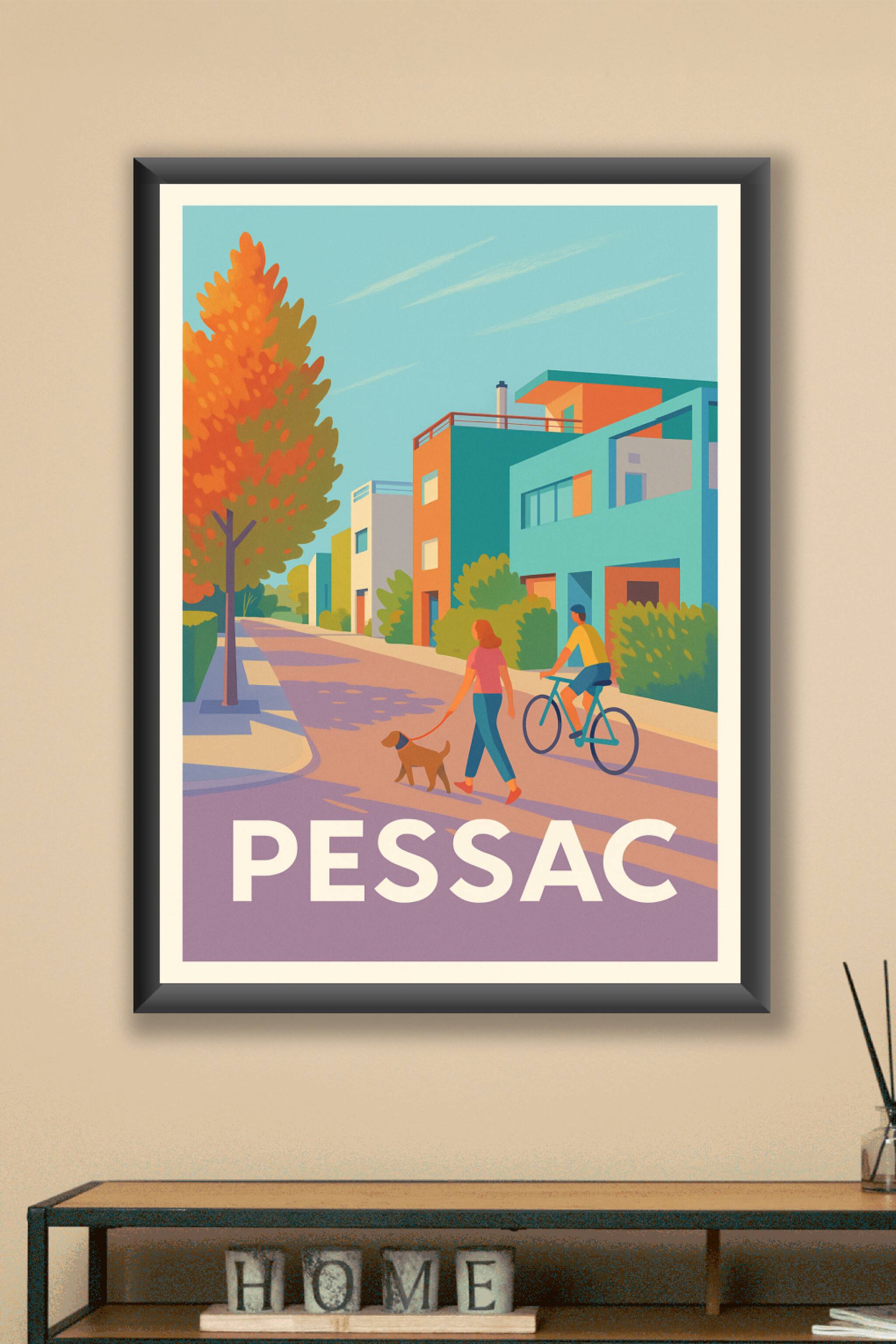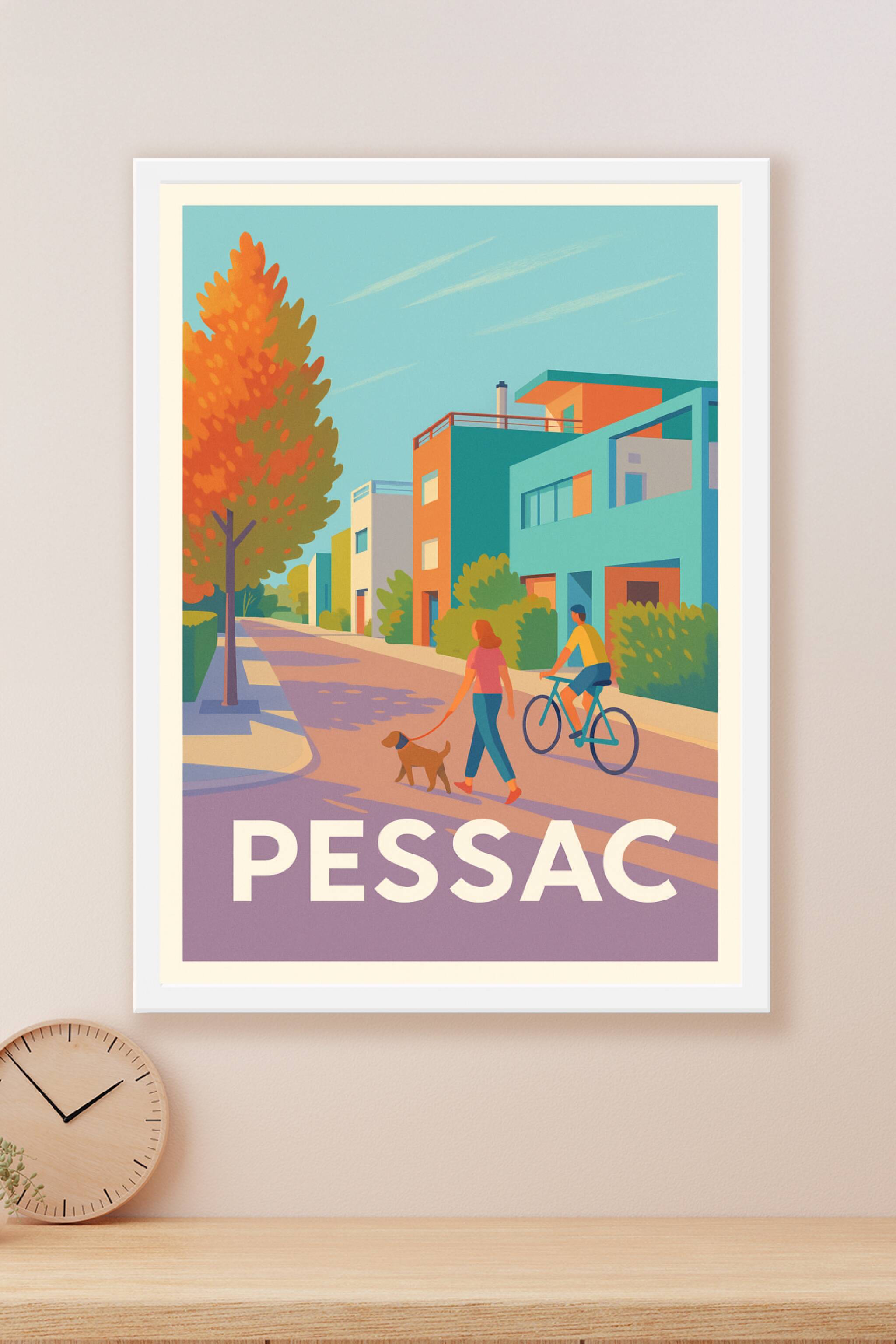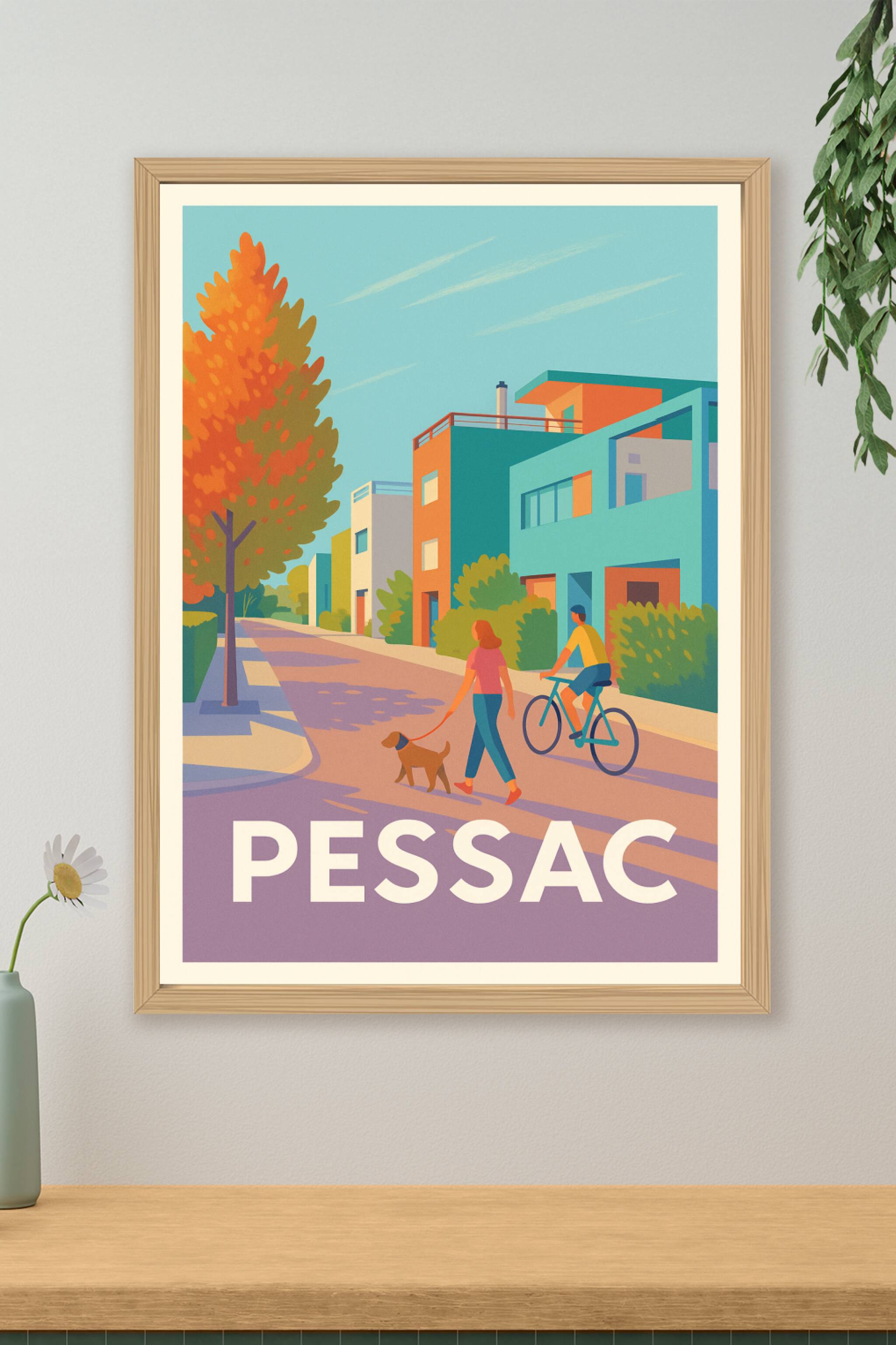 Découvrez l'ambiance douce et harmonieuse de Pessac avec cette affiche illustrée aux couleurs vives et à l'esthétique moderne. Représentant une scè...