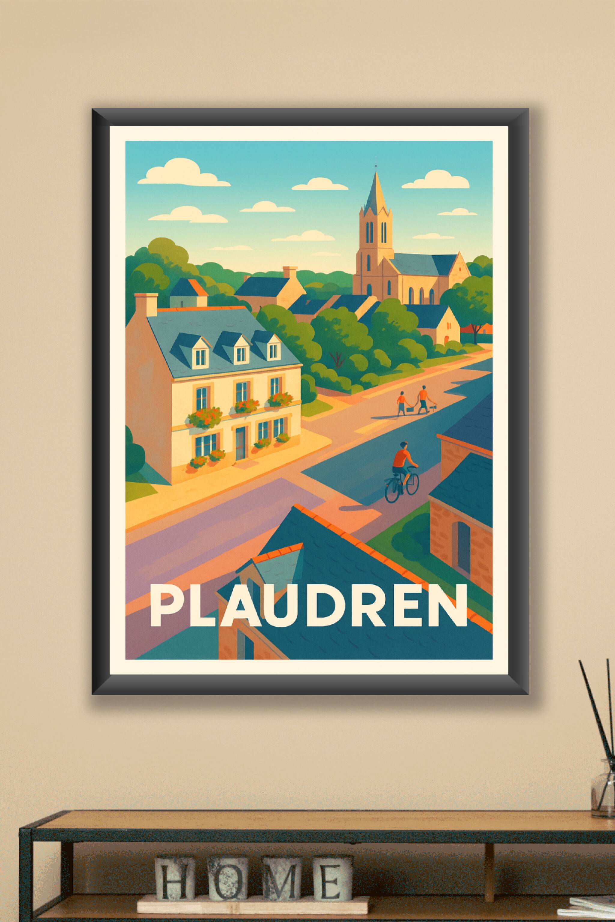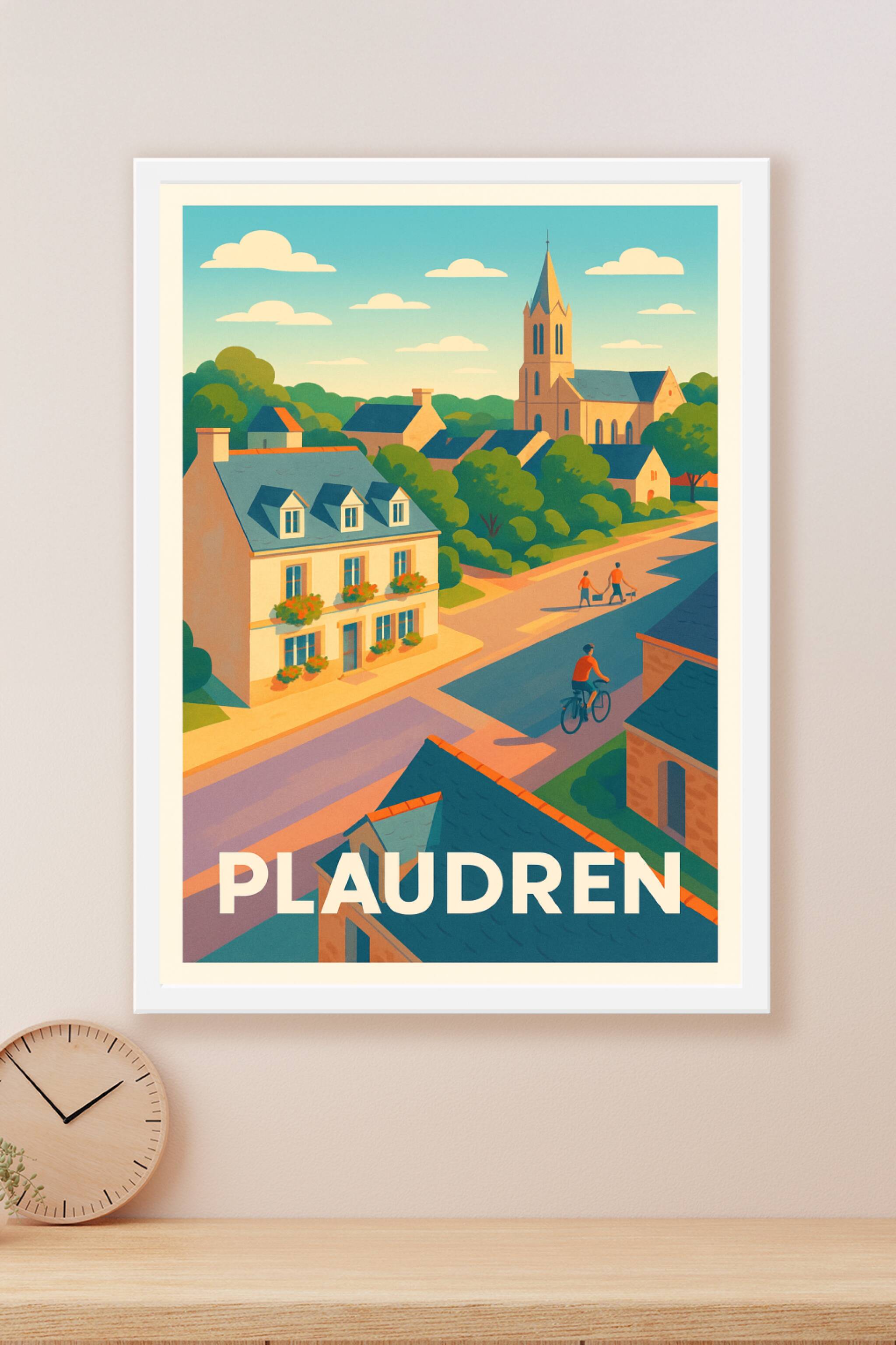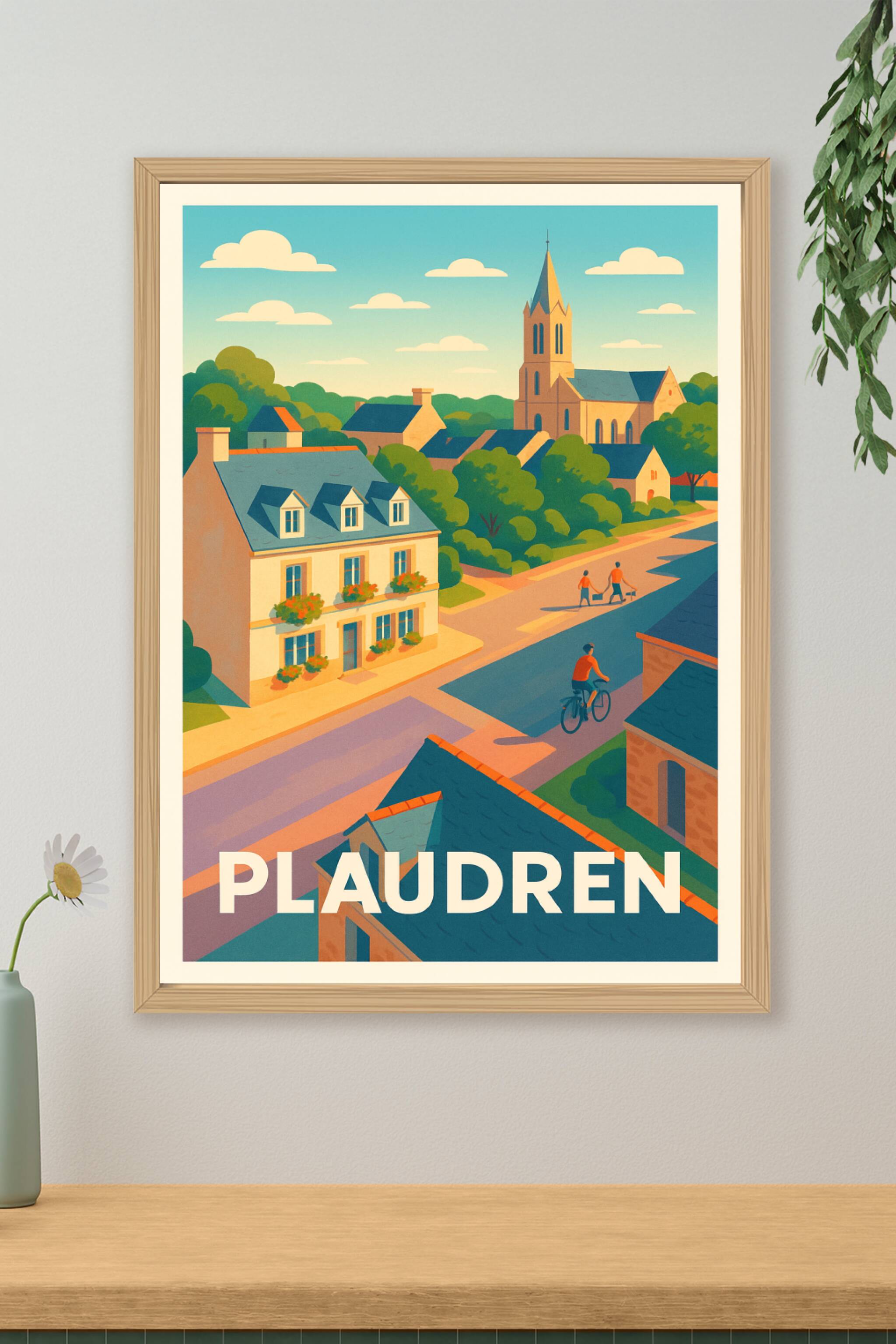 Découvrez le calme et la douceur de vivre de Plaudren avec cette affiche au style illustré et chaleureux. L'ambiance villageoise est parfaitement c...