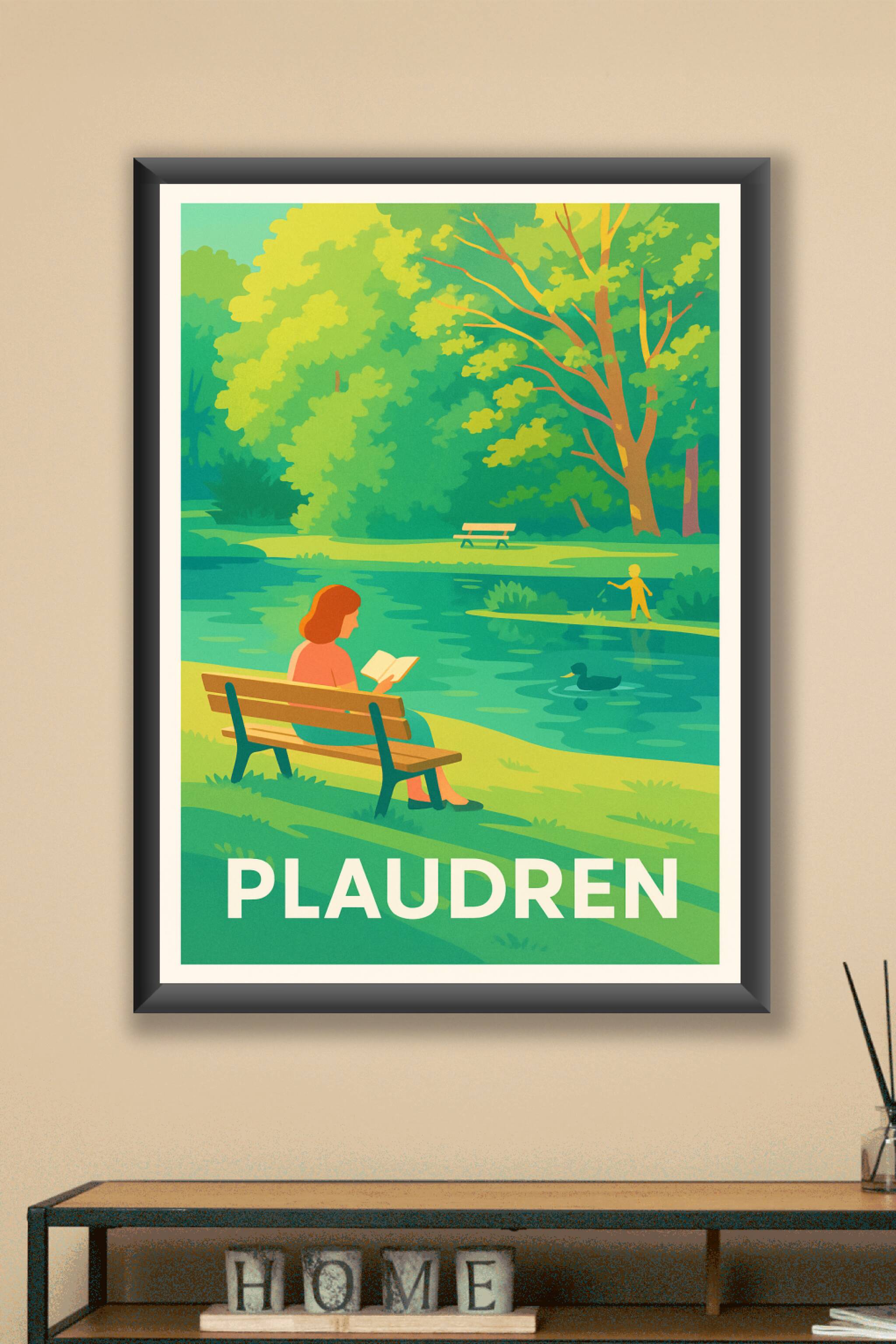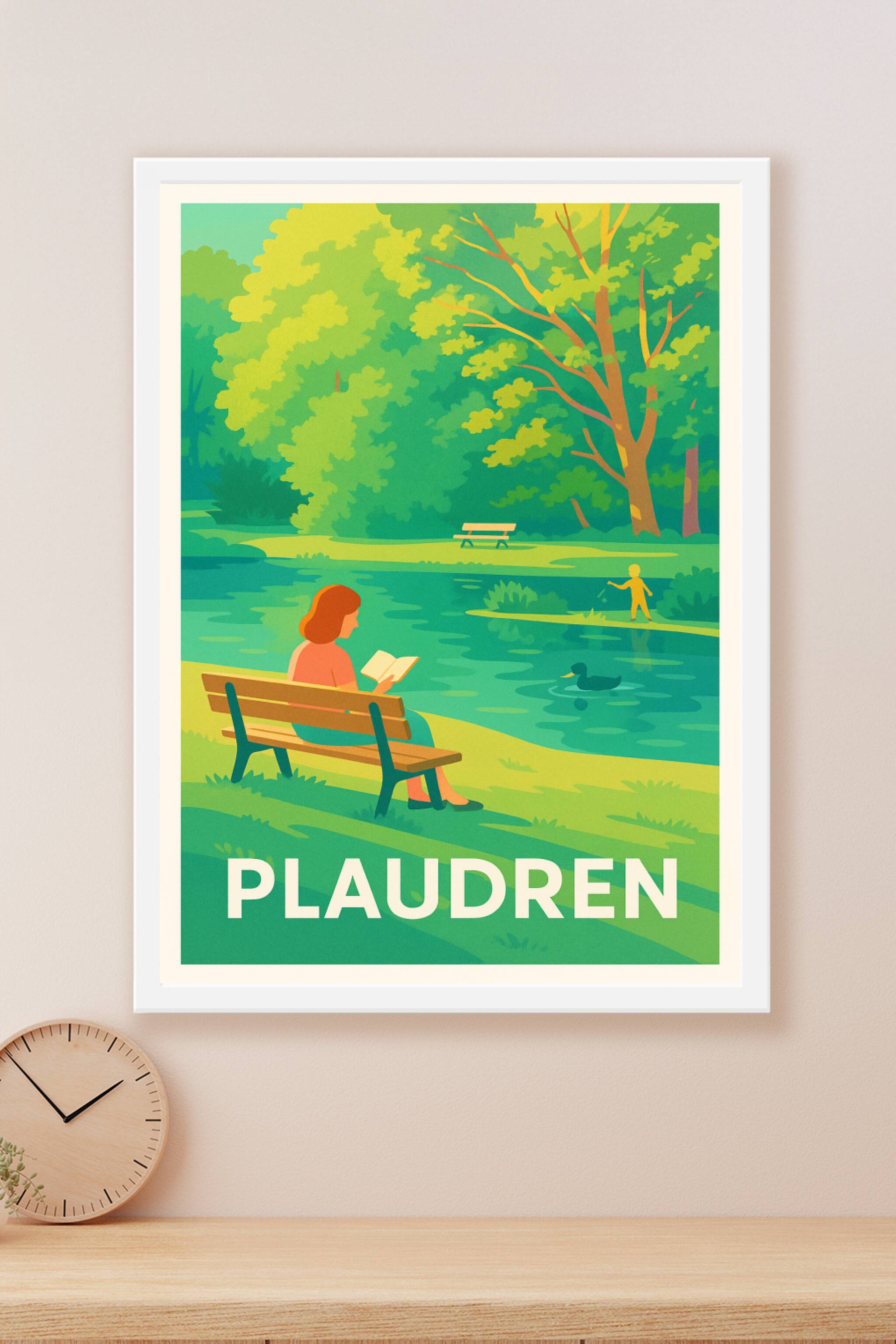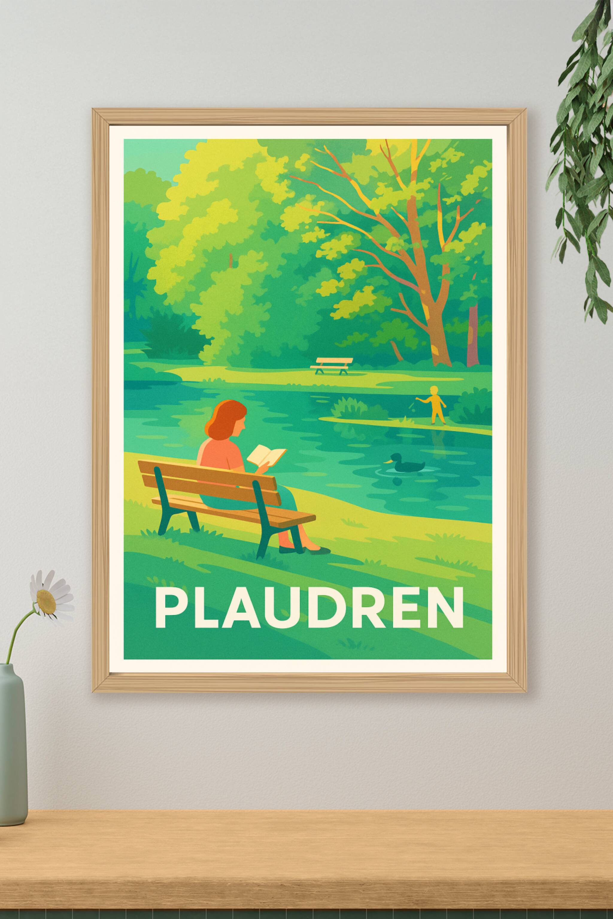 Découvrez la douceur de vivre à Plaudren avec cette affiche illustrée mettant en scène un moment de calme au bord d'un étang verdoyant. La chaleur ...