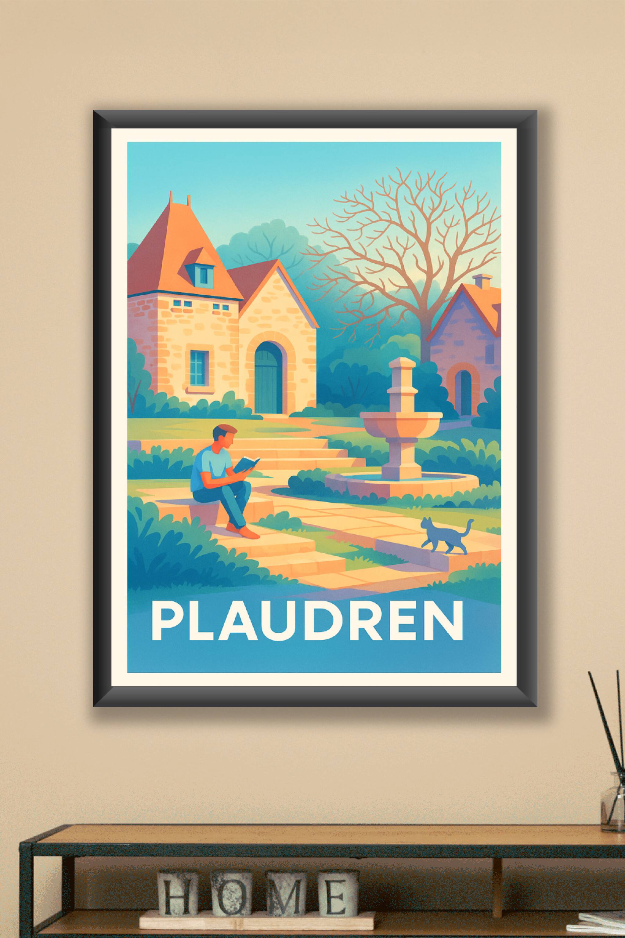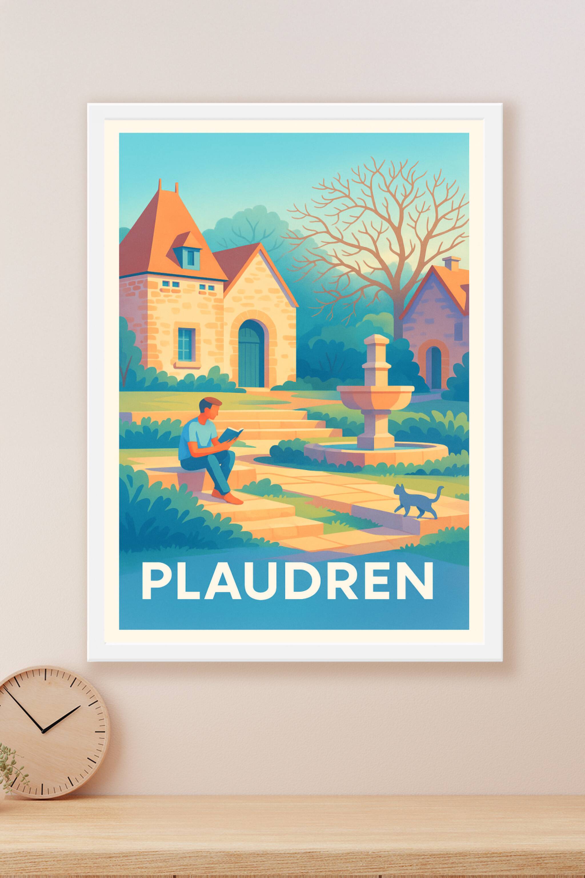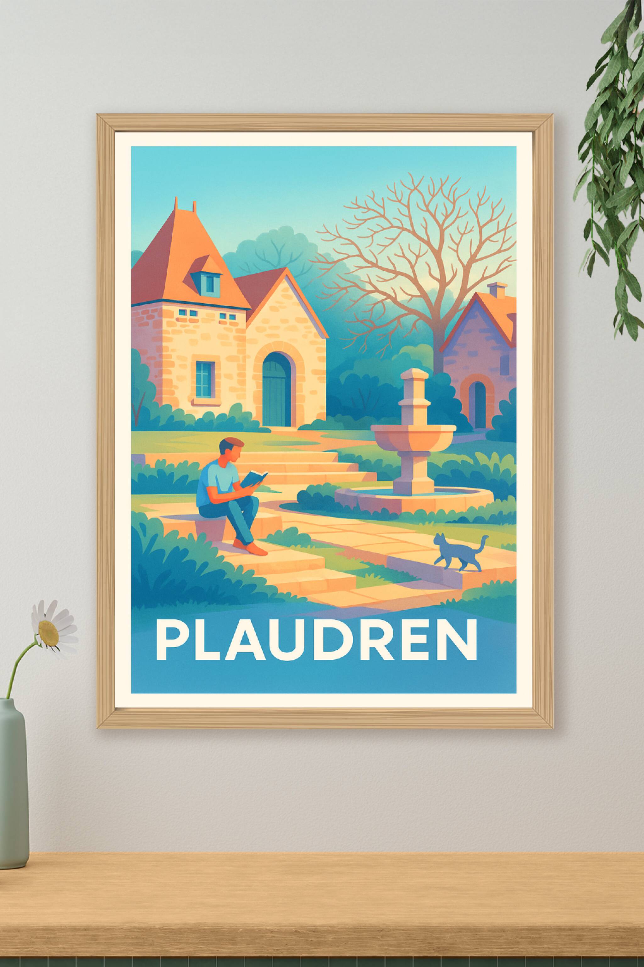 Cette affiche illustrée capture la quiétude d'une matinée à Plaudren, un village charmant de Bretagne. L'image dépeint une scène paisible où un homme lit tranquillement assis près d'une fontaine, entouré de maisons en pierre typiques et d'une nature luxuriante. Ce poster apporte une ambiance paisible et inspirante idéale pour décorer votre intérieur ou votre espace de travail. Disponible en tirage "Fine Art", il est imprimé sur papier 305g coton garantissant une qualité d'impression exceptionnelle, des couleurs vives et des détails parfaits. Vous pouvez choisir votre affiche en formats A1 à A4, avec ou sans cadre, pour sublimer tout type de décor et faire un cadeau raffiné aux amateurs de paysages bretons et d'art mural de qualité.