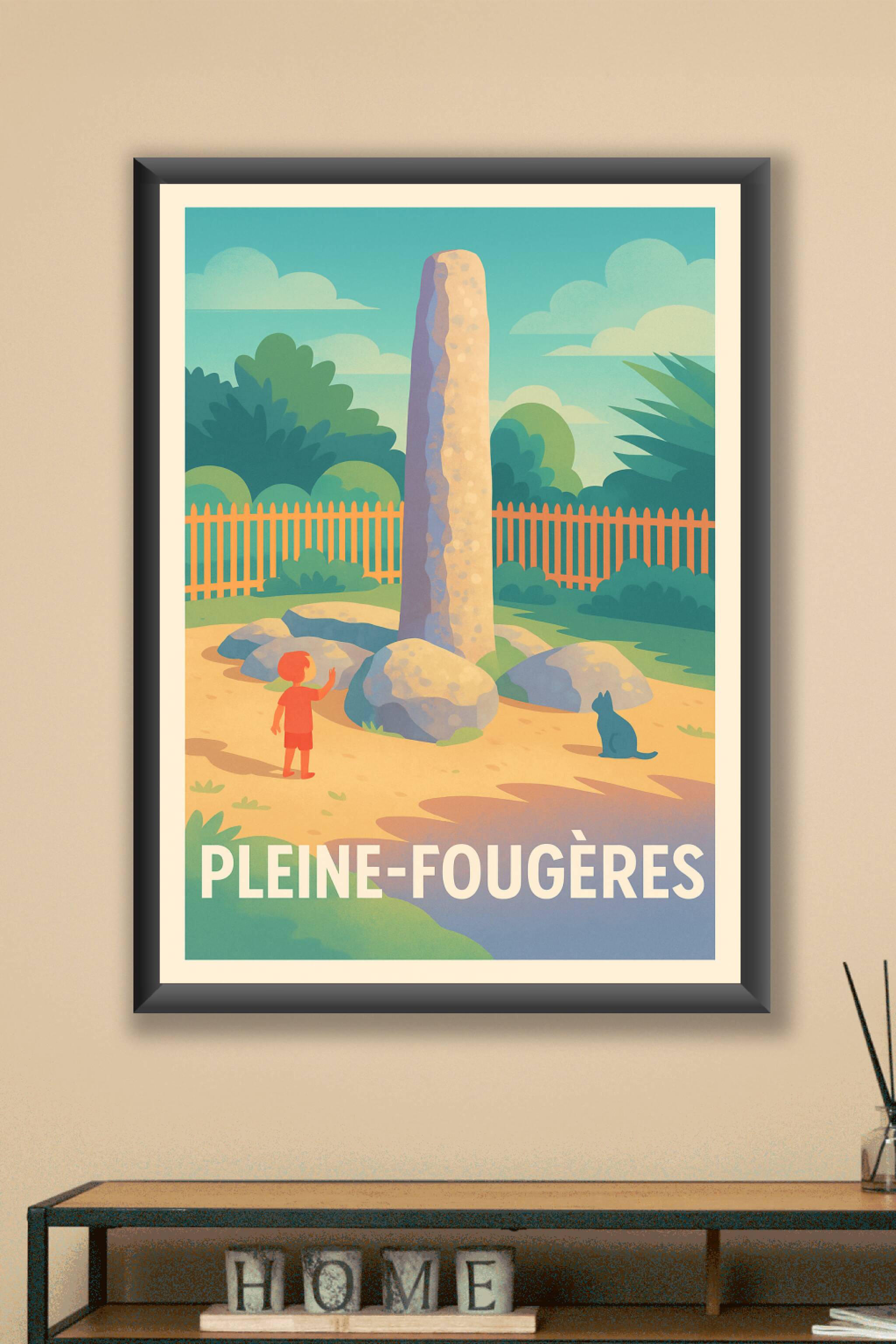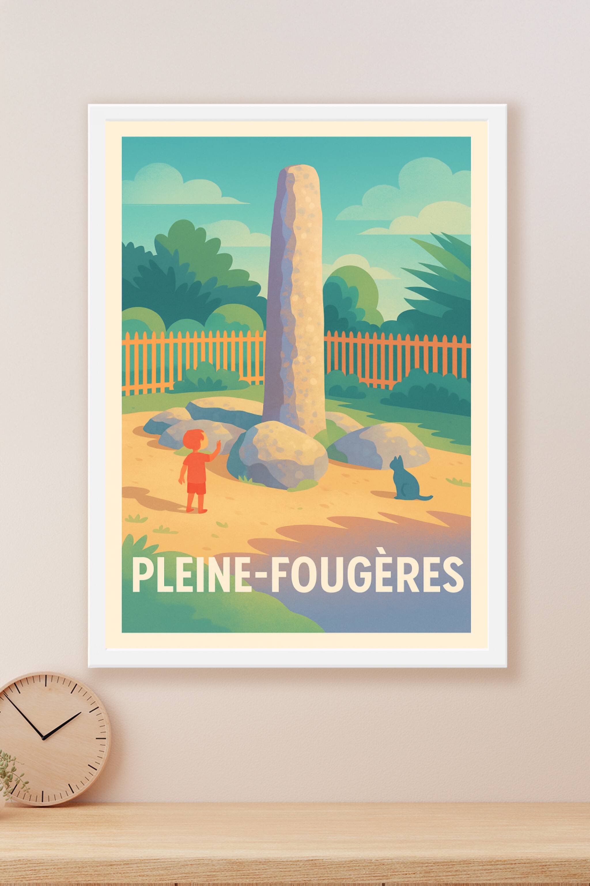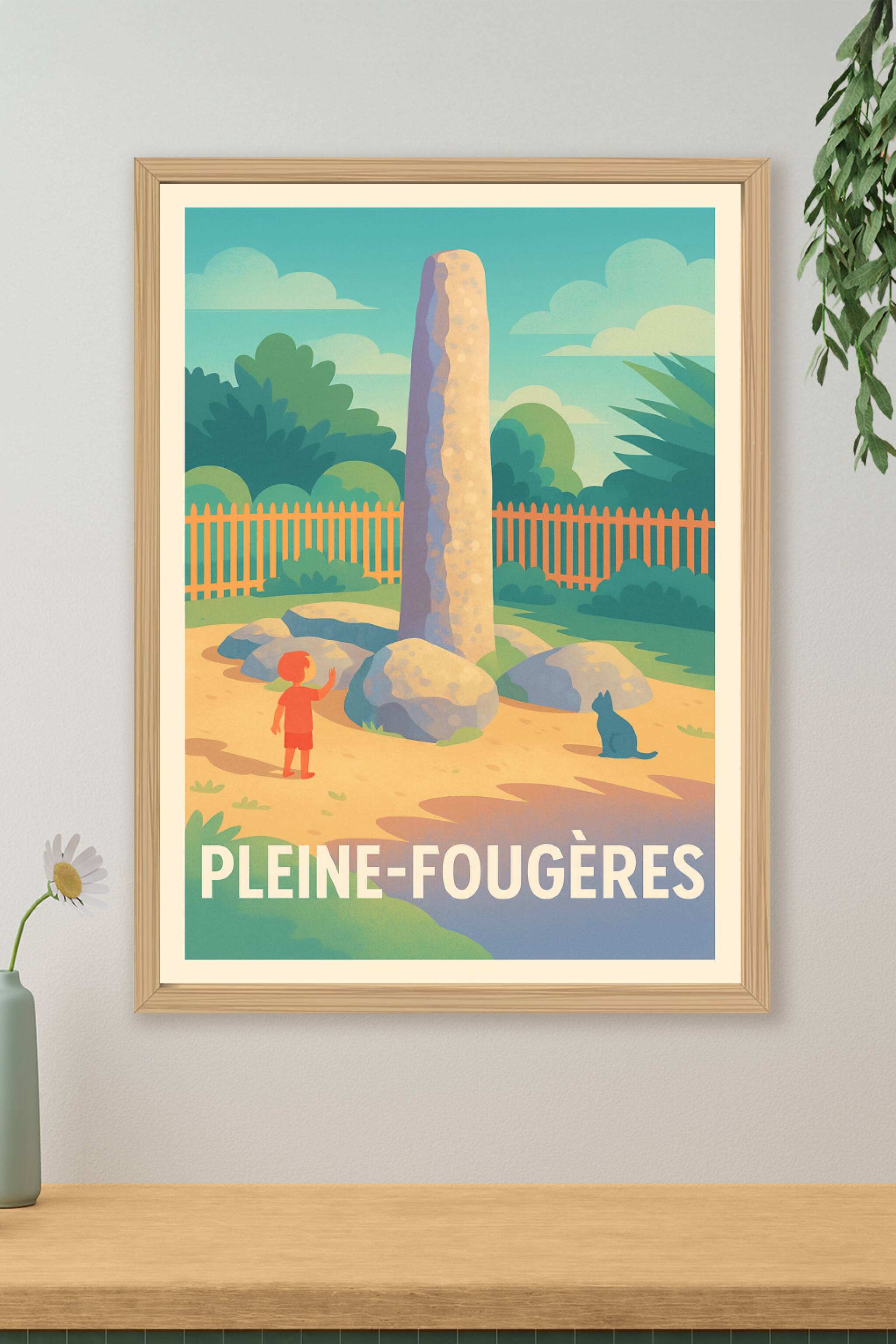 Découvrez la beauté paisible et mystique de Pleine-Fougères avec cette affiche illustrée qui met en avant un menhir emblématique entouré d'une natu...