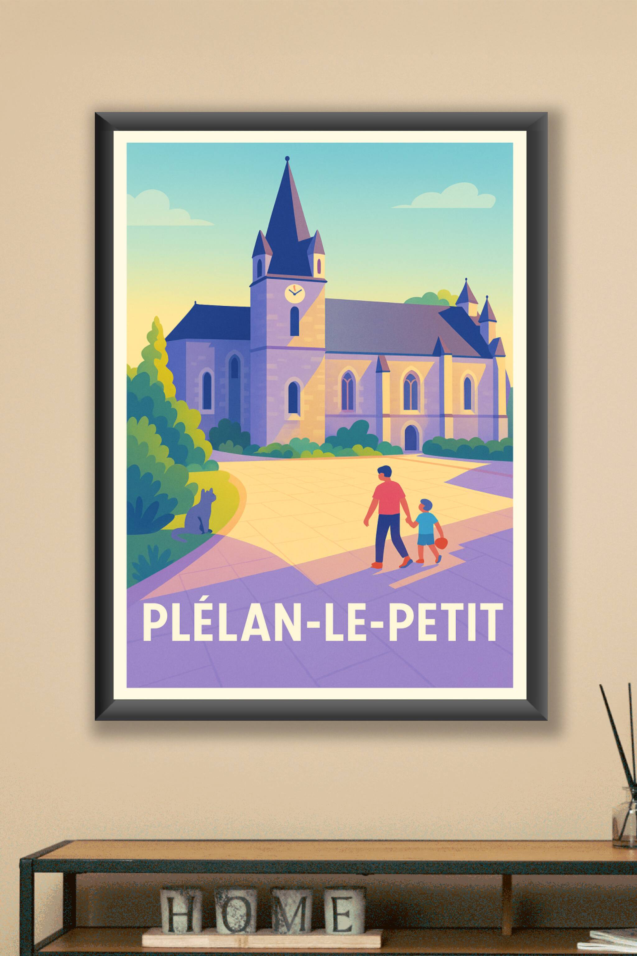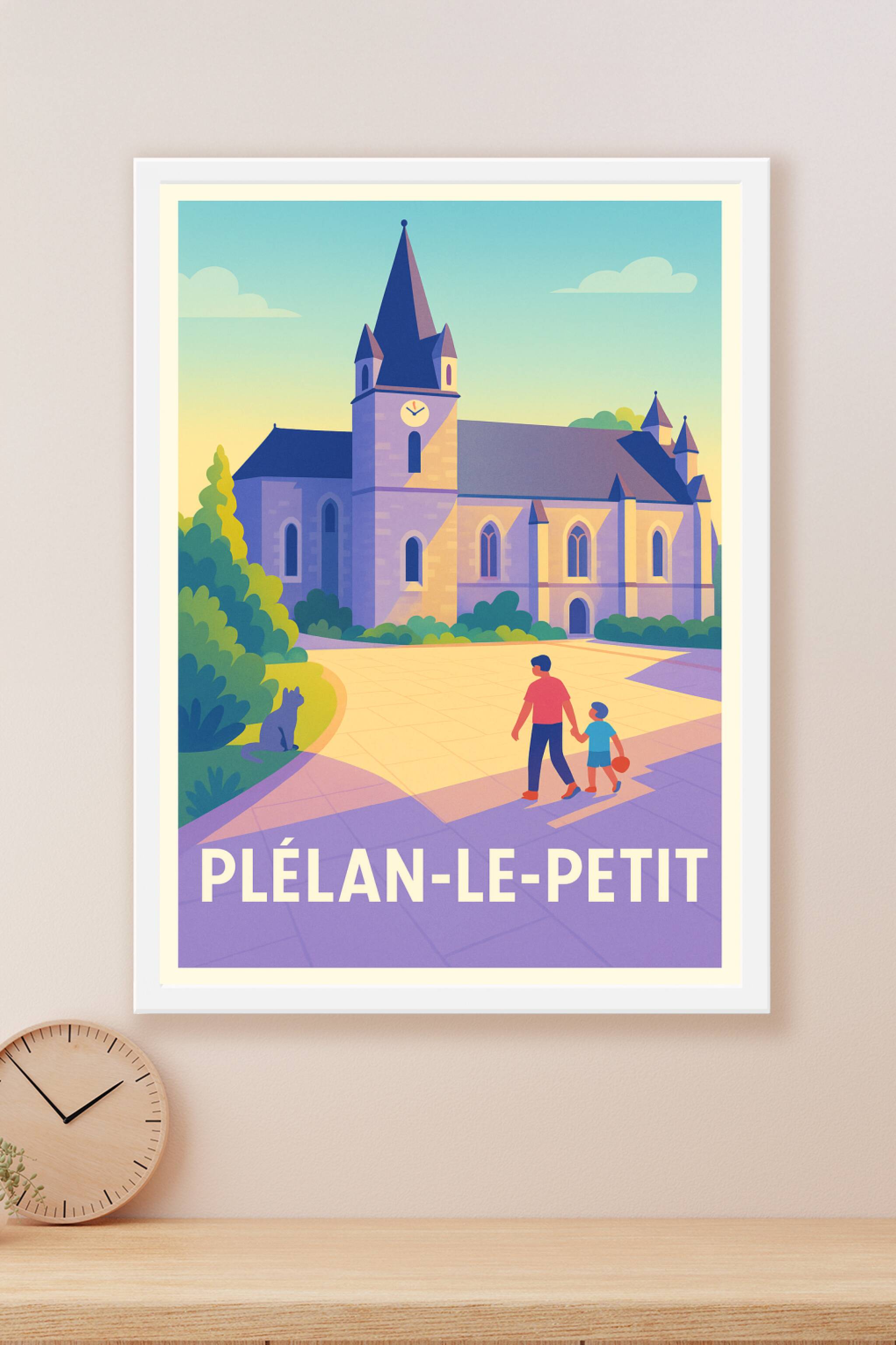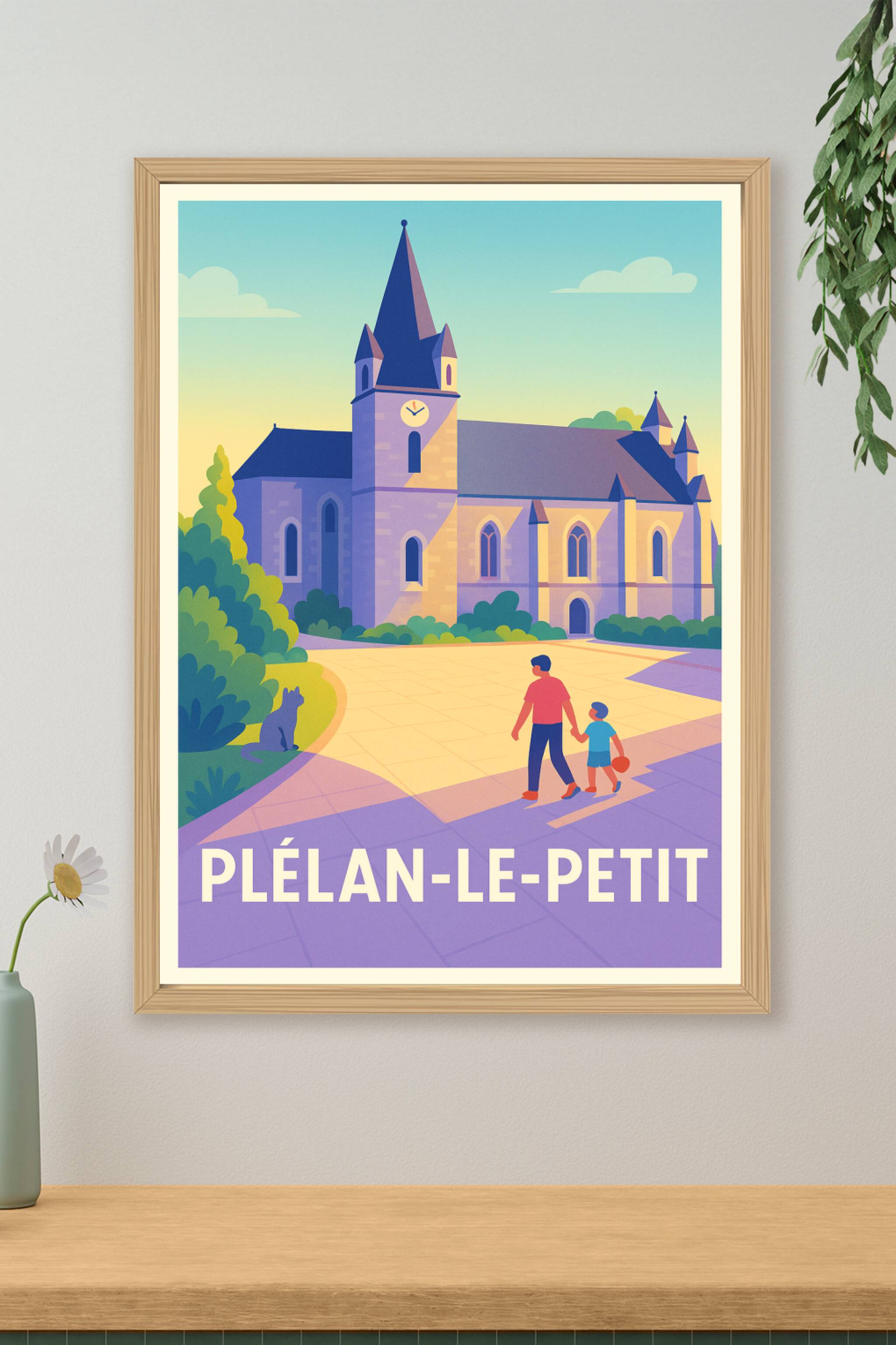 Découvrez le charme tranquille de Plélan-le-Petit avec cette affiche illustrée représentant une scène paisible au pied de son église emblématique. ...
