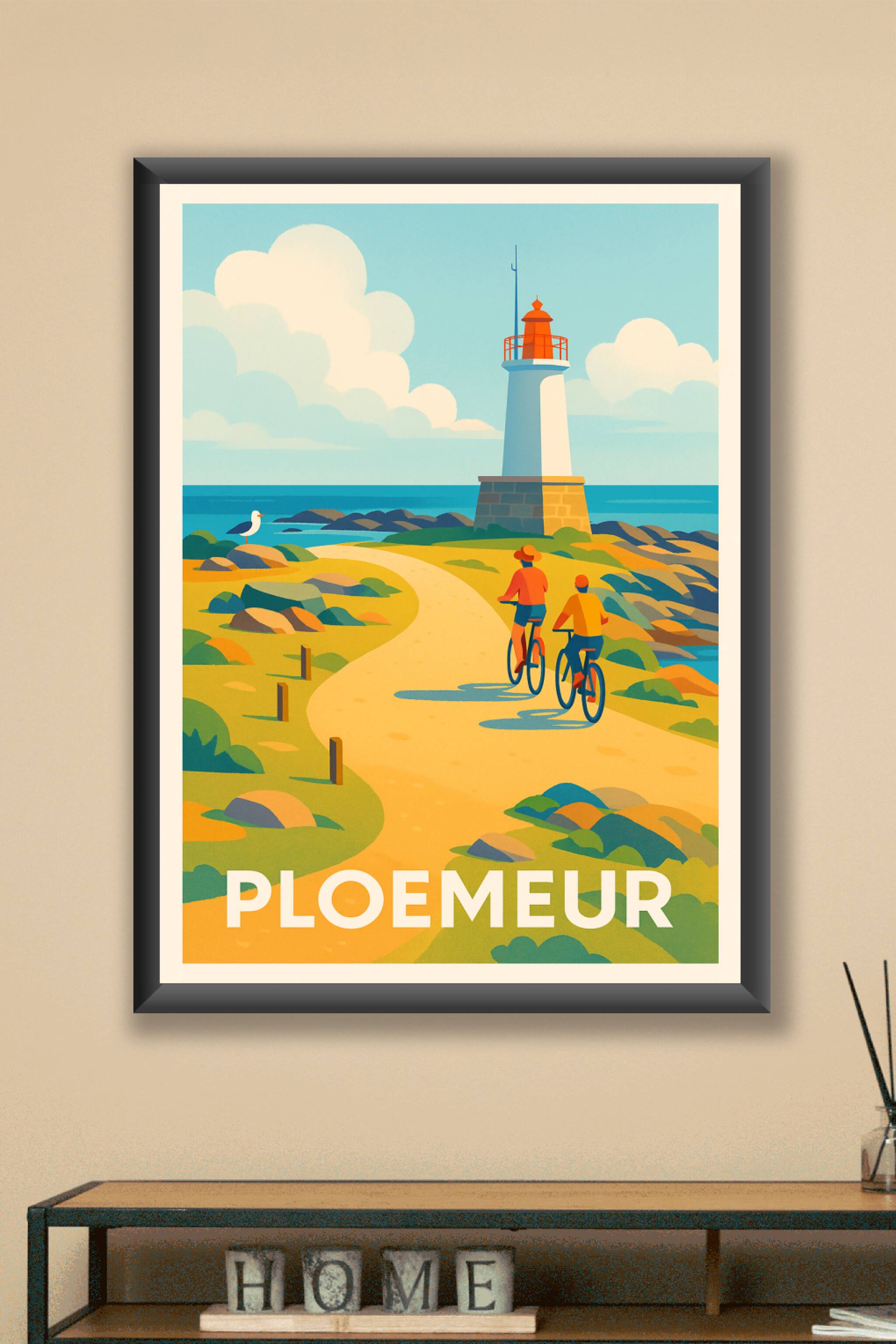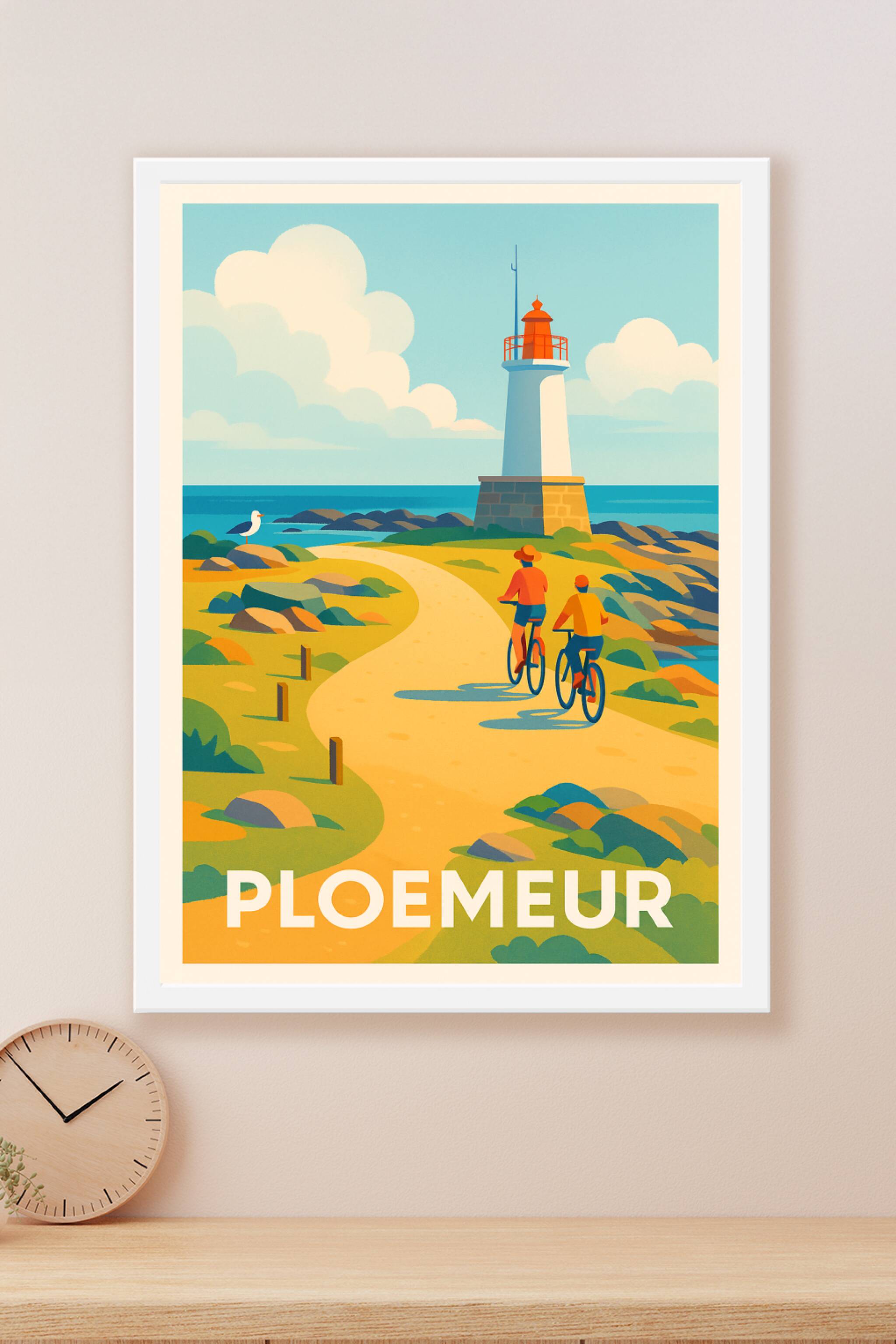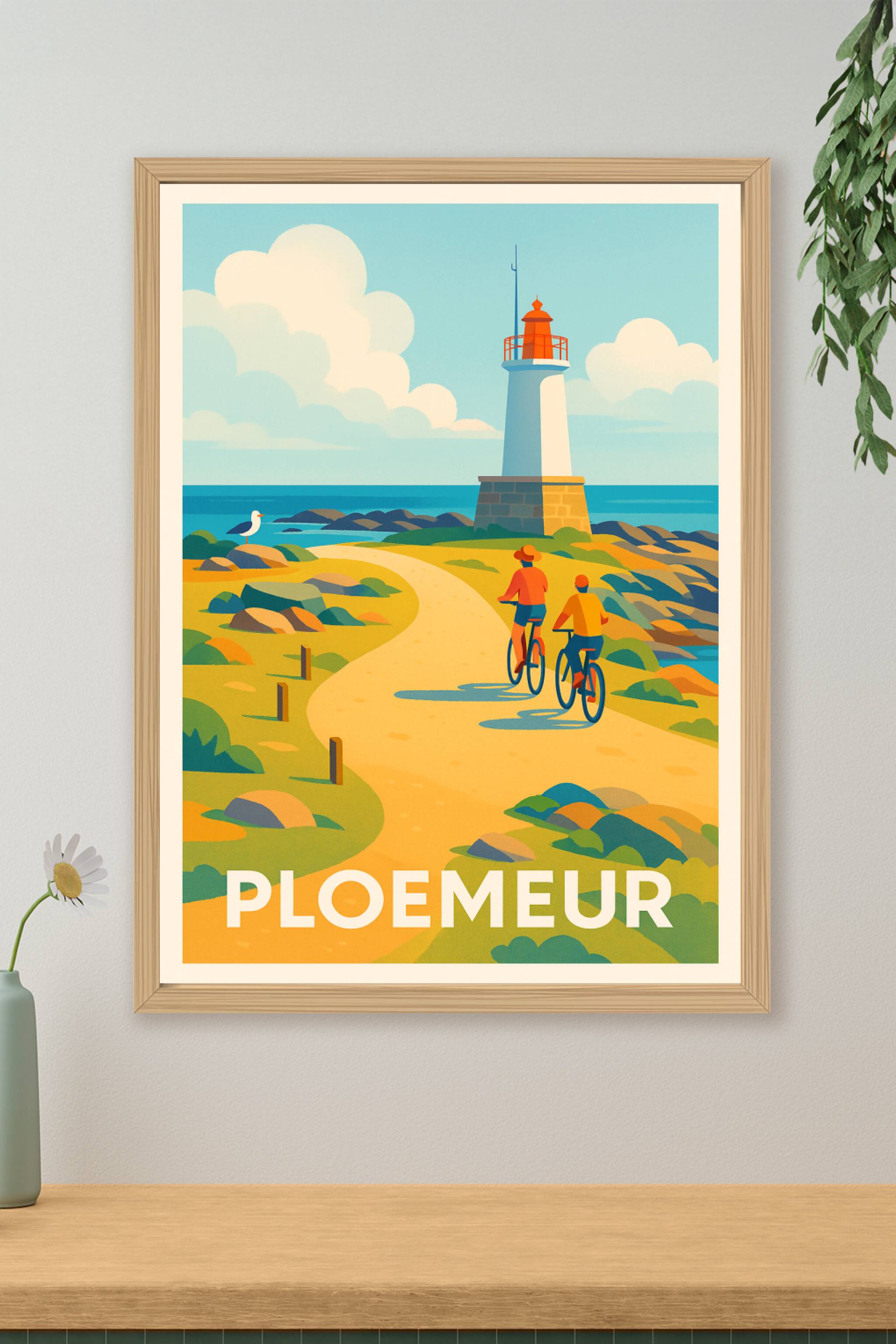Découvrez la beauté authentique de Ploemeur avec cette affiche qui capture une scène paisible le long de la côte bretonne, où deux cyclistes profit...