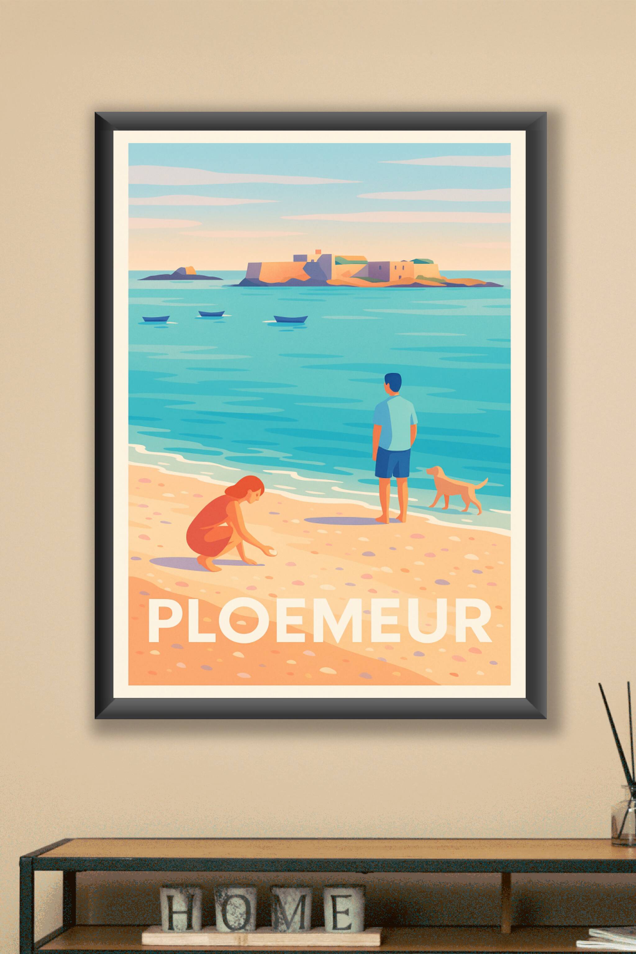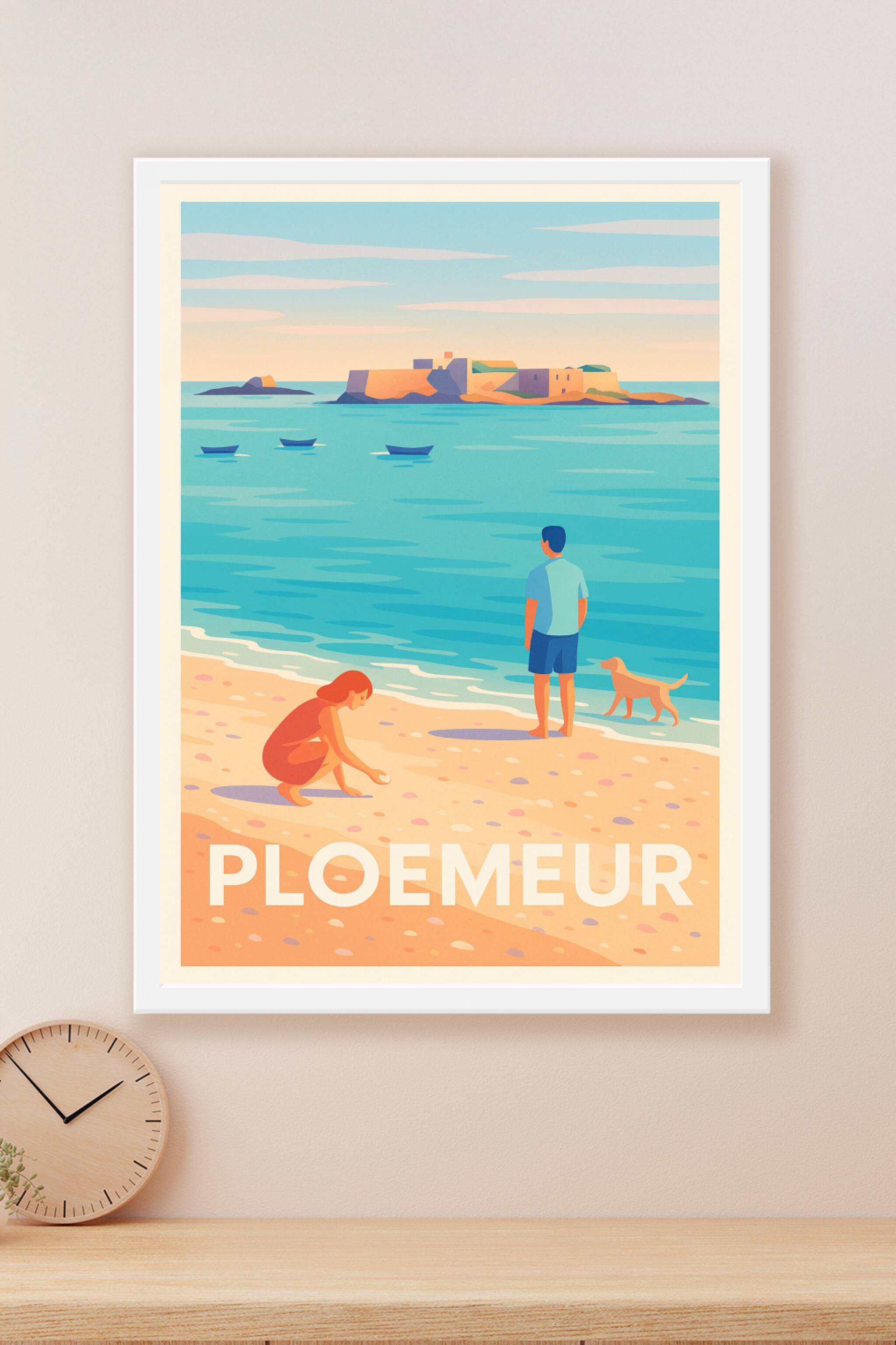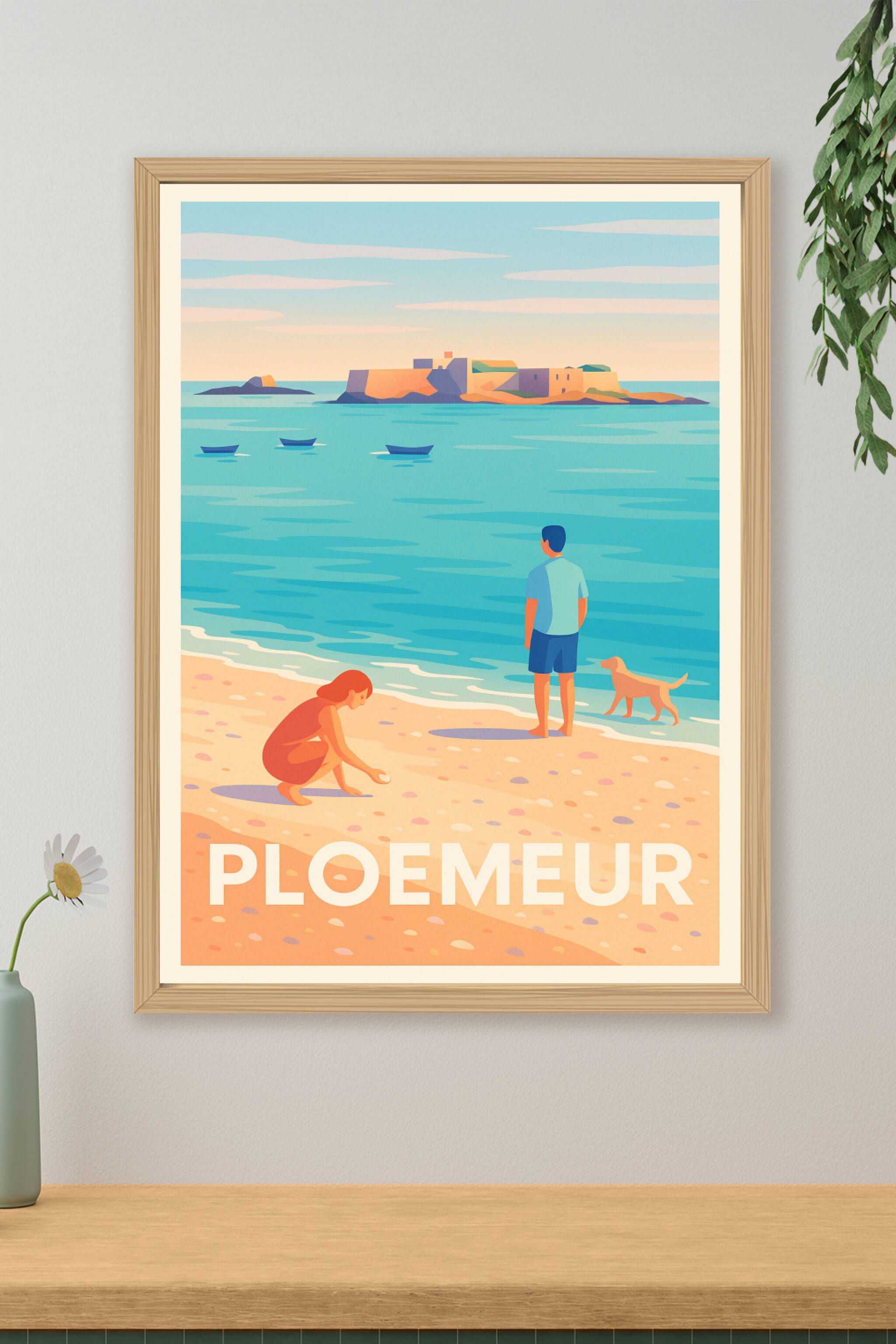 Découvrez la douceur de vivre bretonne avec cette affiche illustrant une scène paisible sur la plage de Ploemeur. Une femme ramasse des coquillages tandis qu'un homme et son chien contemplent l'île fortifiée au loin, capturant l'essence d'un moment authentique au bord de la mer. Ce poster, au style vintage et aux couleurs apaisantes, est parfait pour apporter une touche naturelle et chaleureuse à votre intérieur. Imprimé en tirage "Fine Art" sur un papier 305g coton de grande qualité, il offre une durabilité et une finesse d'impression remarquables. Disponible en formats A1 à A4, avec ou sans cadre, cette affiche sublime votre décoration tout en vous invitant à rêver des rivages bretons. Profitez d'un produit 100% fabriqué en France pour un souvenir authentique ou un cadeau d'exception.