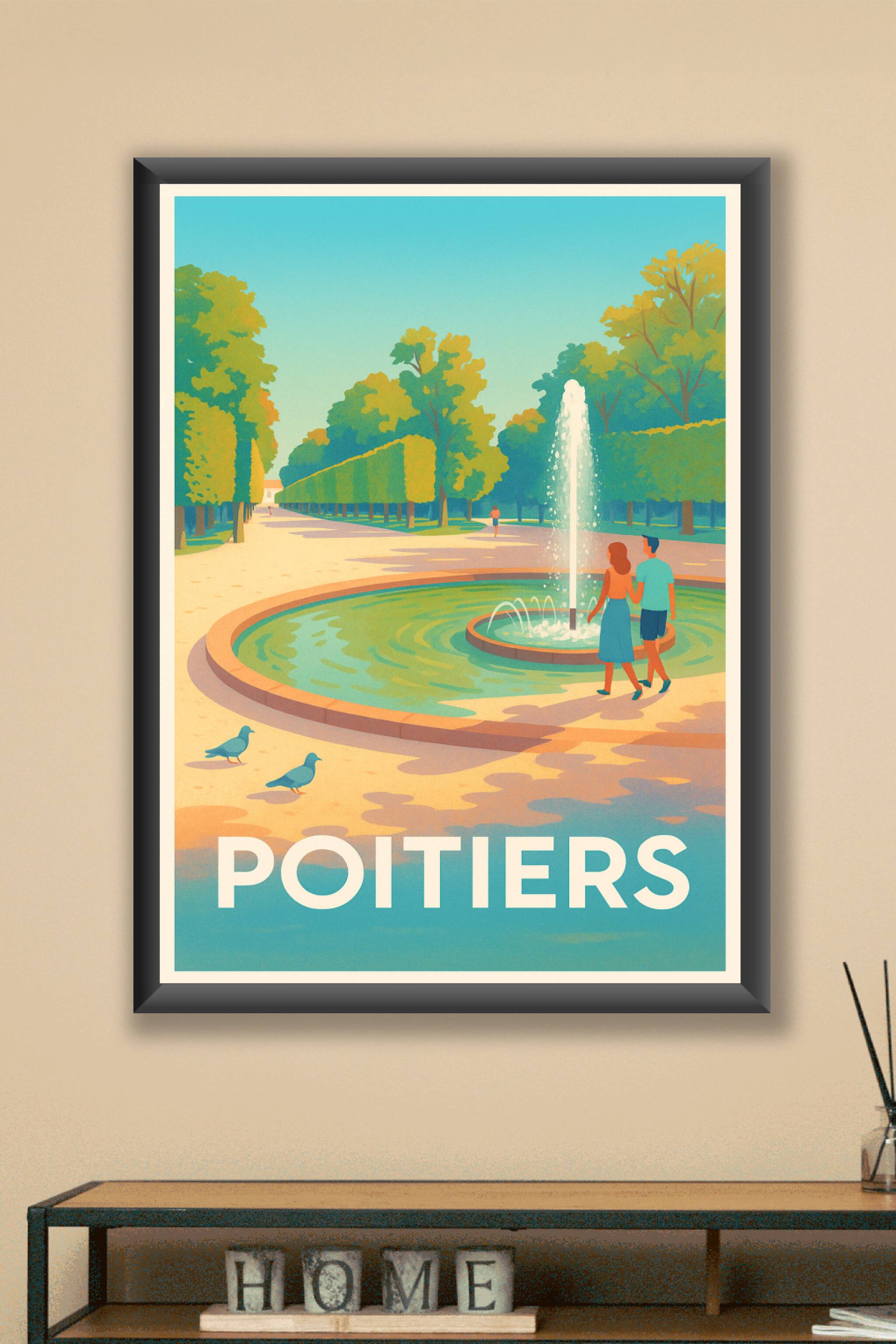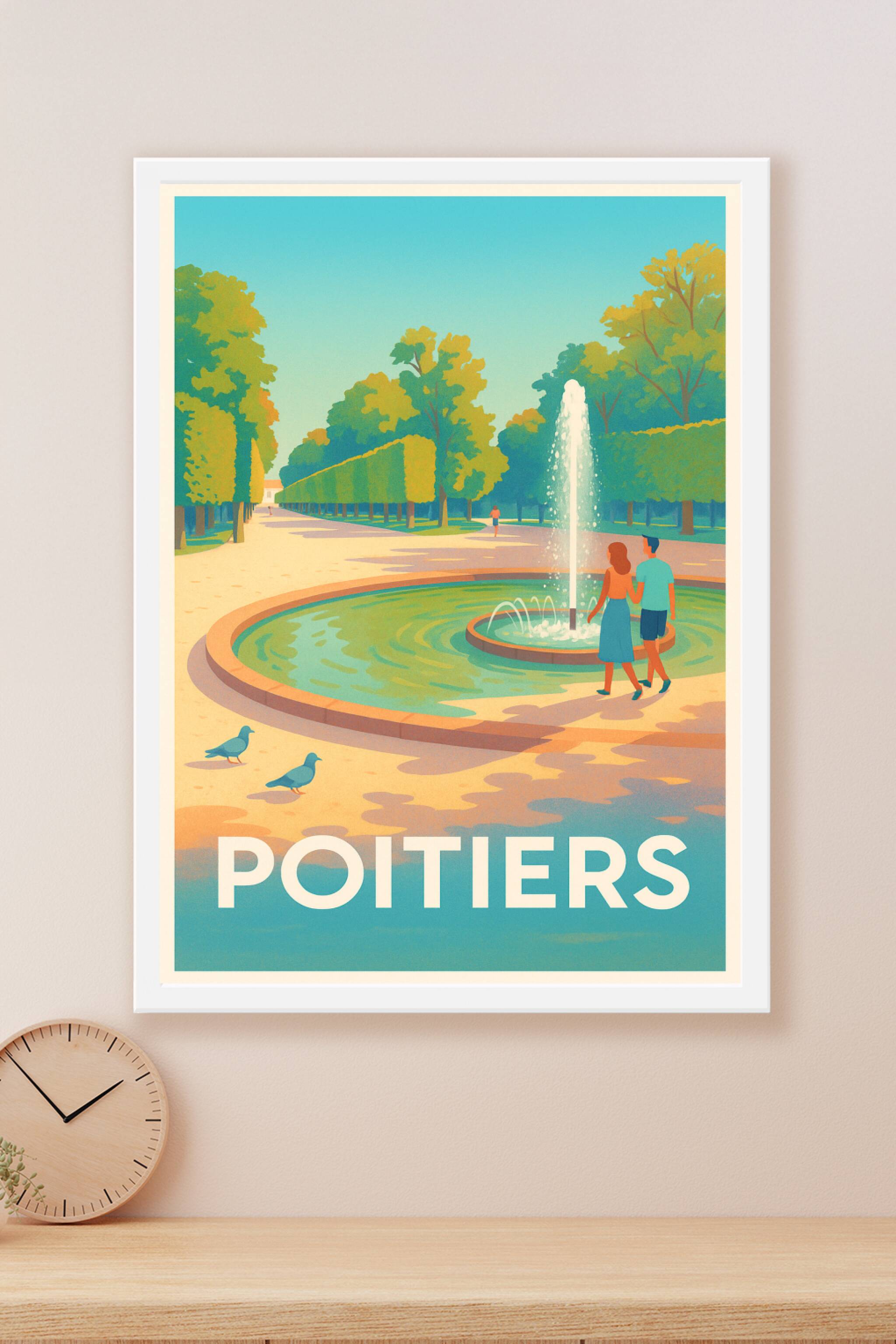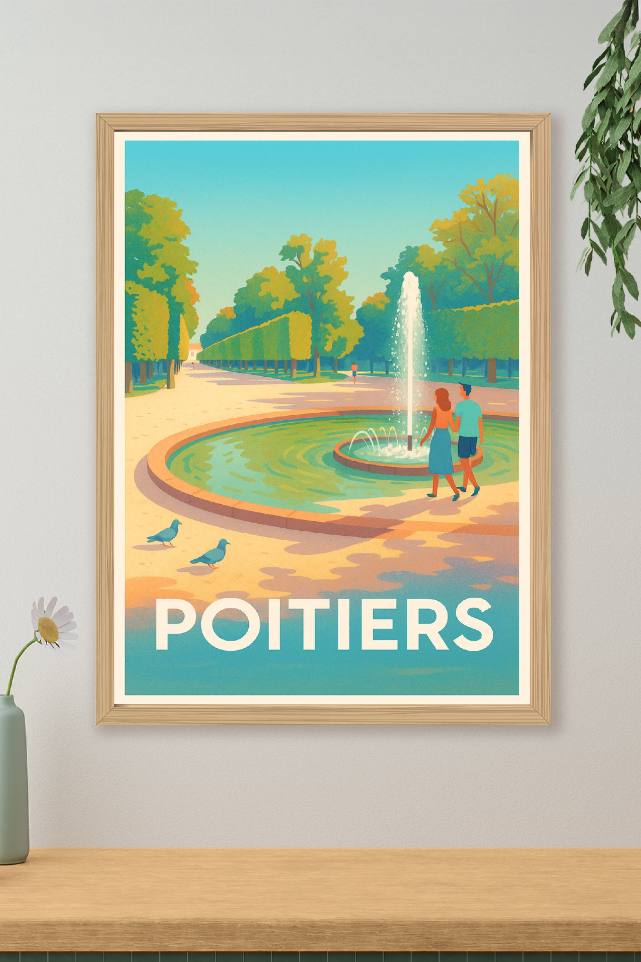 Découvrez la douceur et la sérénité de Poitiers à travers cette affiche illustrée représentant une promenade autour d'une fontaine dans un parc omb...