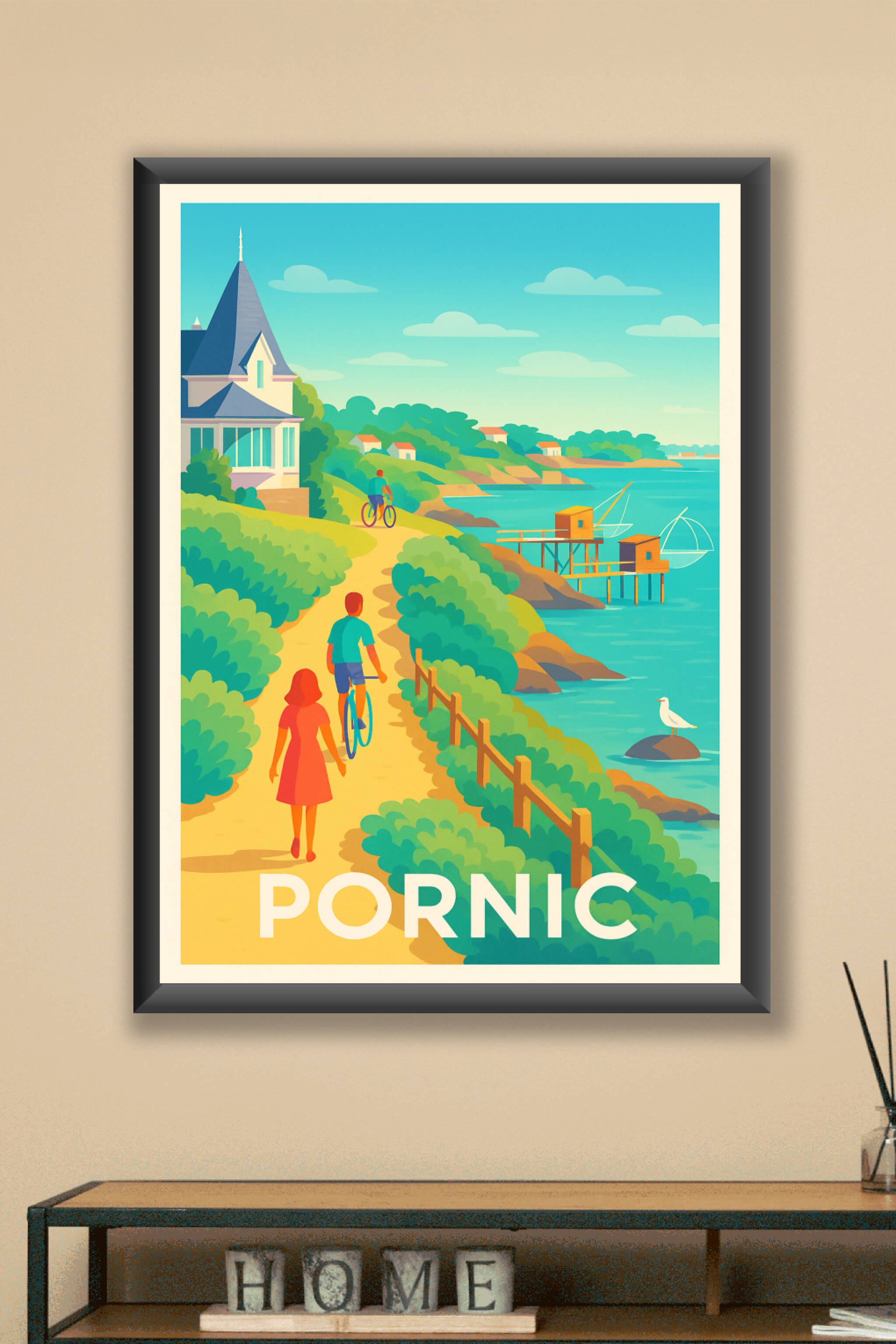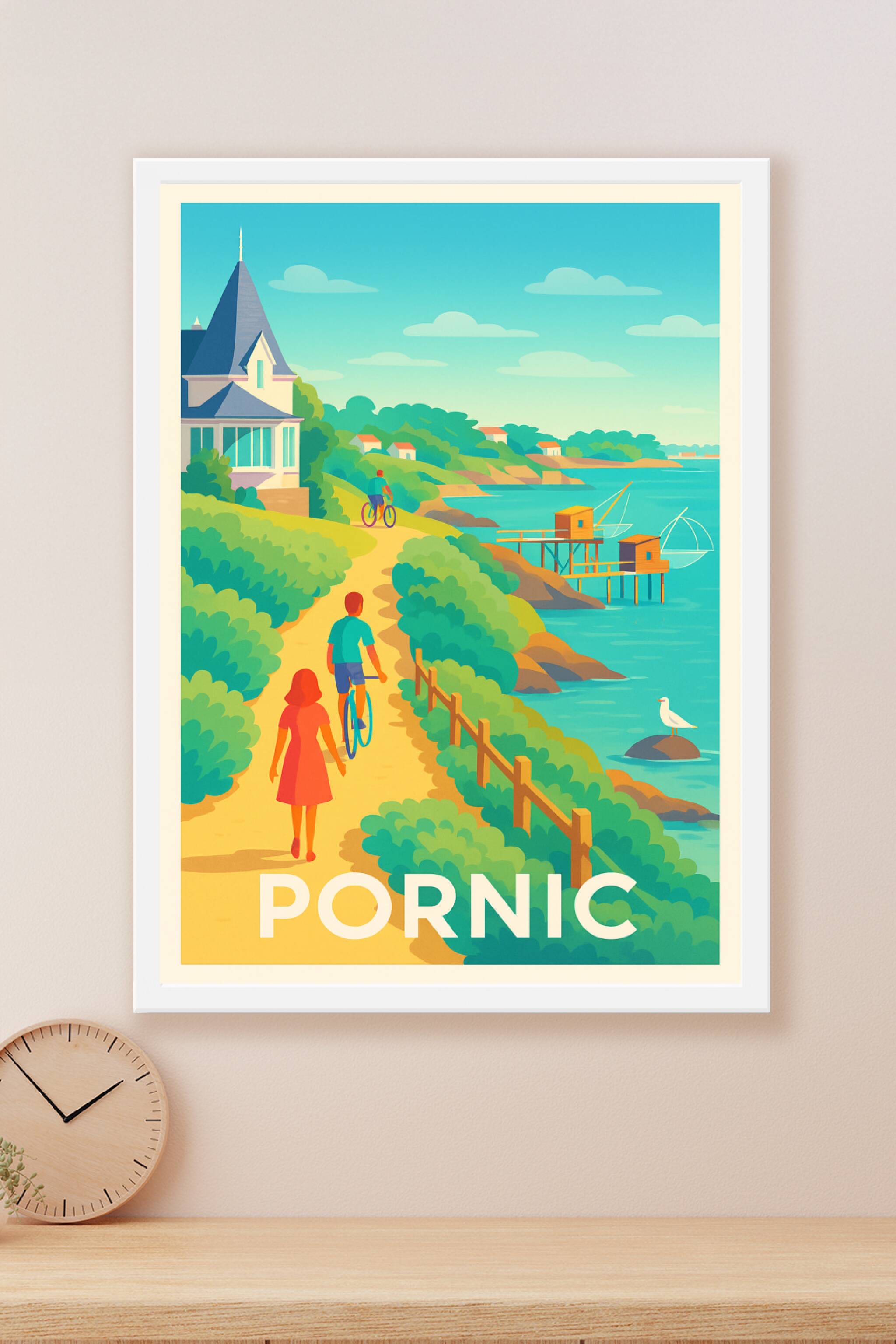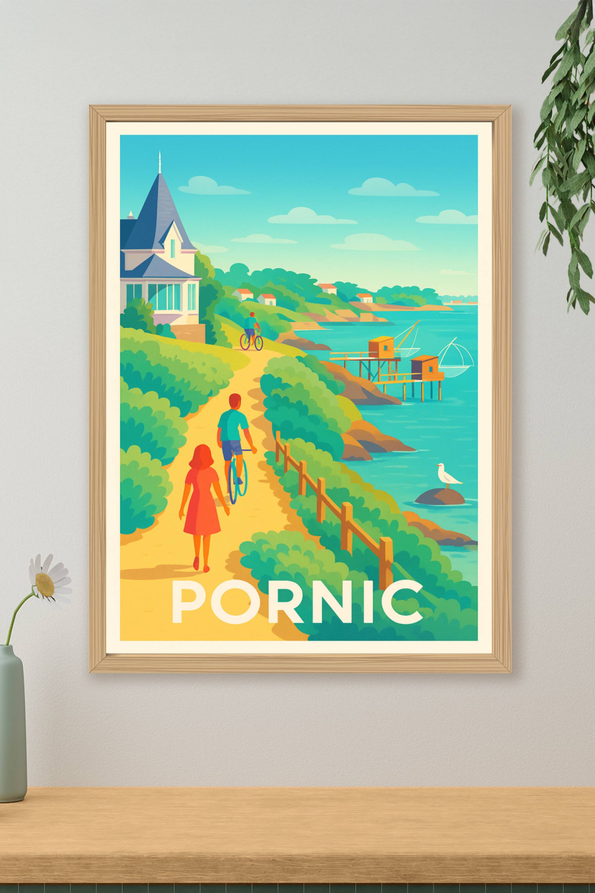 Découvrez la douceur de vivre de Pornic avec cette affiche illustrant une charmante promenade le long de la côte, baignée de lumière et de sérénité...