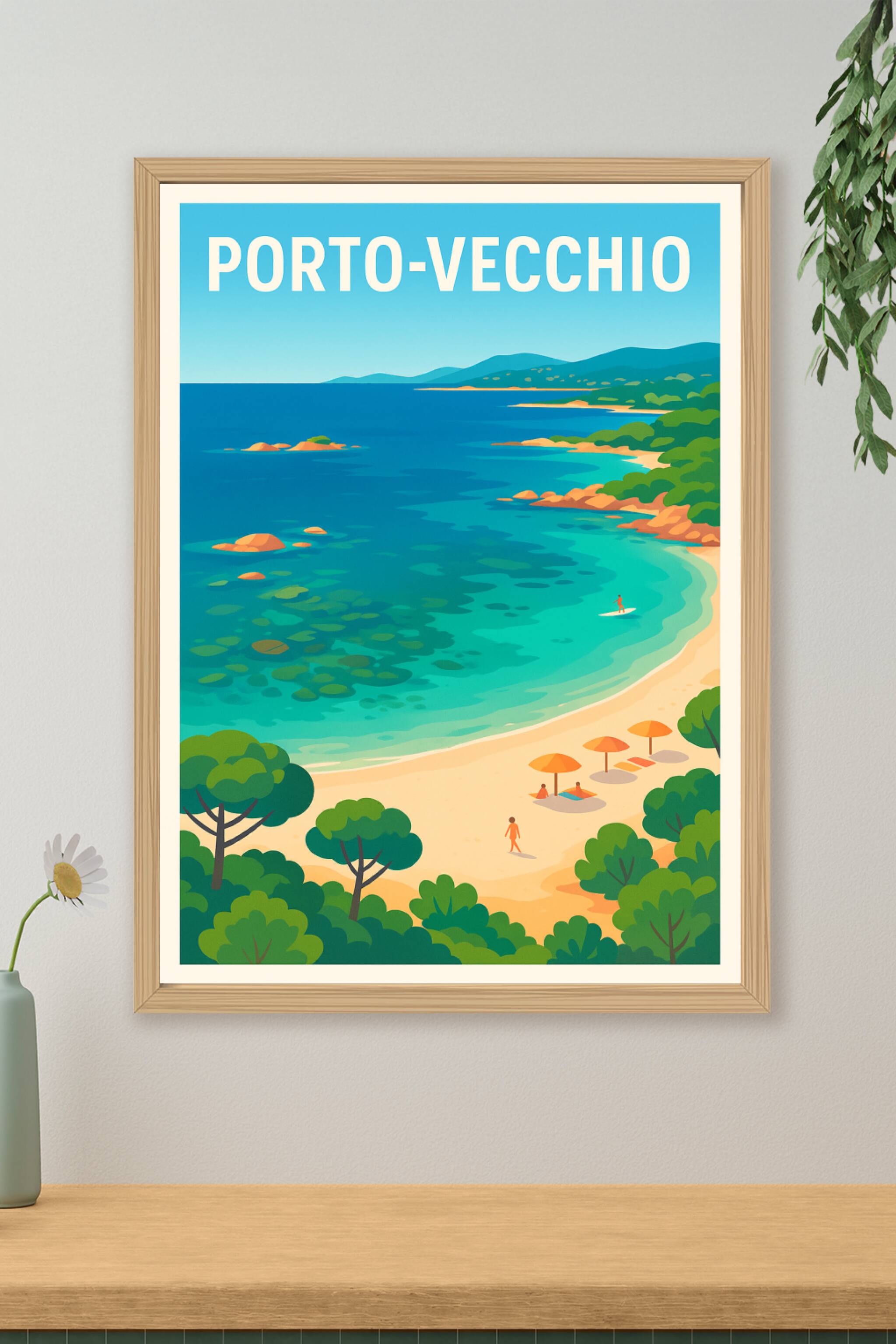 Découvrez la beauté sereine de Porto-Vecchio à travers cette affiche illustrée qui capture le charme de ses plages baignées de soleil et ses eaux c...