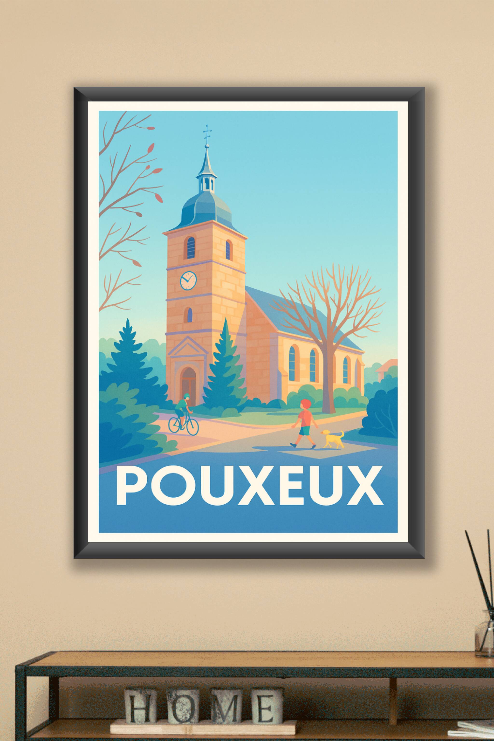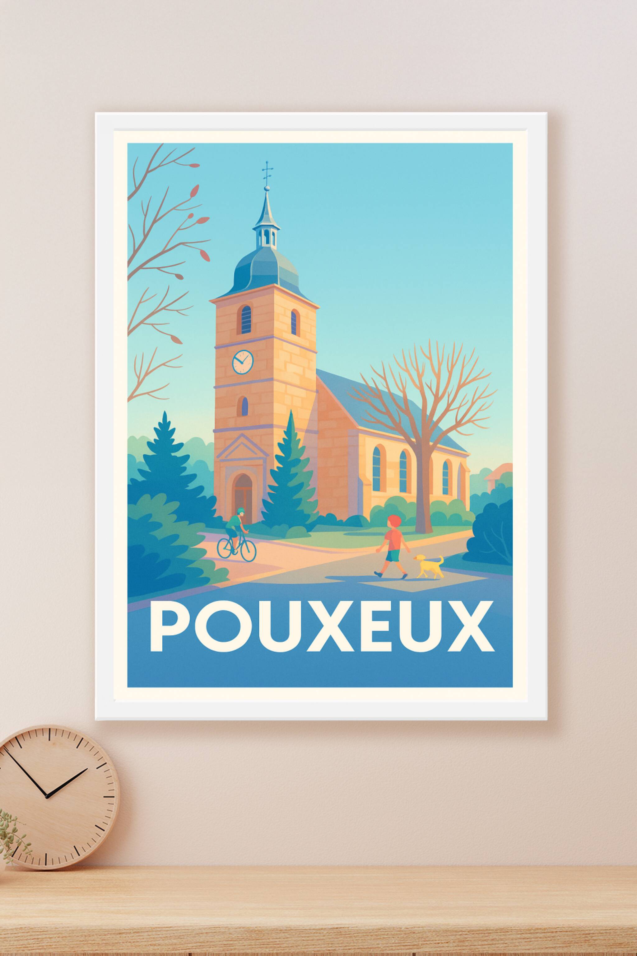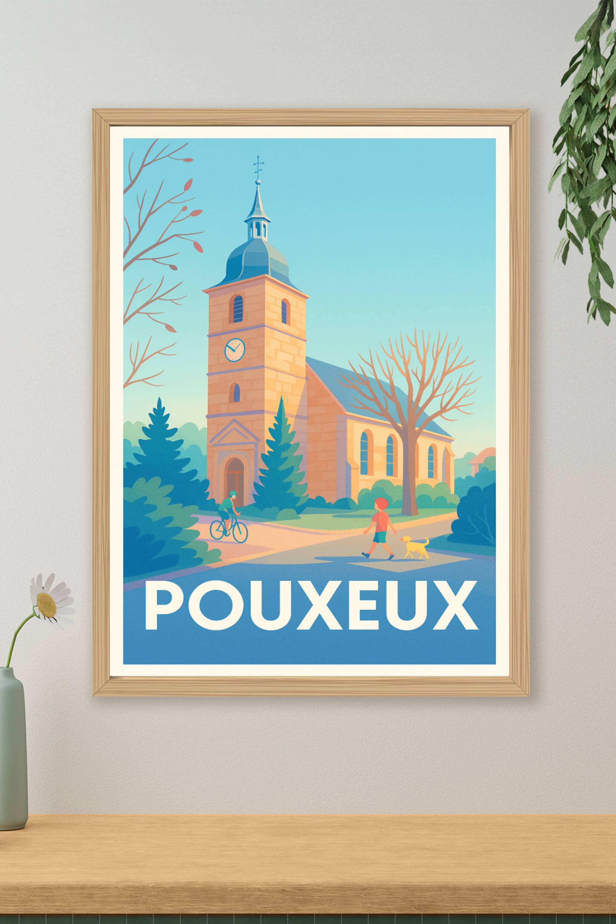 Découvrez l'ambiance sereine et chaleureuse du village de Pouxueux avec cette affiche illustrée mettant en avant son église emblématique baignée de...