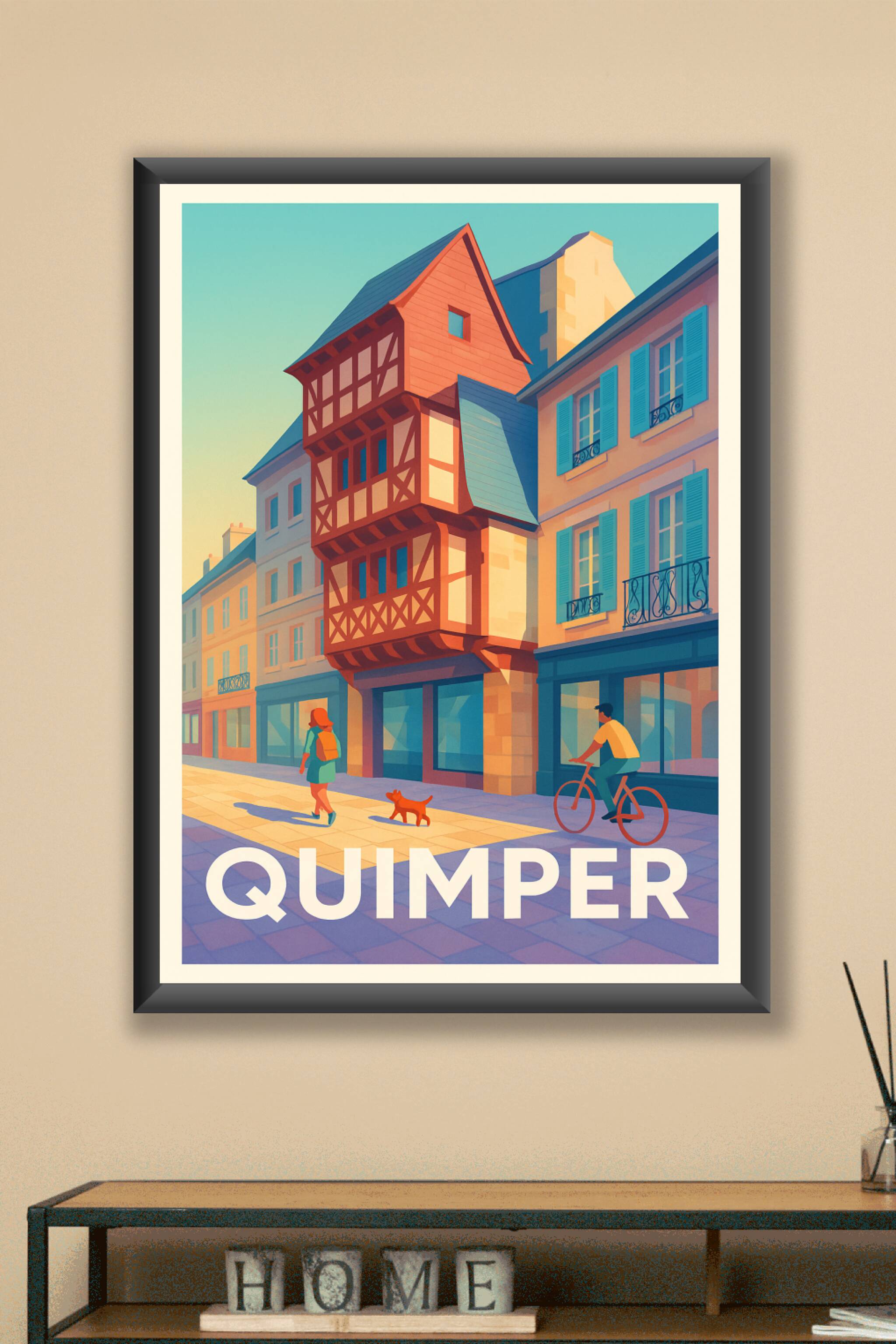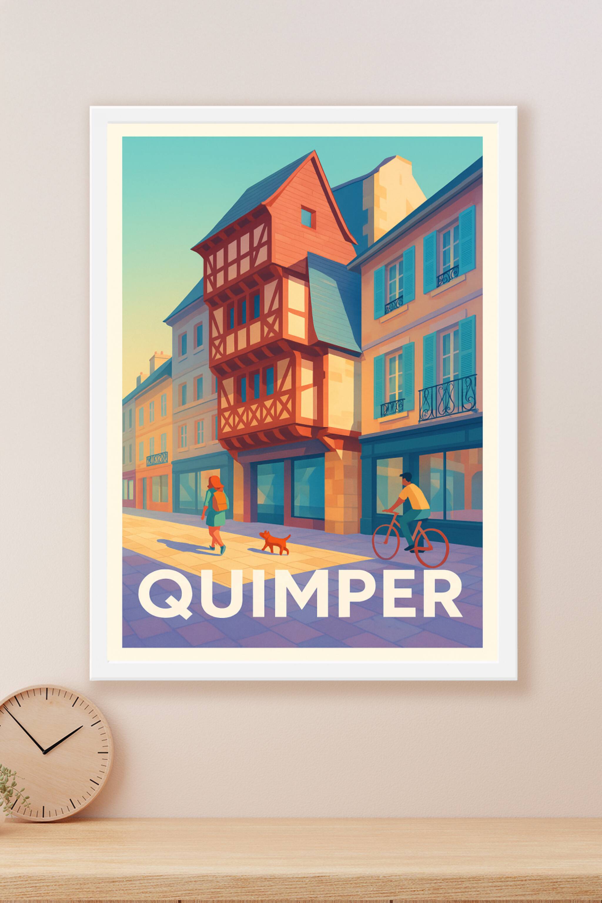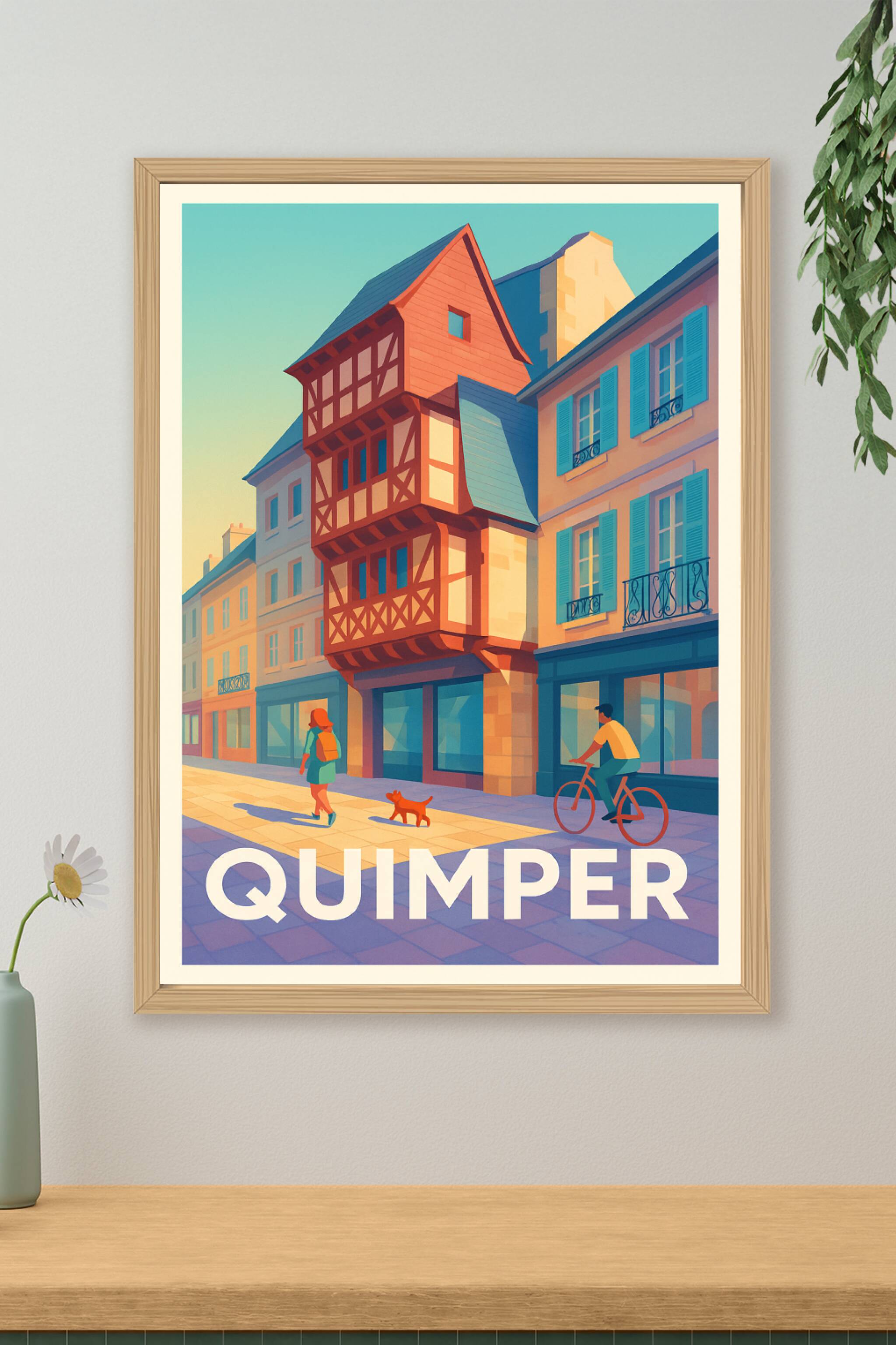 Découvrez l'atmosphère paisible et authentique de Quimper à travers cette affiche au style vintage modernisé. Le poster met en scène une rue emblém...
