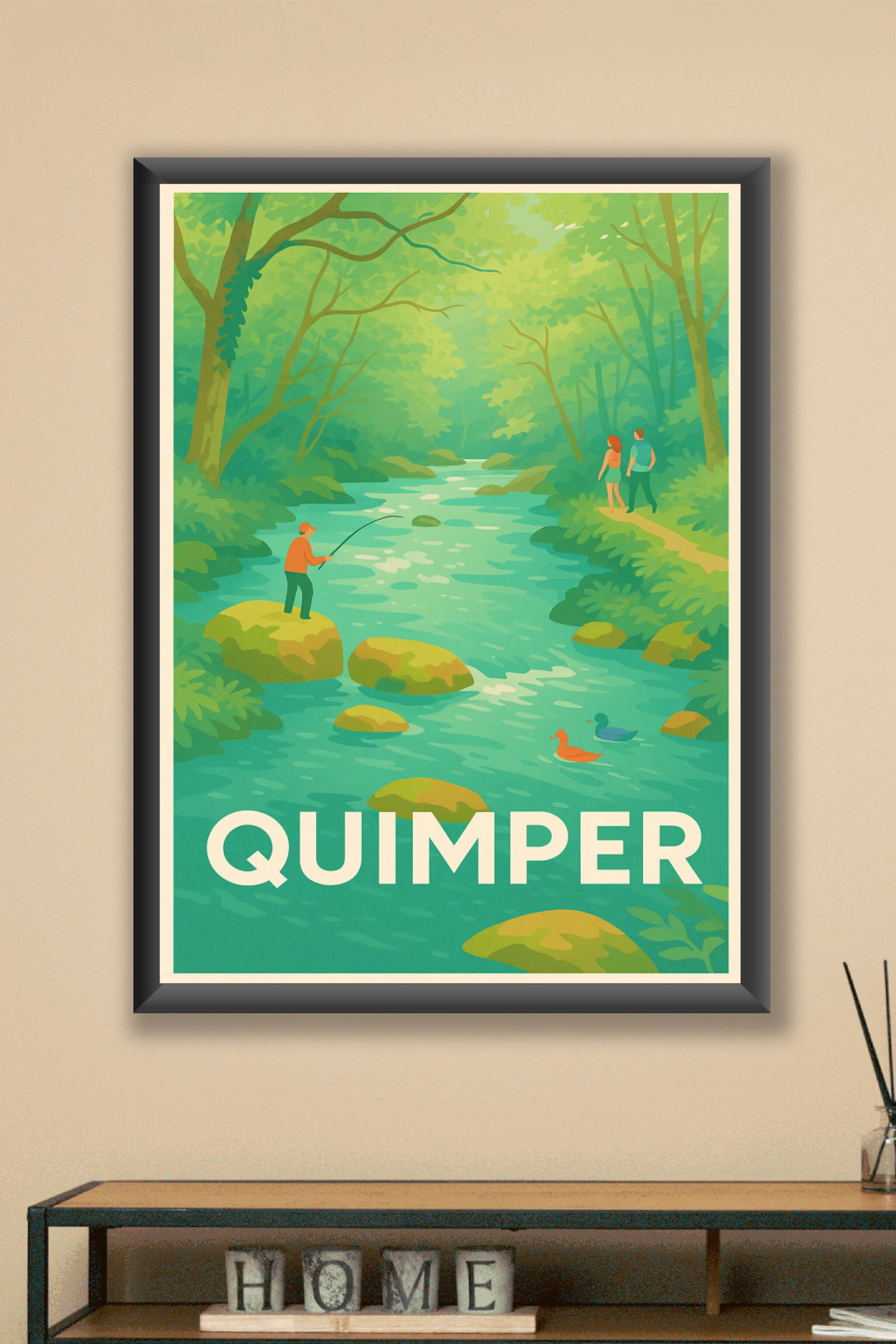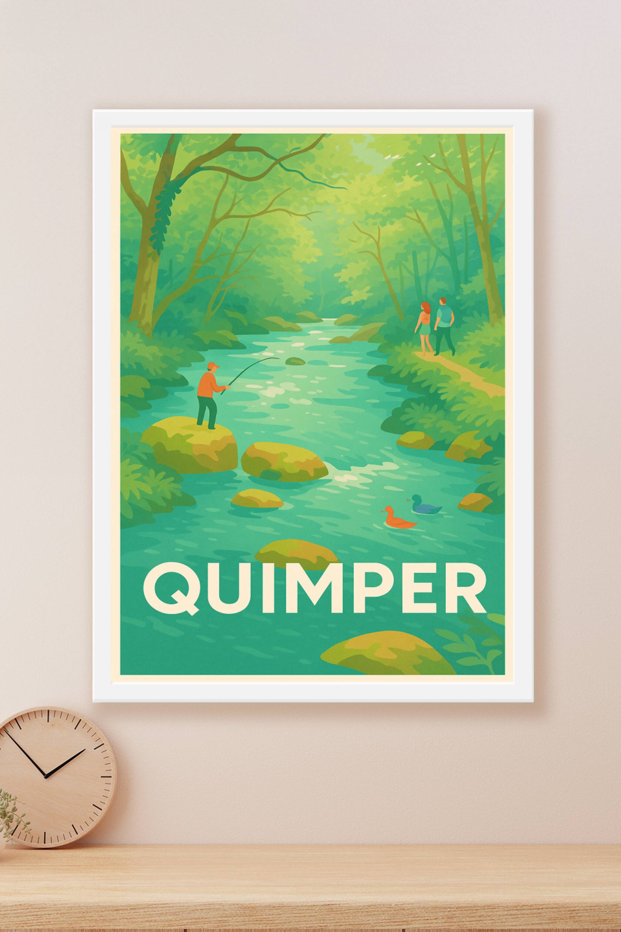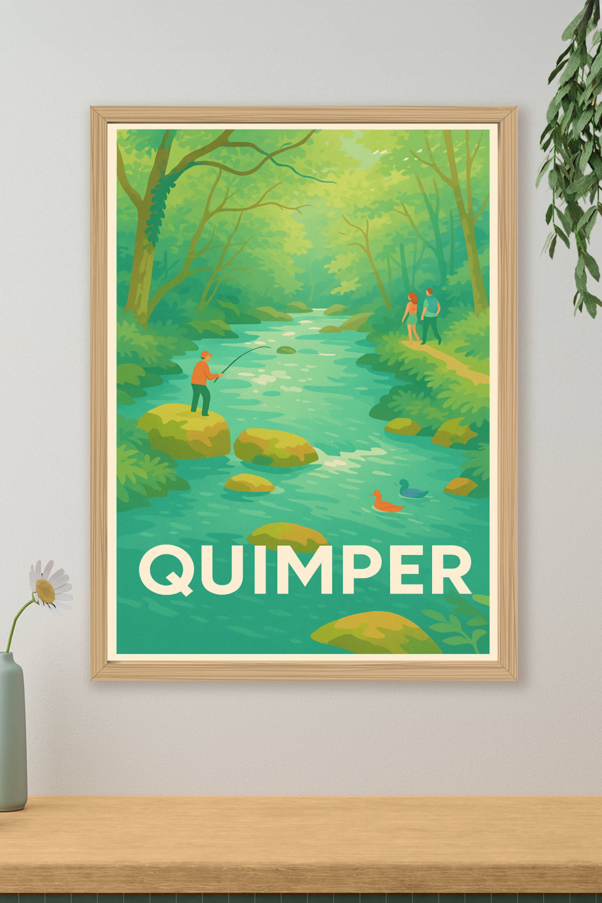 Découvrez le charme naturel de Quimper avec cette affiche illustrée qui capture un paisible moment le long d'une rivière verdoyante, en pleine natu...