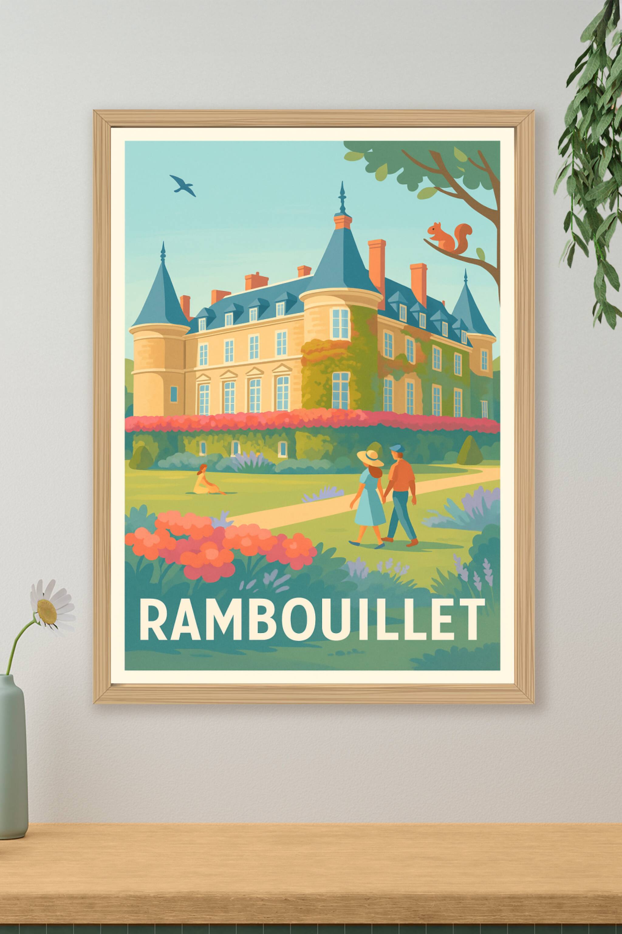 Découvrez la sérénité et le charme du château de Rambouillet illustré dans cette affiche au style doux et coloré. Cette scène paisible met en avant...