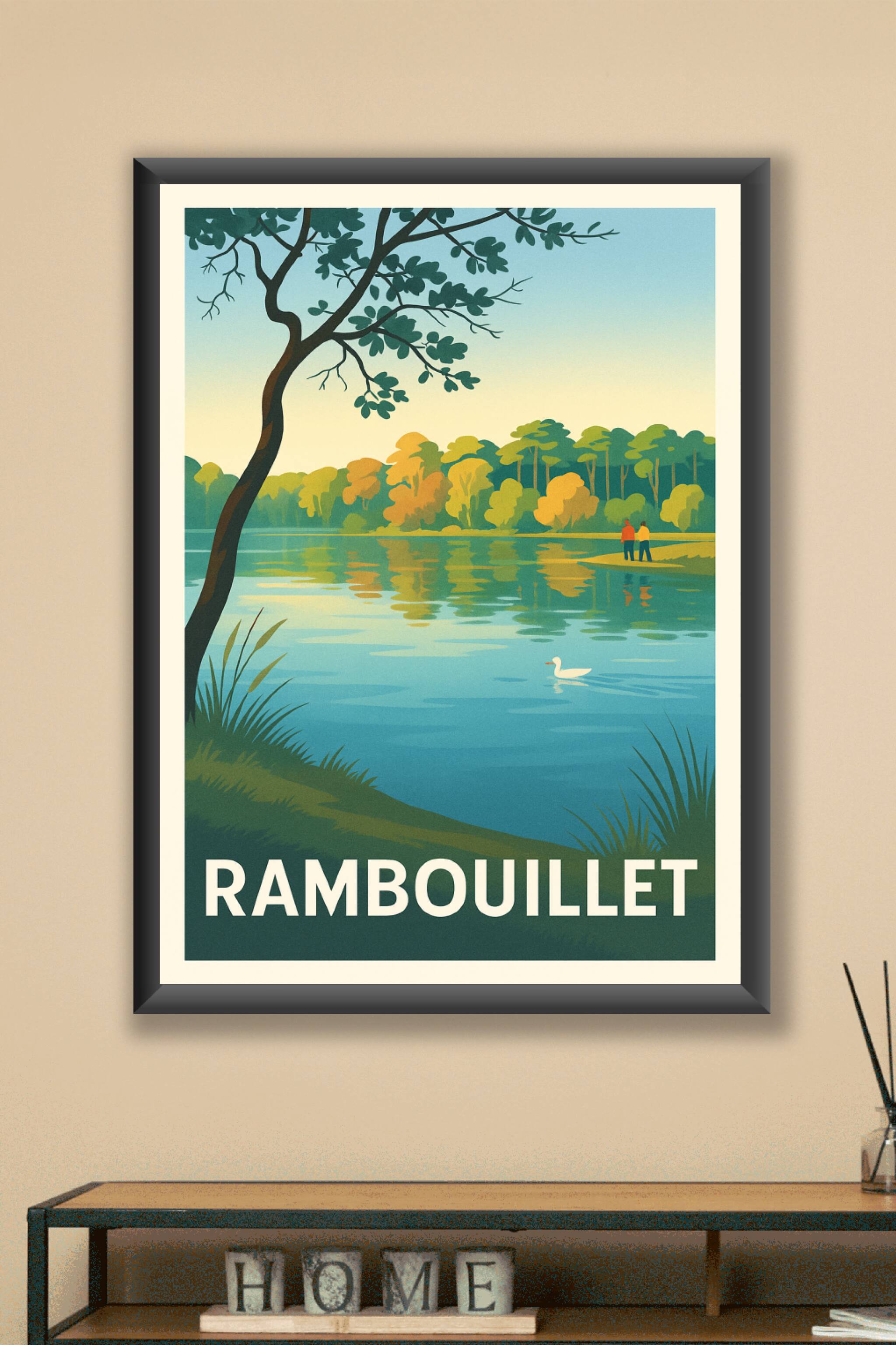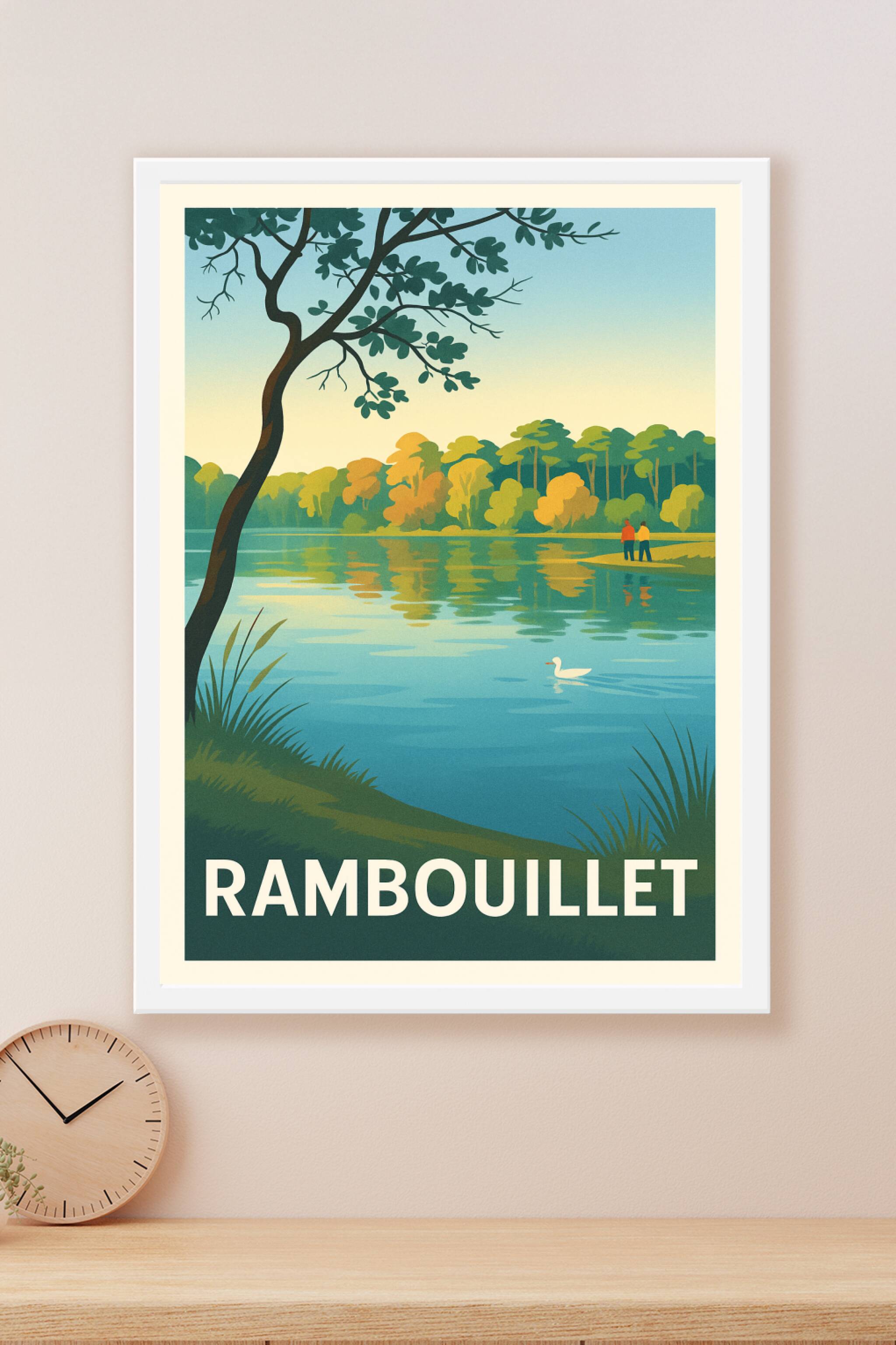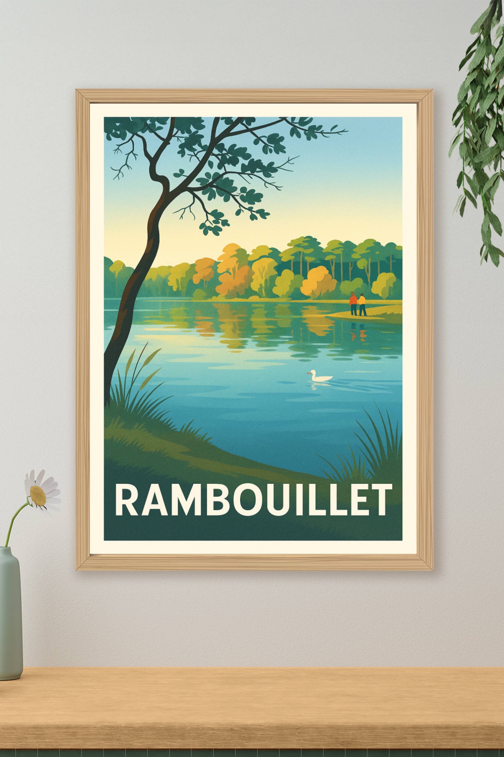 Découvrez la quiétude naturelle de Rambouillet avec cette magnifique affiche illustrée représentant un lac paisible, bordé d'arbres aux teintes aut...