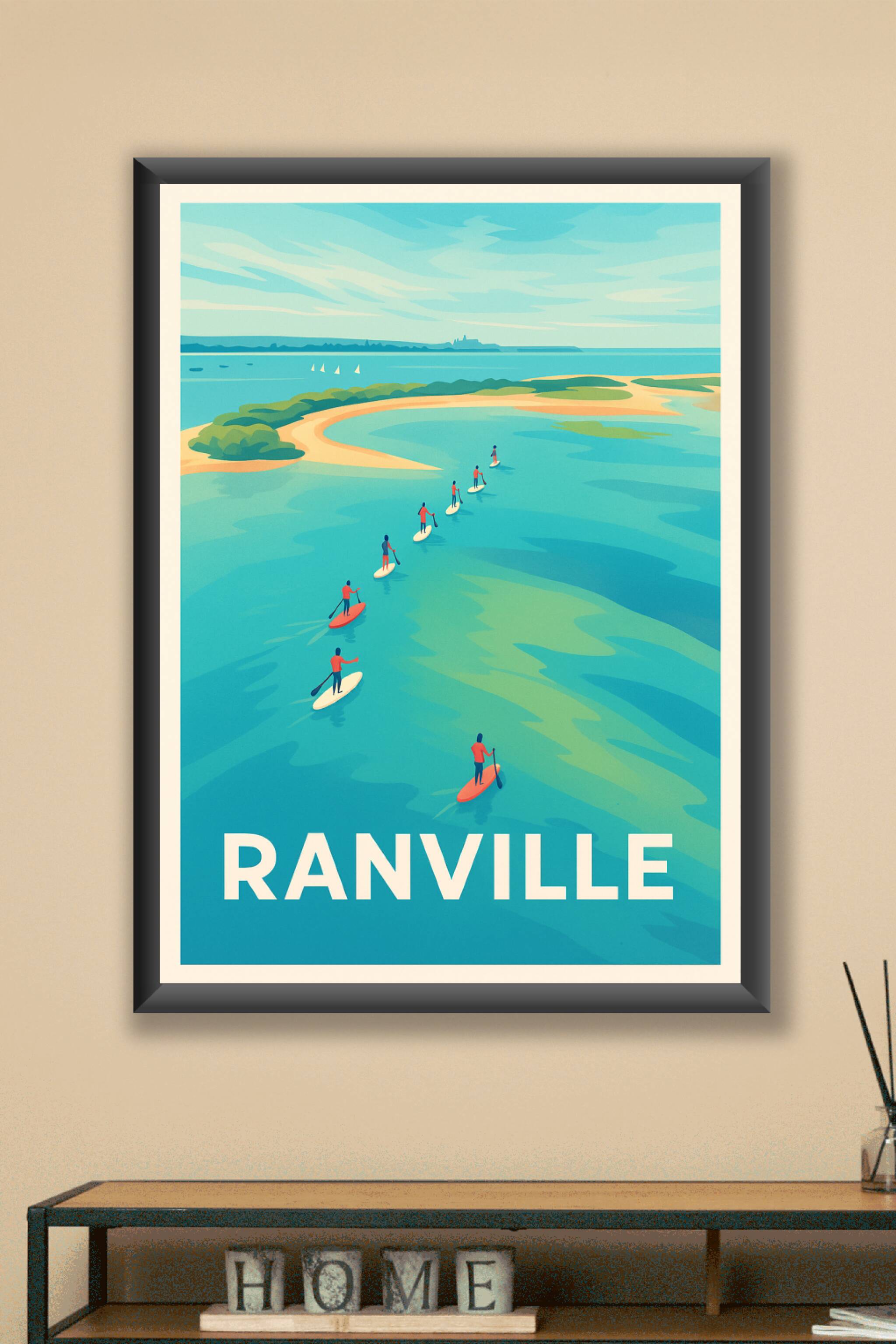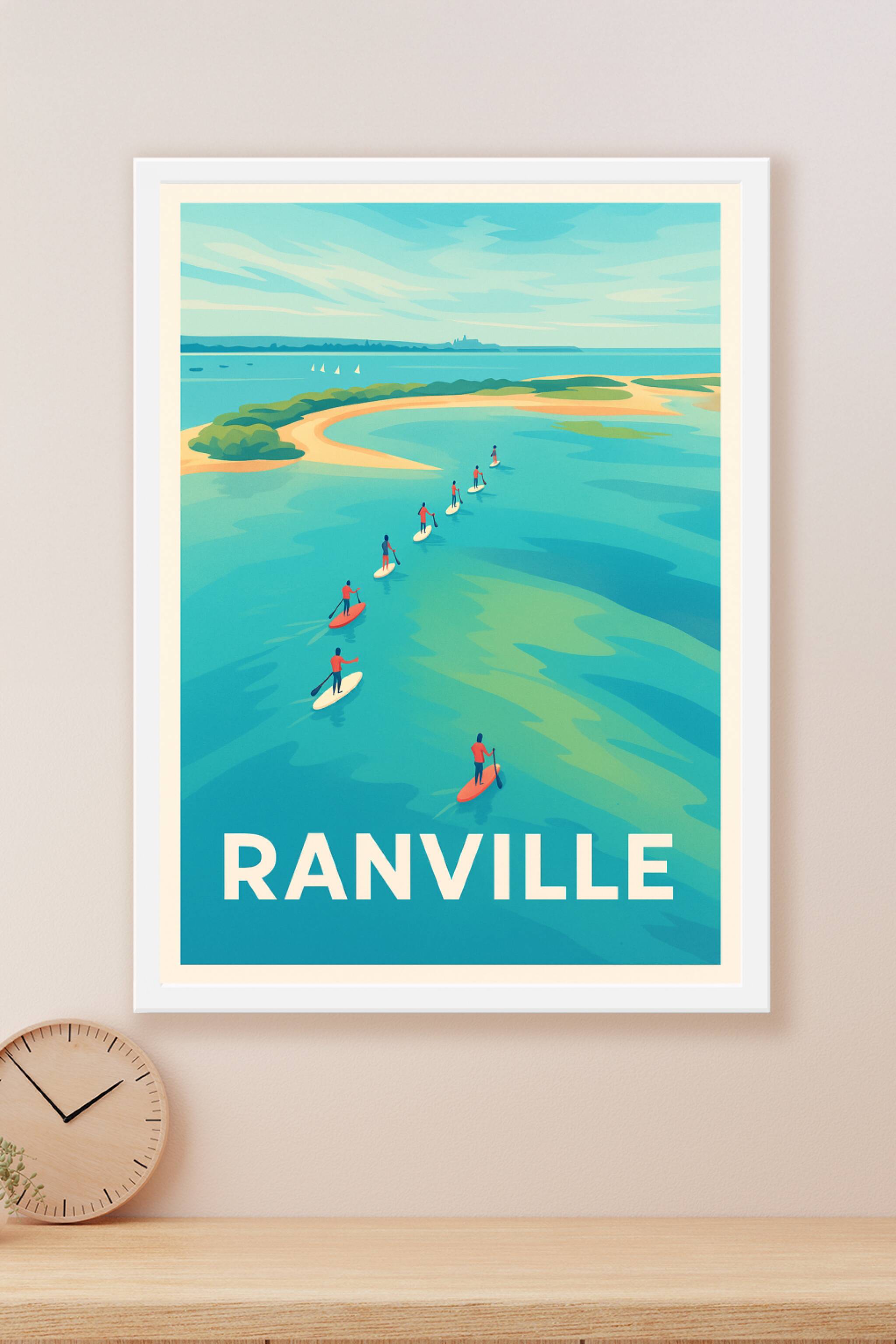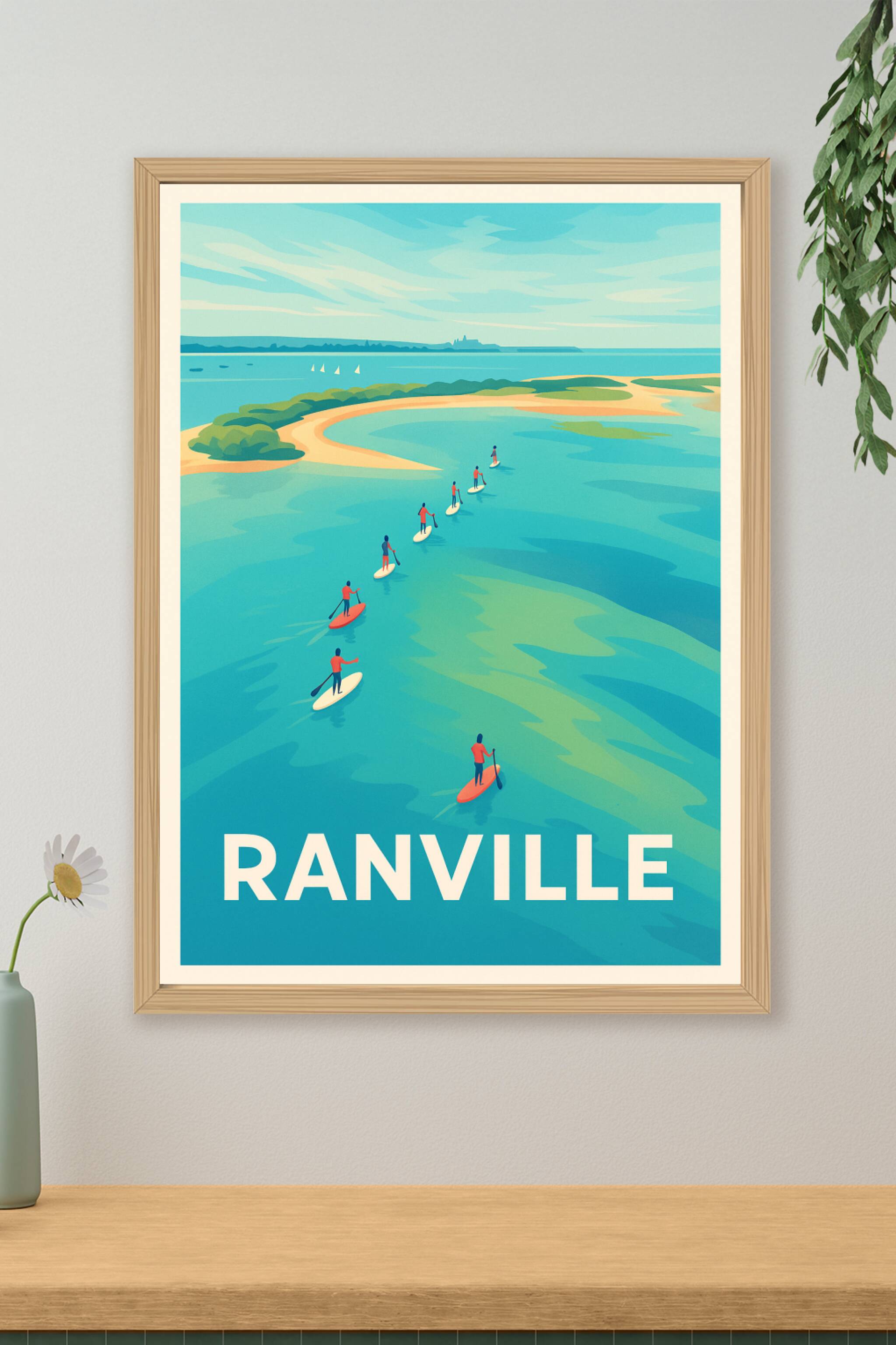Découvrez l'esprit paisible et nature de Ranville avec cette affiche illustrée représentant une séance de paddle sur des eaux calmes et turquoise, ...