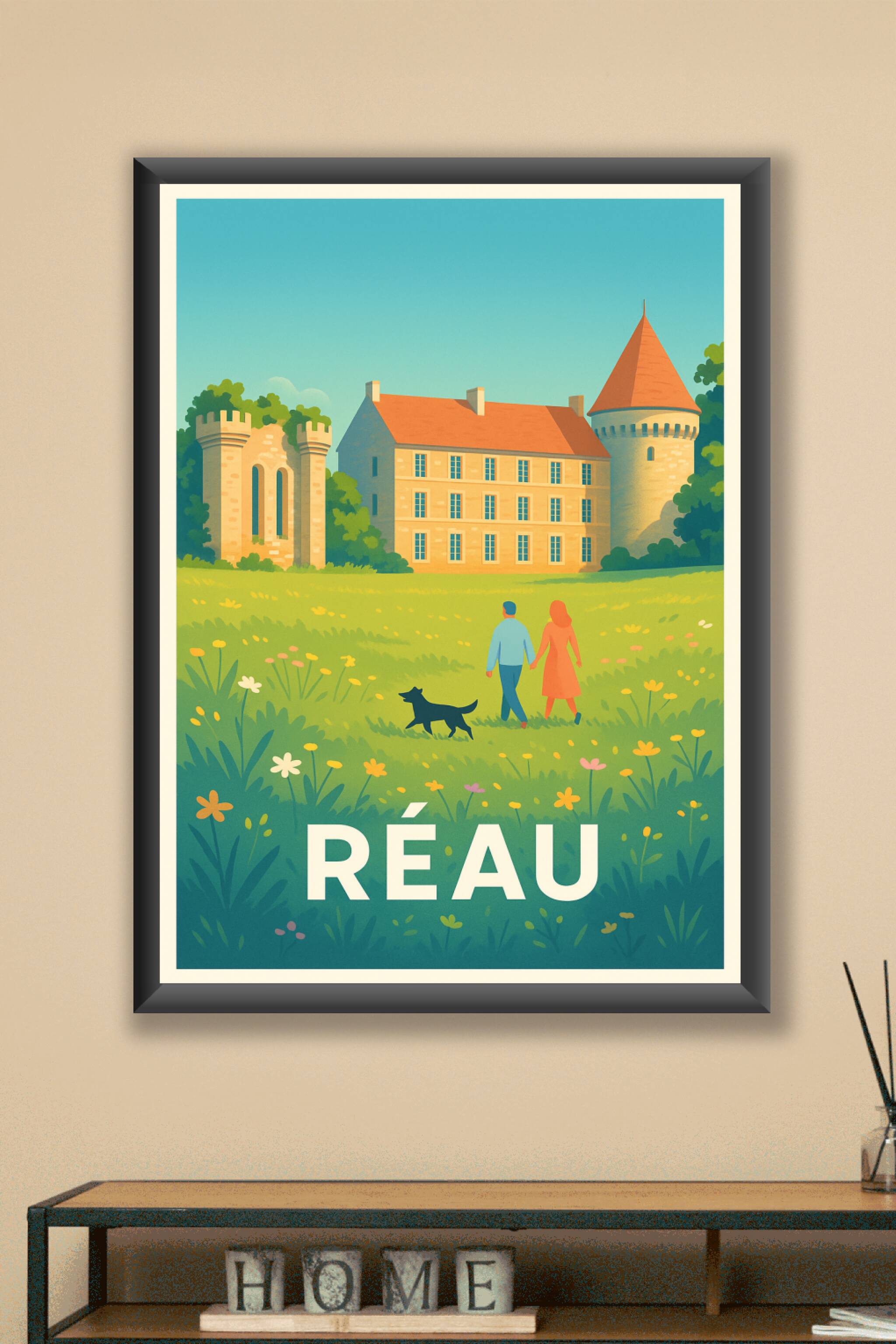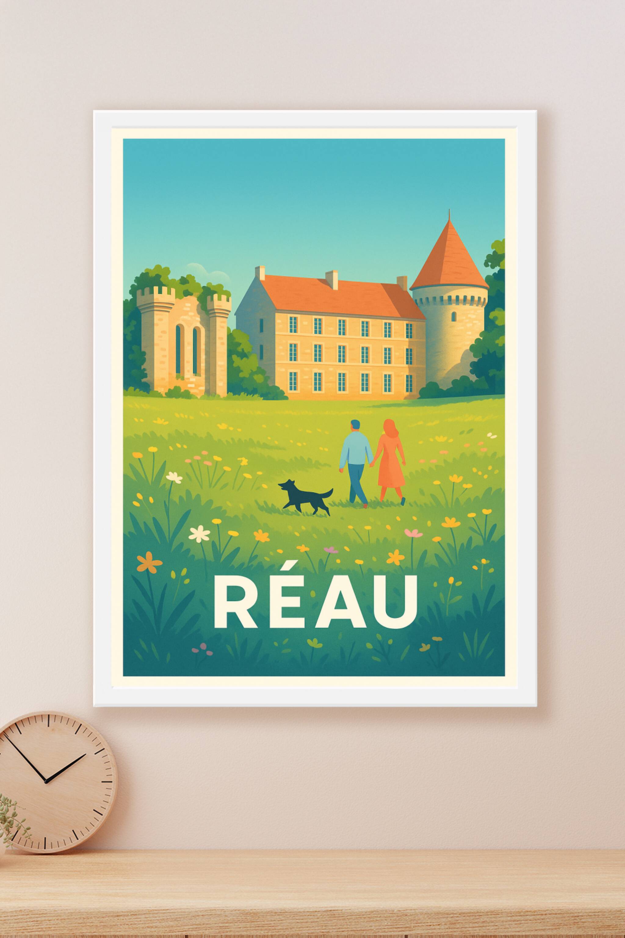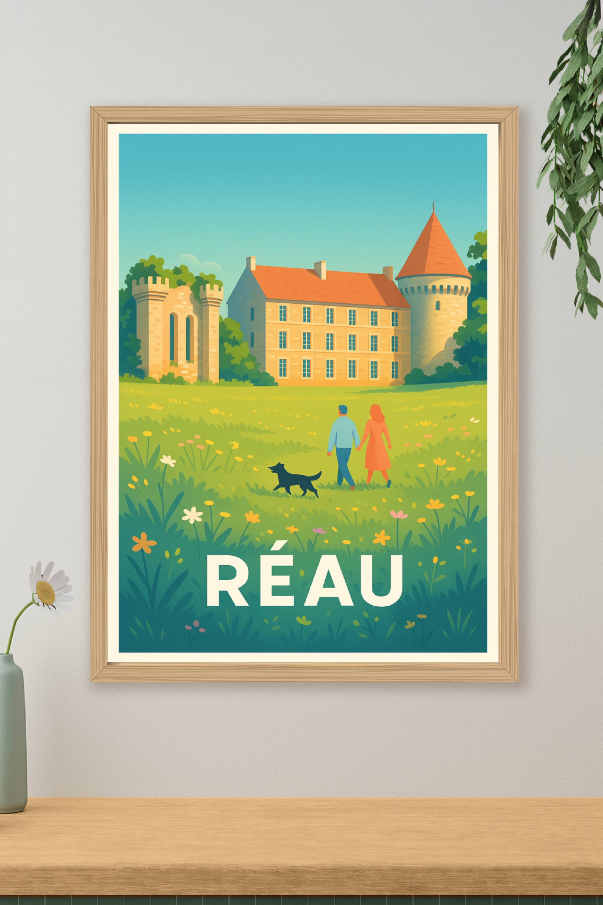 Découvrez la sérénité et le charme bucolique de Réau avec cette affiche illustrée, mettant en scène un couple et leur chien flânant dans un champ f...