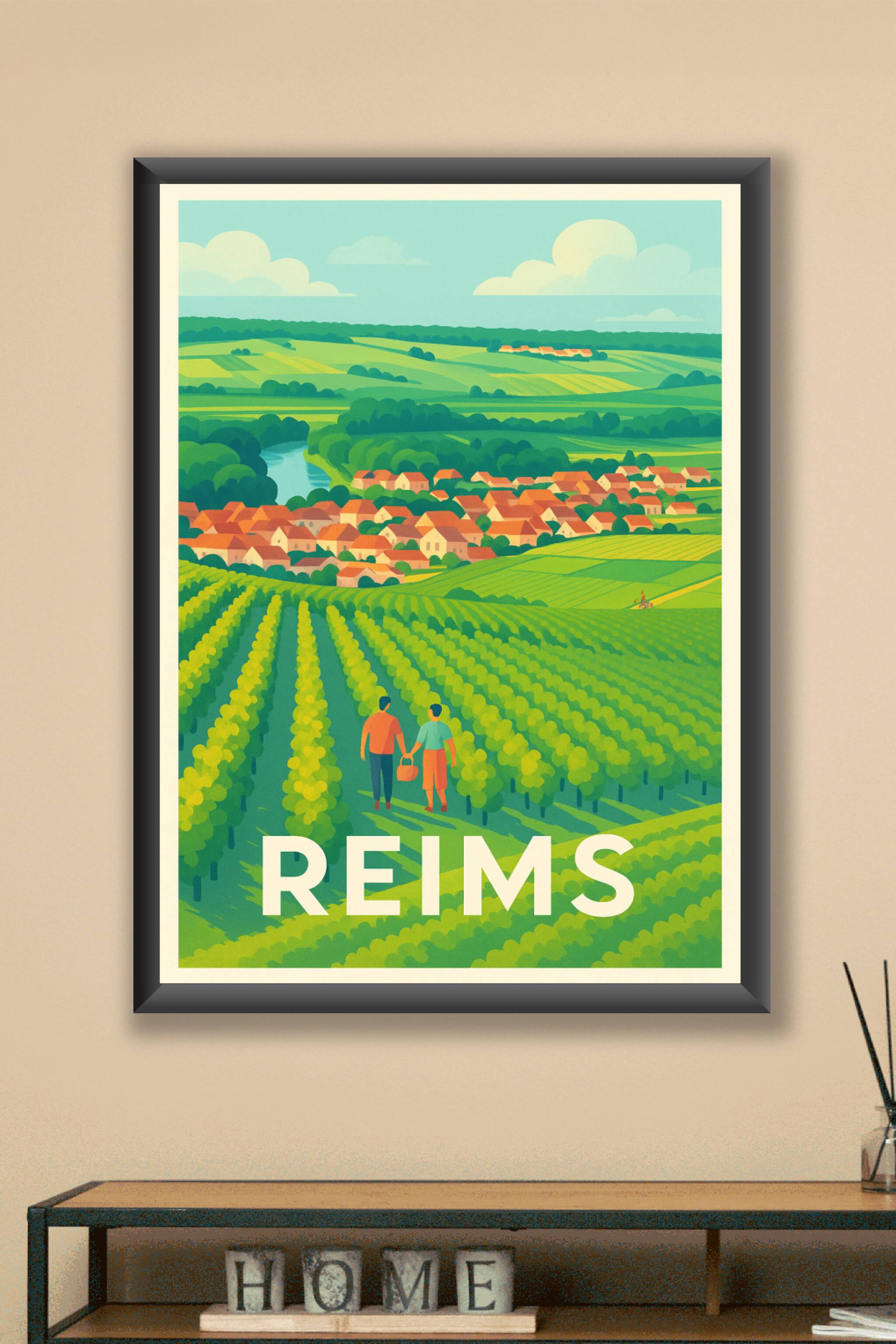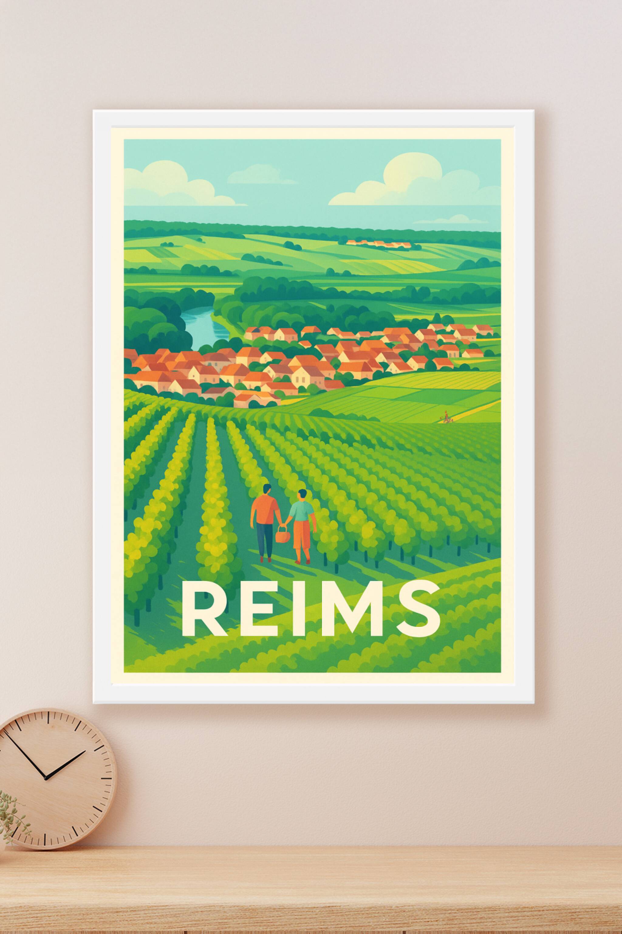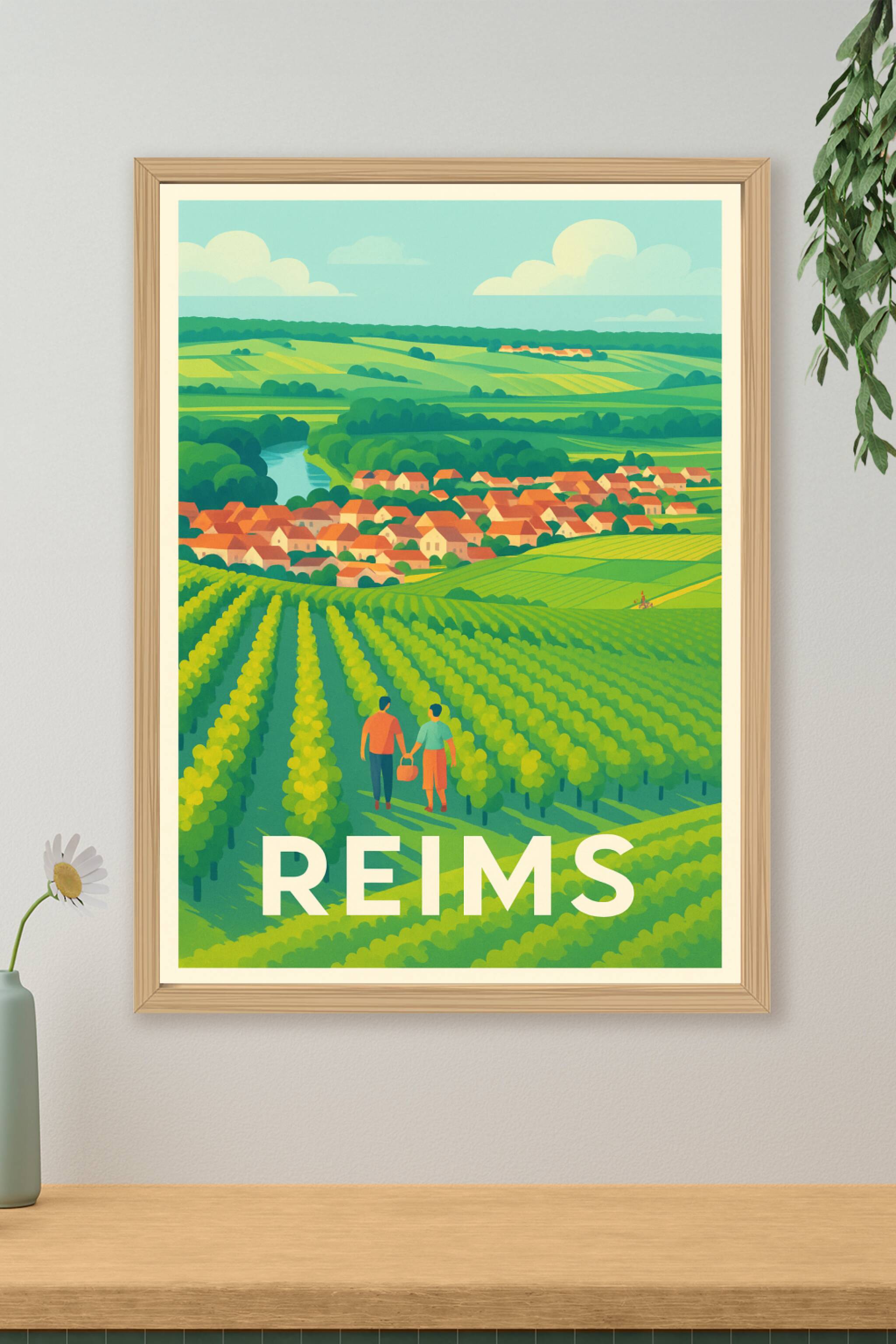 Offrez-vous un voyage visuel au sein des paysages iconiques de Reims avec cette affiche illustrée mettant en valeur ses vastes vignobles et son atm...