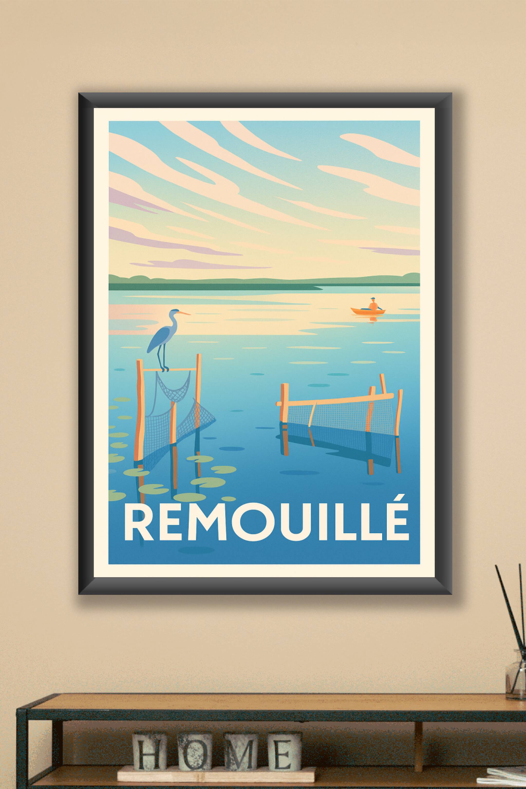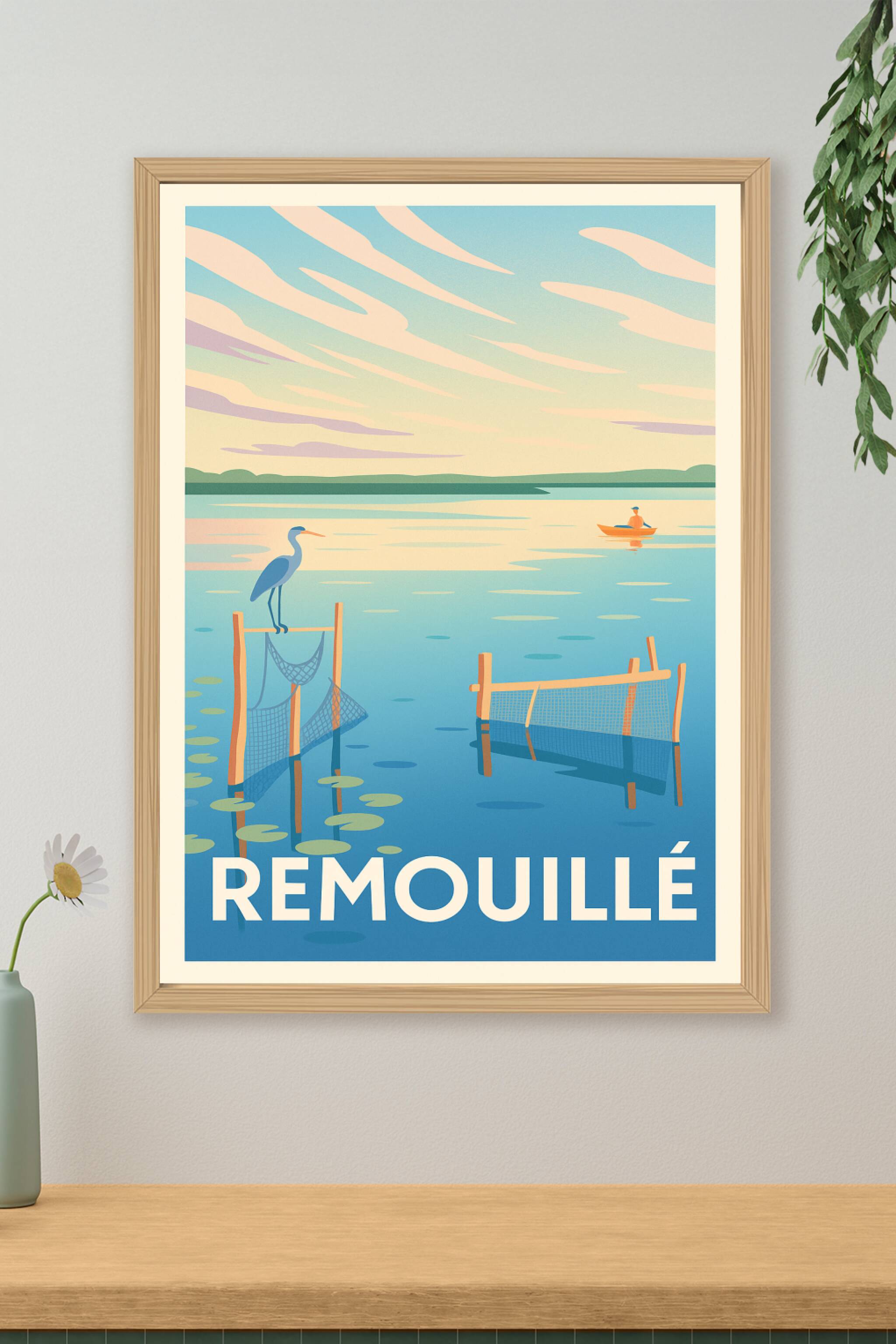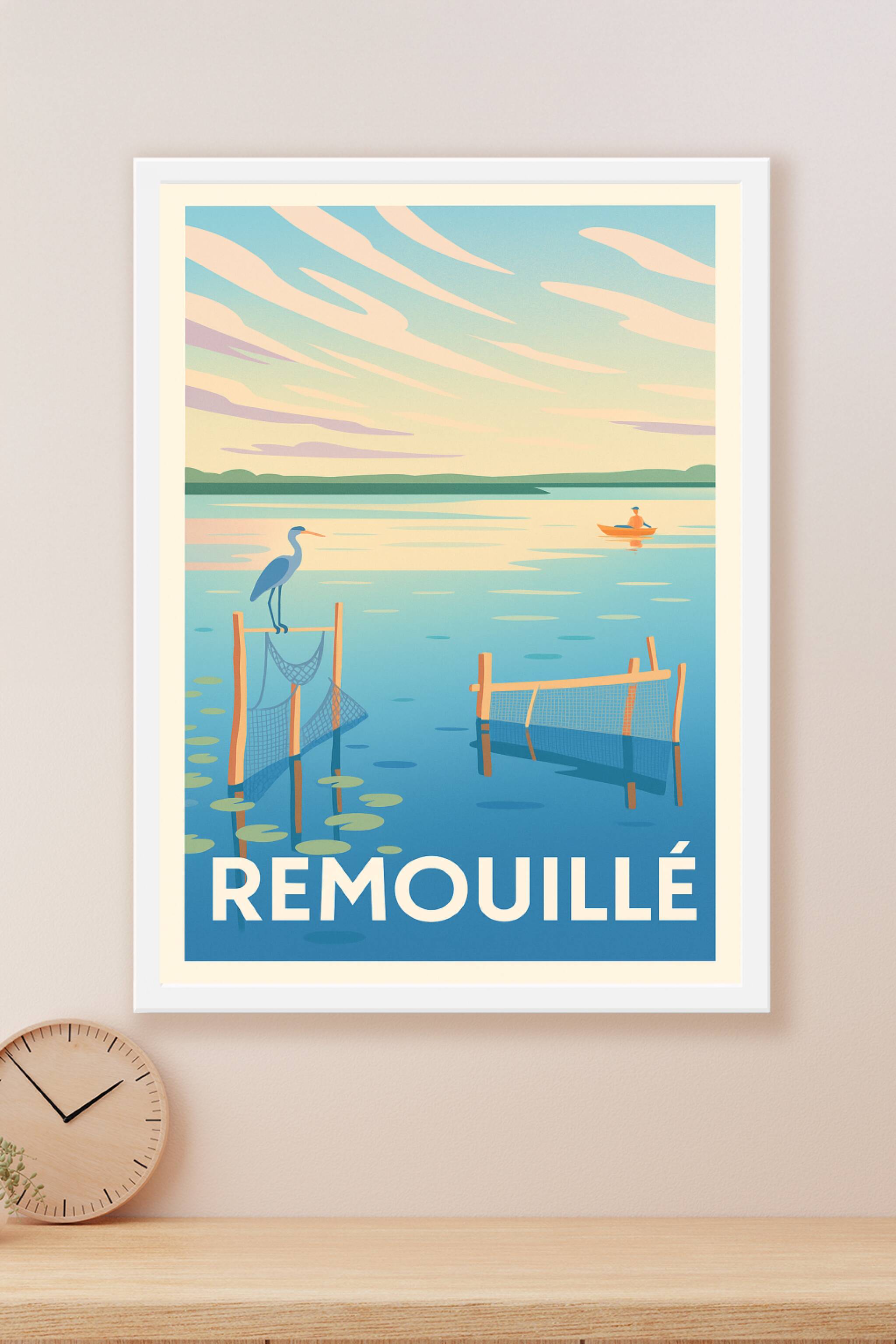Découvrez la tranquillité apaisante de Remouillé avec cette affiche au style vintage épuré. Le poster met en scène un paysage aquatique où un héron...