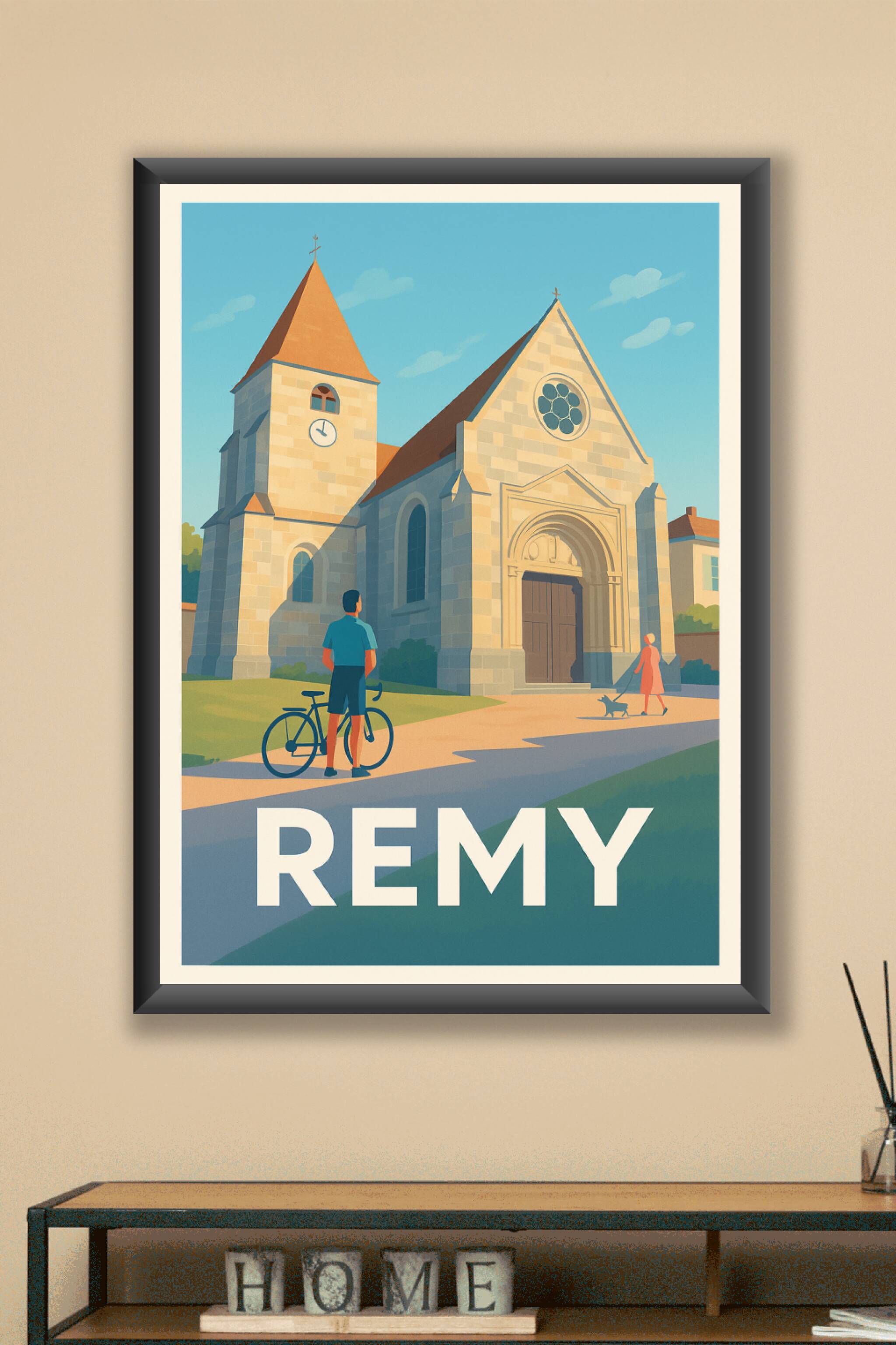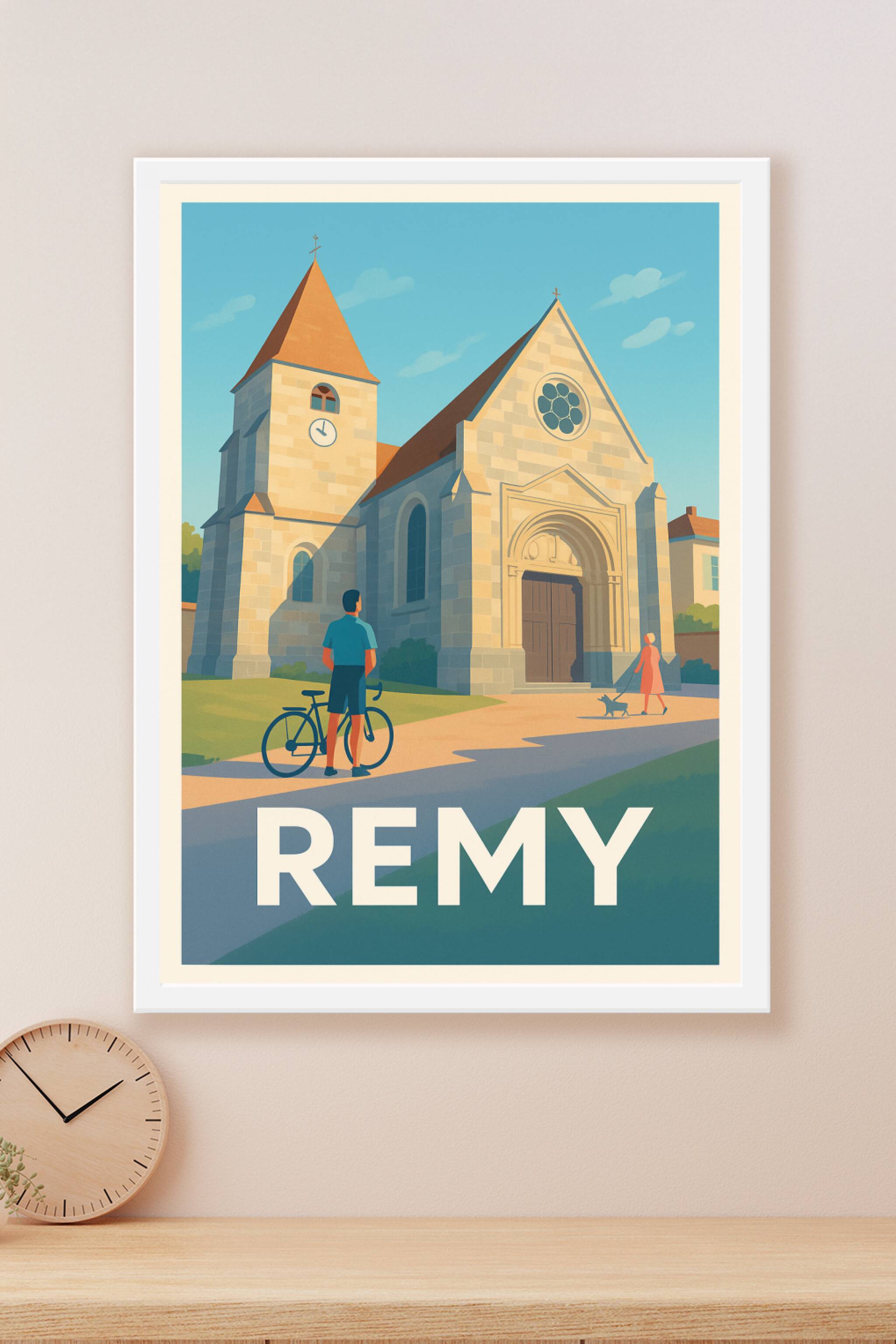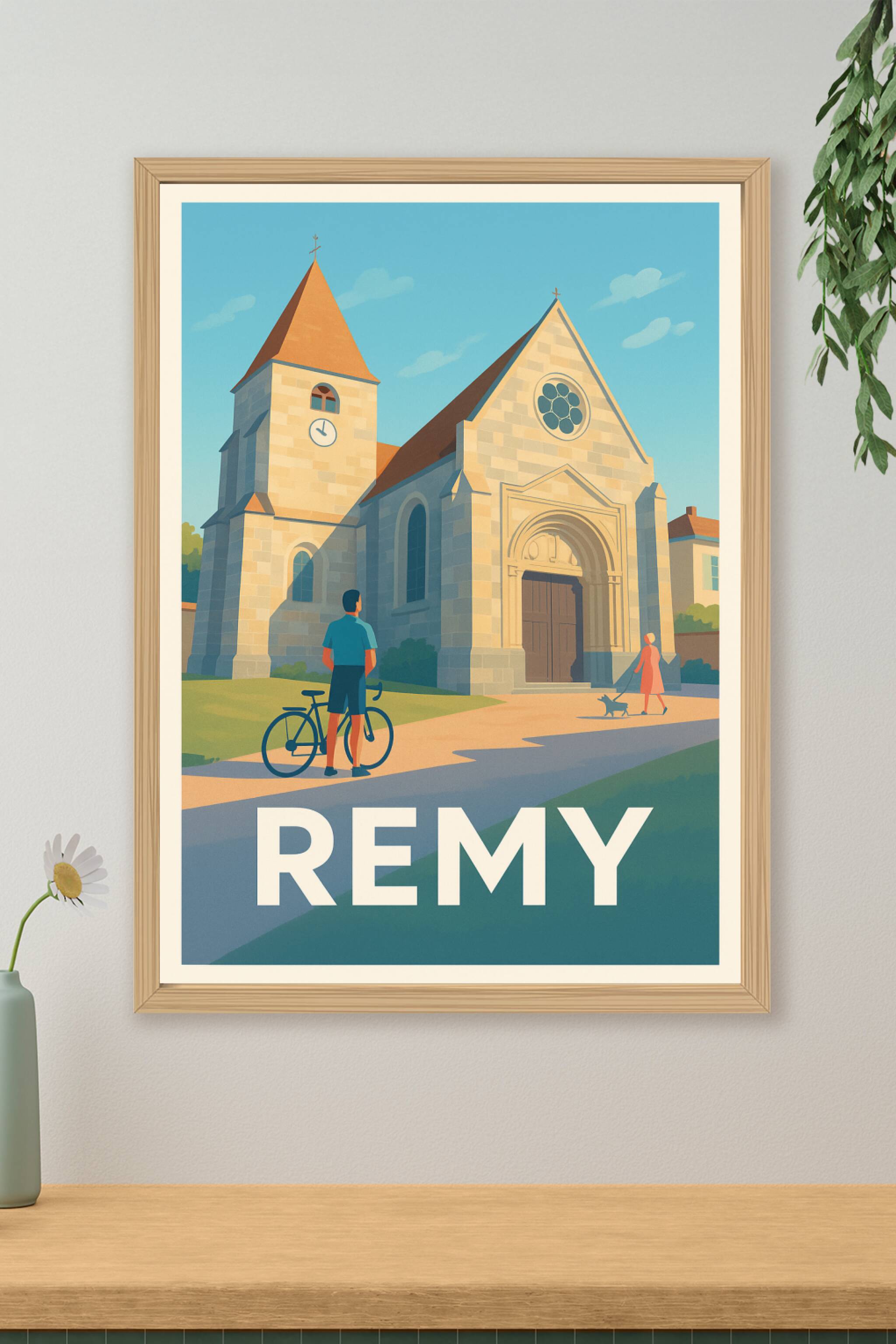 Découvrez la douceur de vivre de Remy à travers cette magnifique affiche illustrée mettant en valeur l'architecture intemporelle de son église et l...