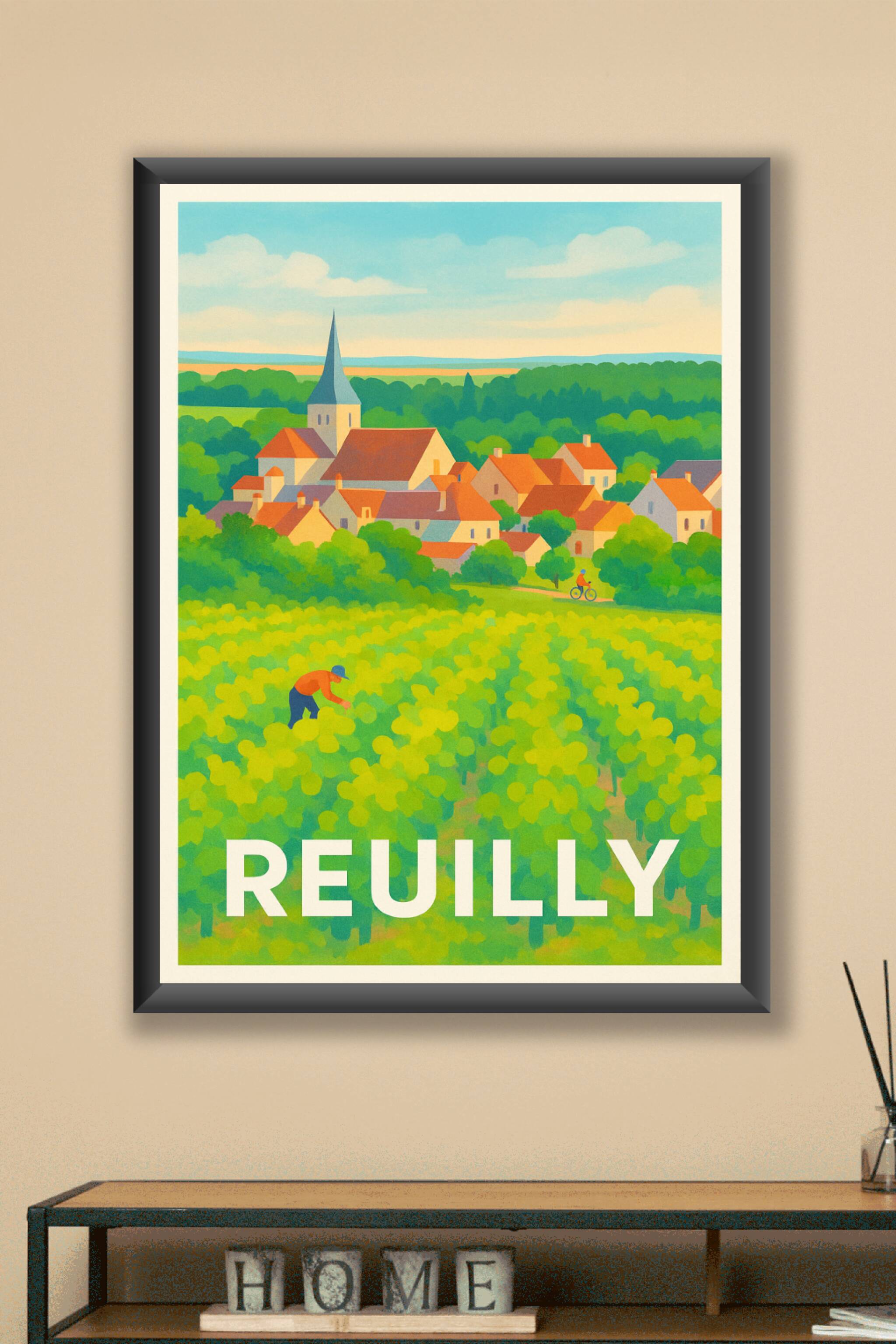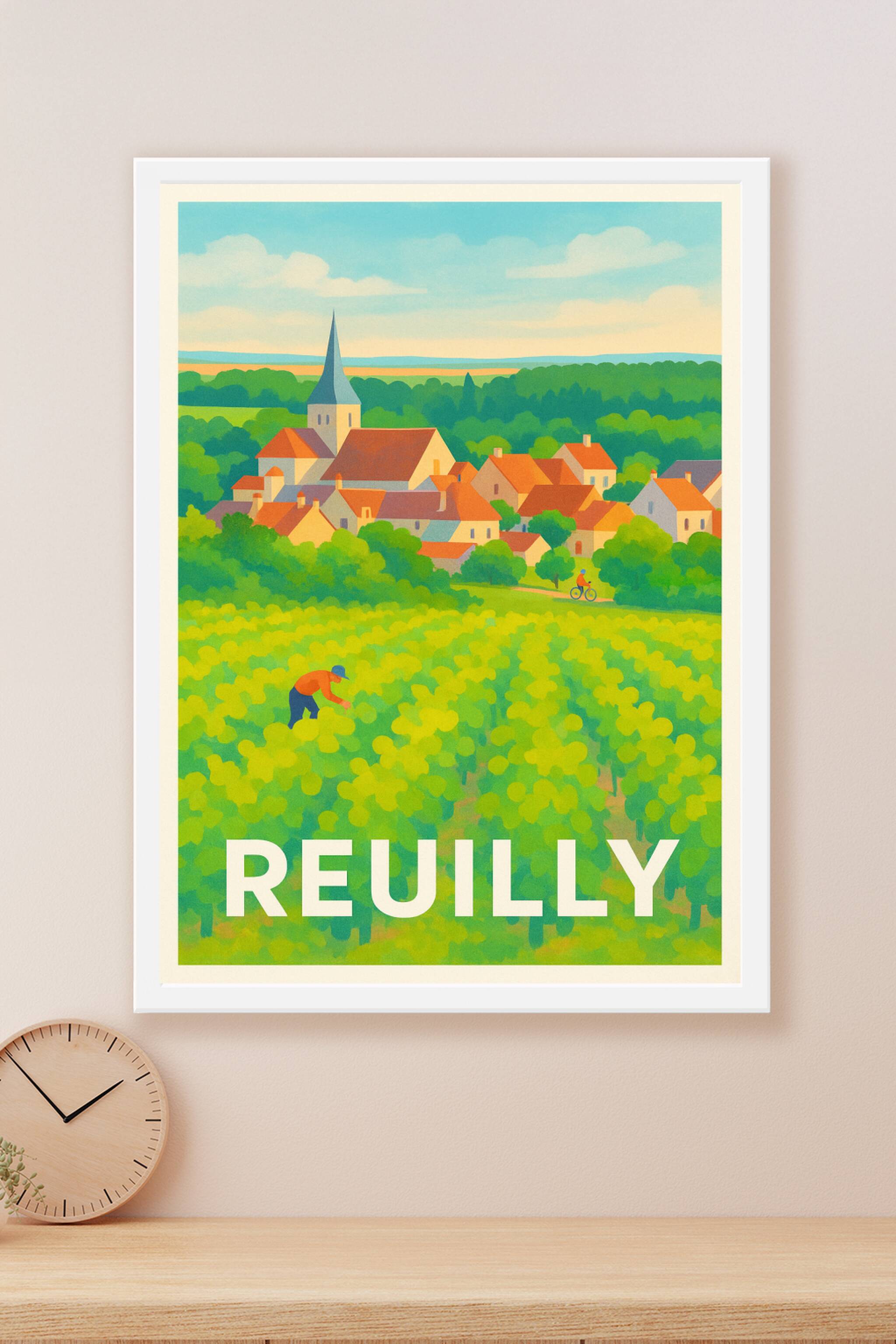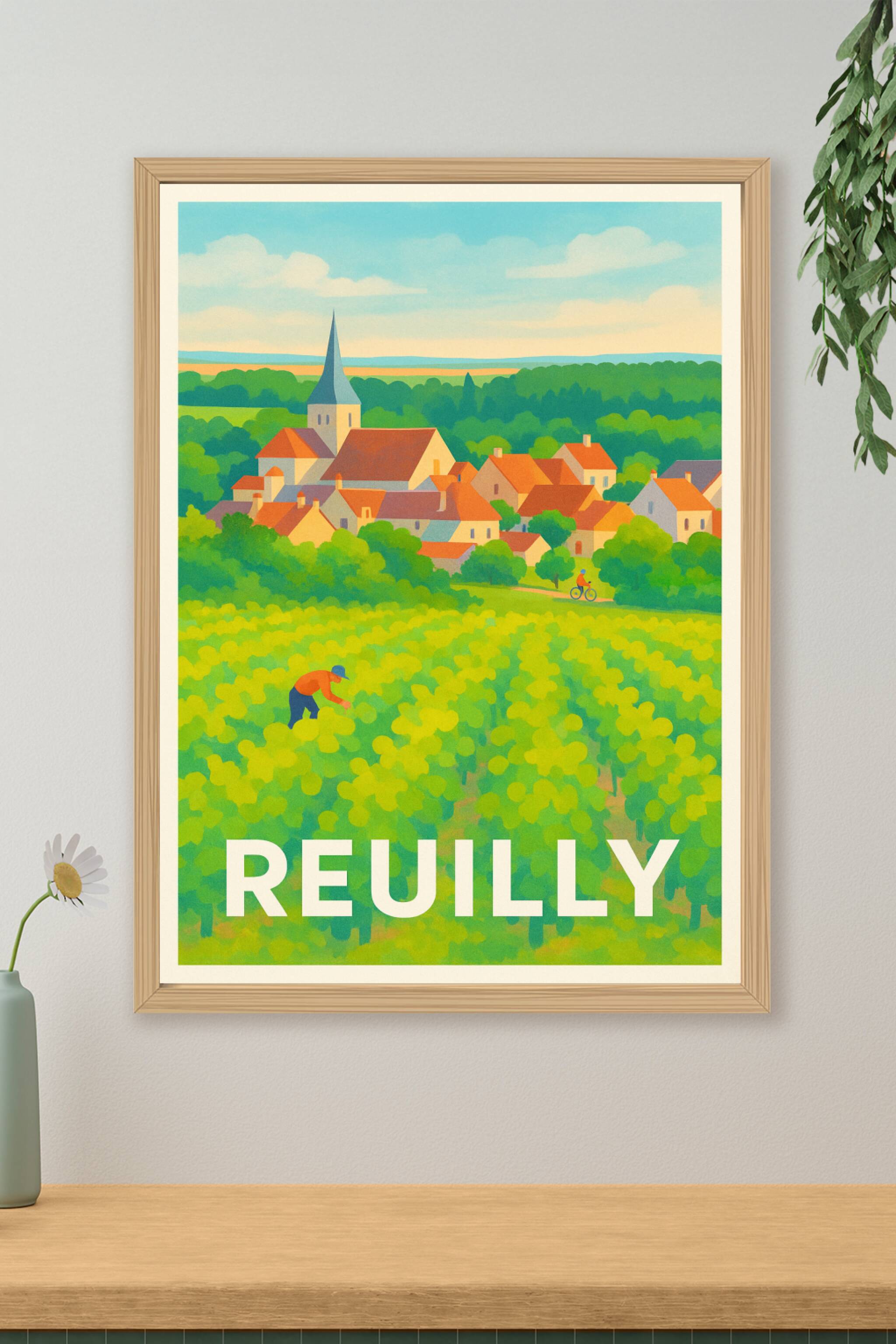 Cette affiche représentant Reuilly capture avec douceur l'essence d'un village viticole pittoresque au cœur de la campagne française. Les vignobles...