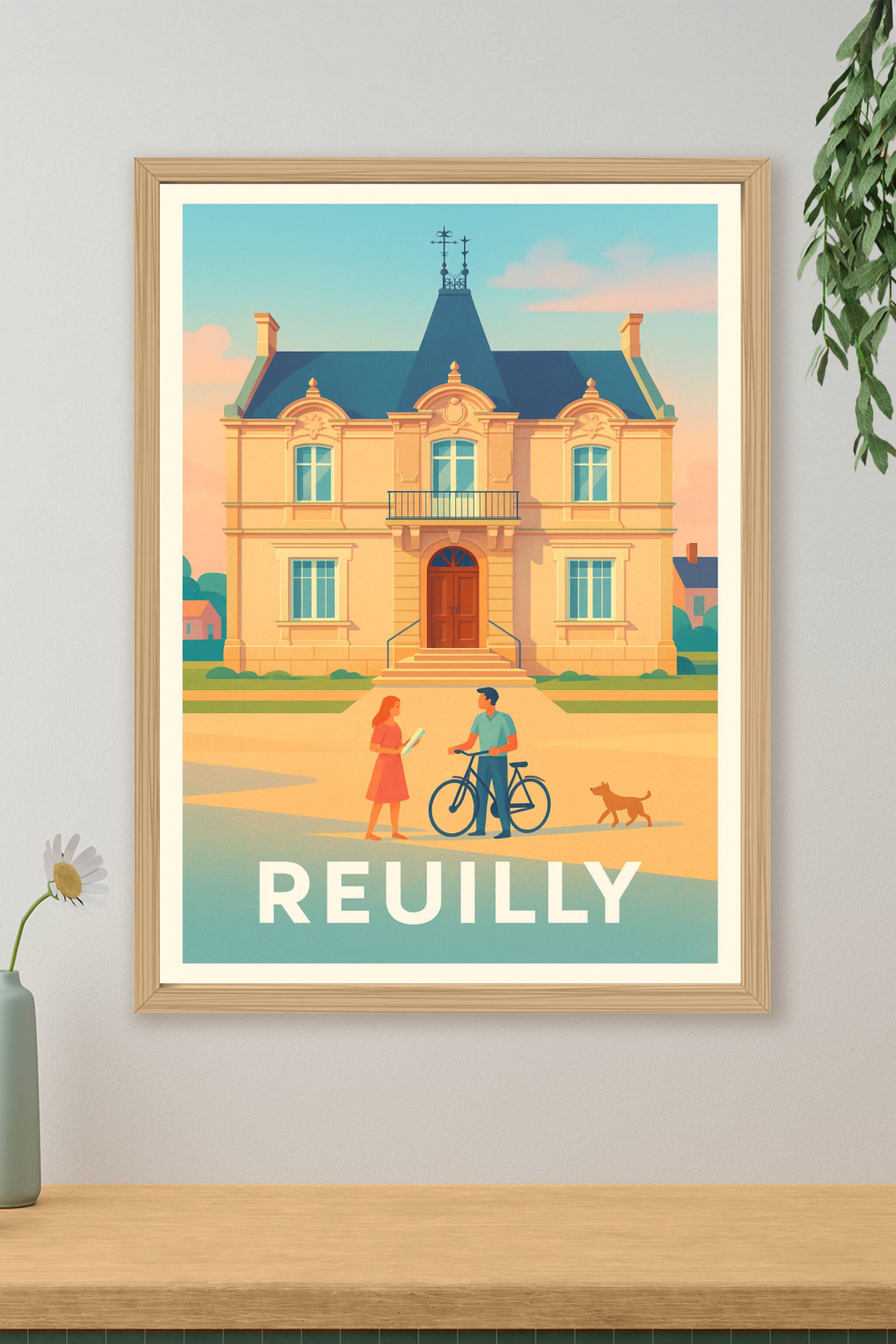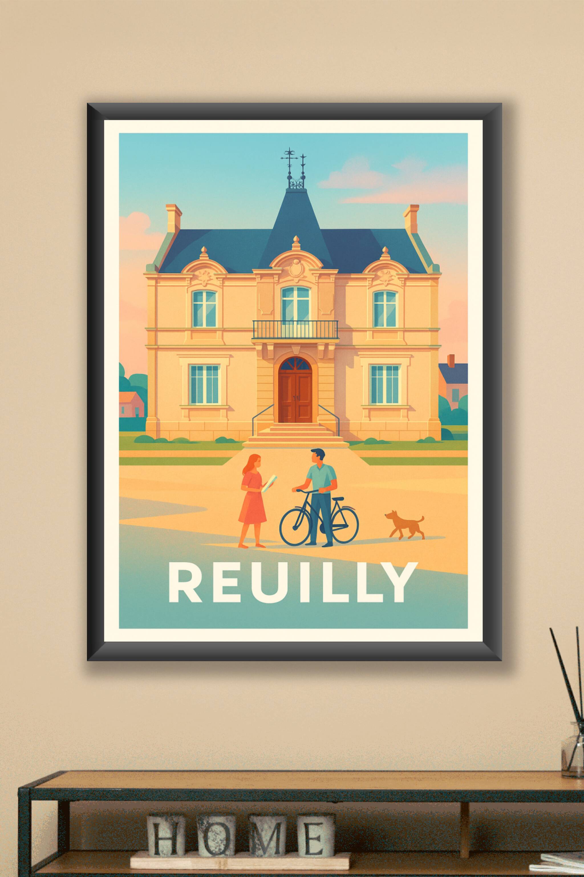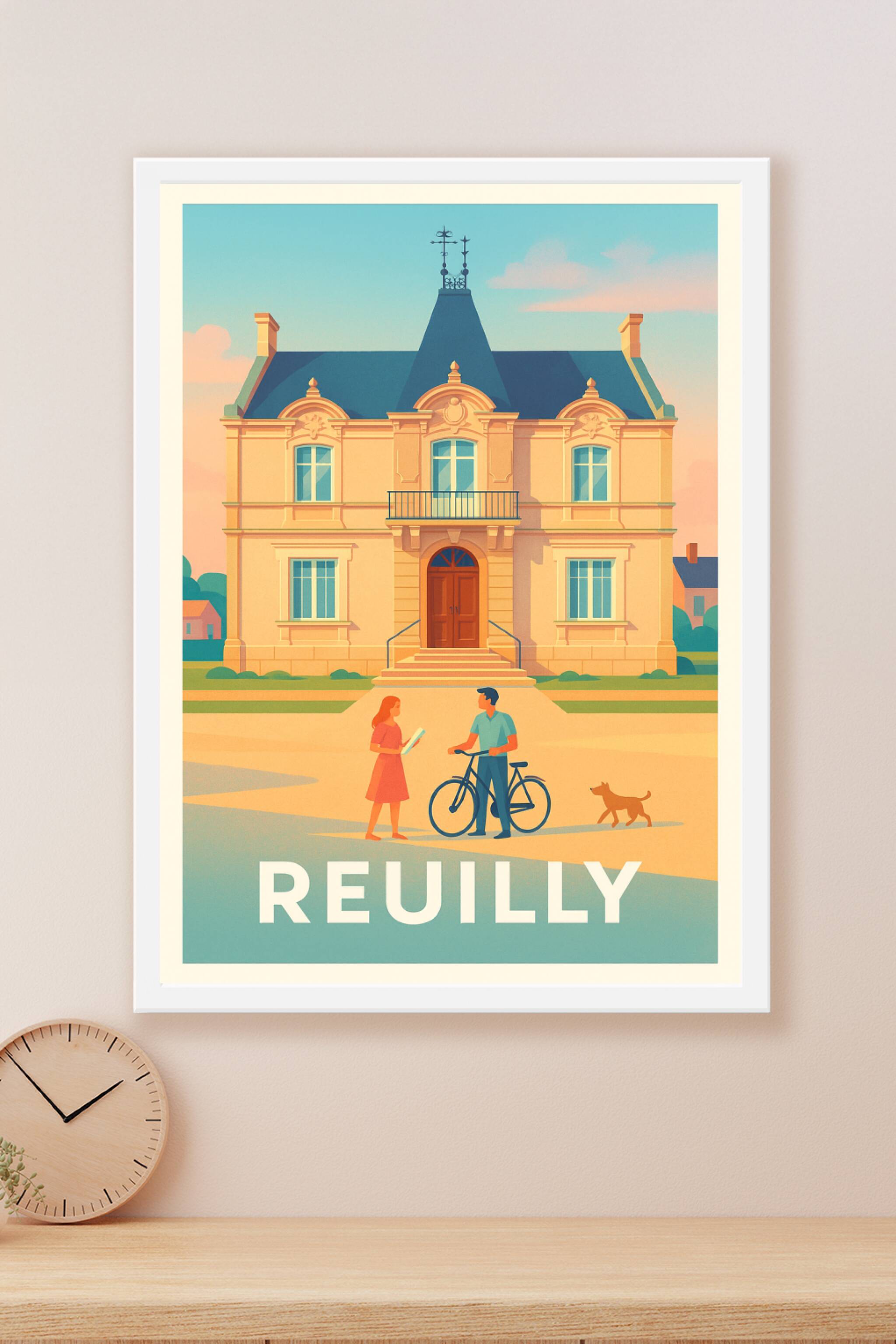 Découvrez l'essence du charme de Reuilly avec cette affiche au style vintage et lumineux. Cette illustration met en scène une maison bourgeoise typique, baignée d'une douce lumière dorée, avec un couple et leur chien pour une ambiance conviviale et pleine de vie. Ce poster de qualité supérieure est imprimé en tirage "Fine Art" sur papier 305g coton, garantissant des couleurs riches et un rendu exceptionnel. Disponible en formats A1 à A4, avec ou sans cadre, cette affiche est idéale pour apporter une touche d'élégance et de douceur à votre intérieur. Offrez-vous ou à vos proches une œuvre d'art premium, 100% imprimée en France, qui invite à l'évasion et à la découverte de la belle ville de Reuilly.