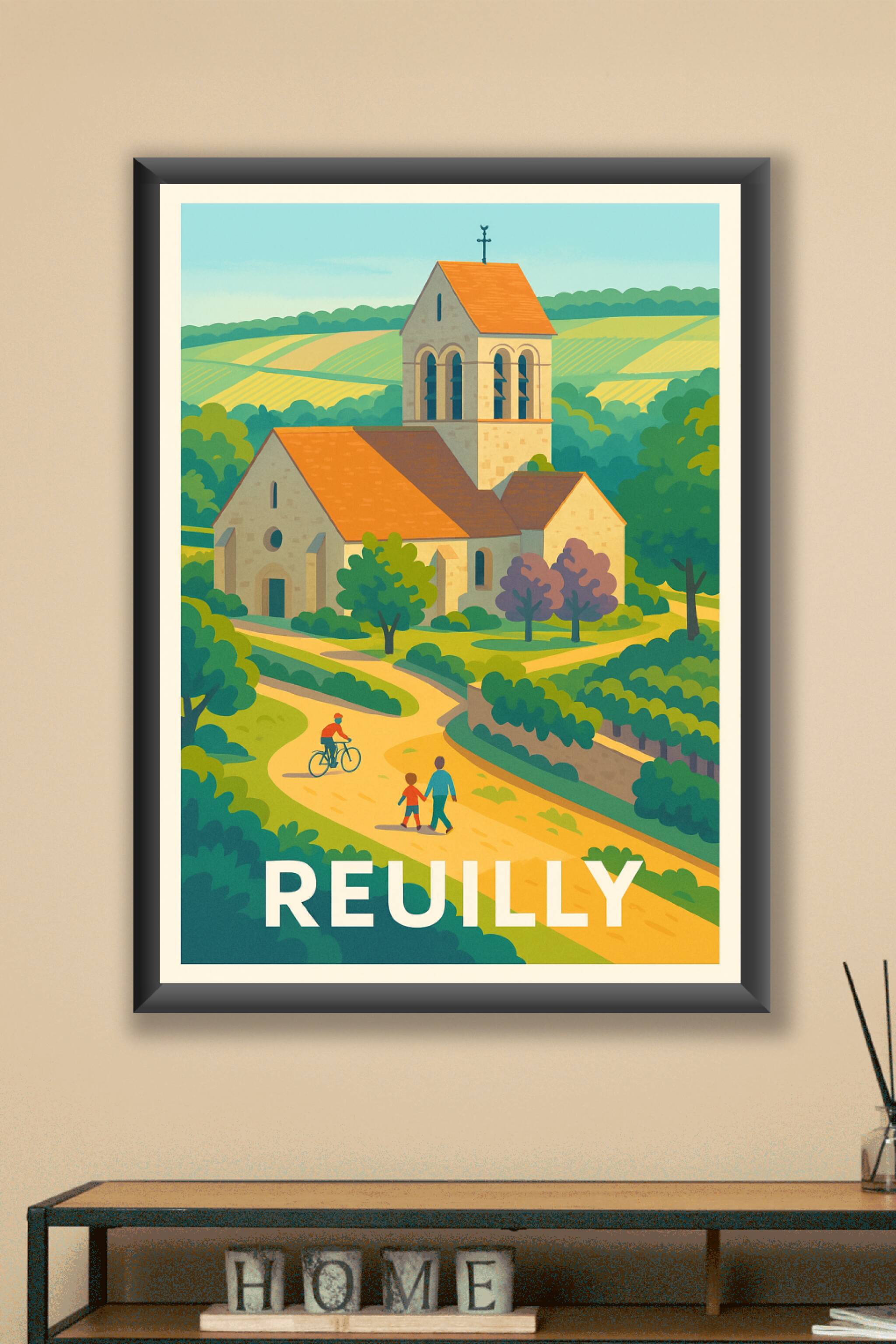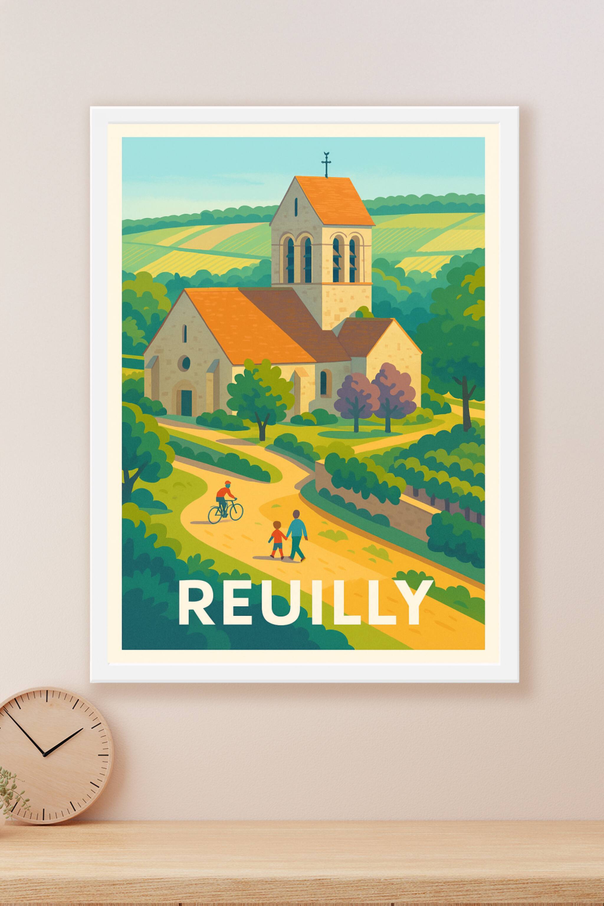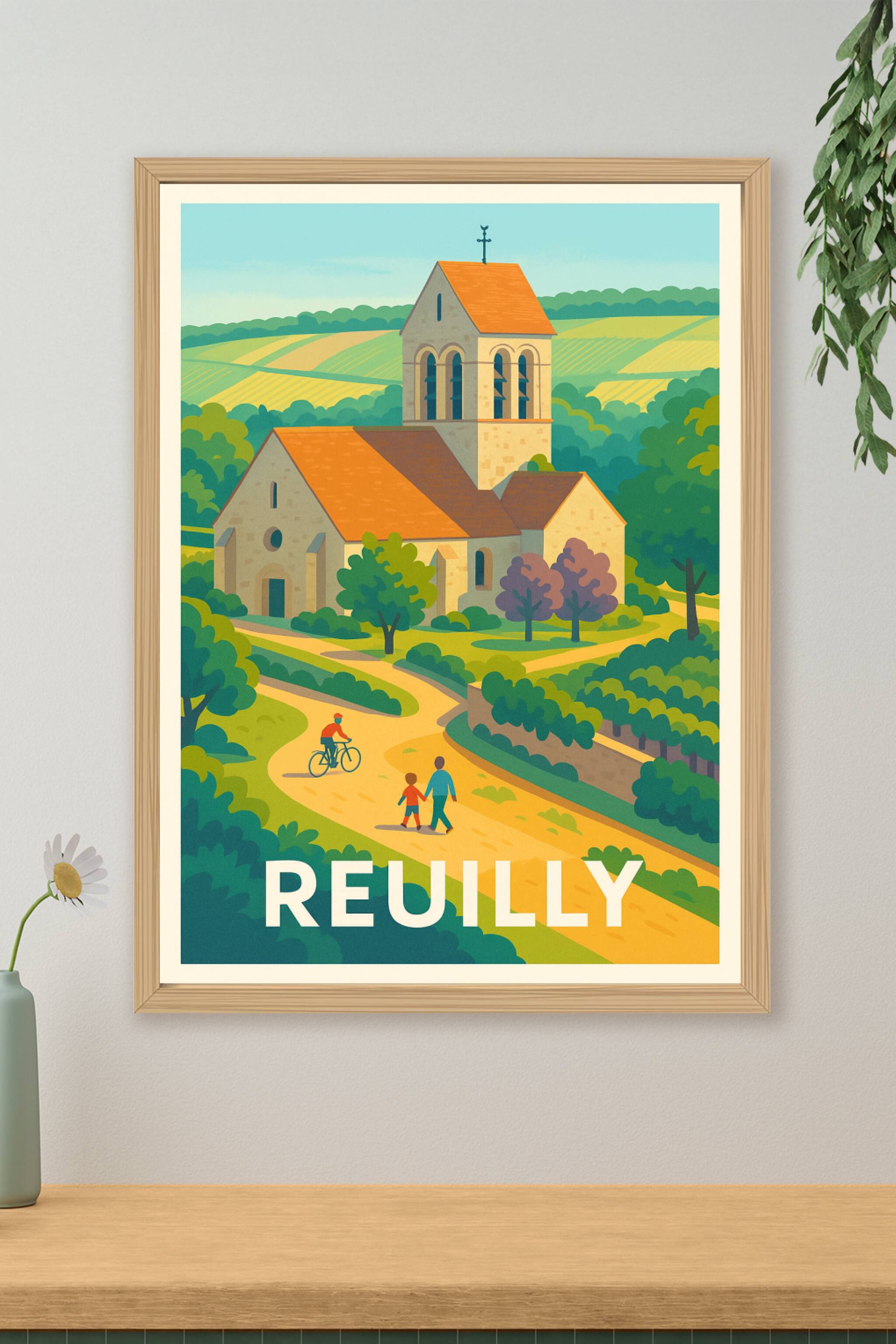 Apportez une touche de sérénité et de charme campagnard à votre intérieur avec ce poster illustré de Reuilly, mettant en scène une église typique a...
