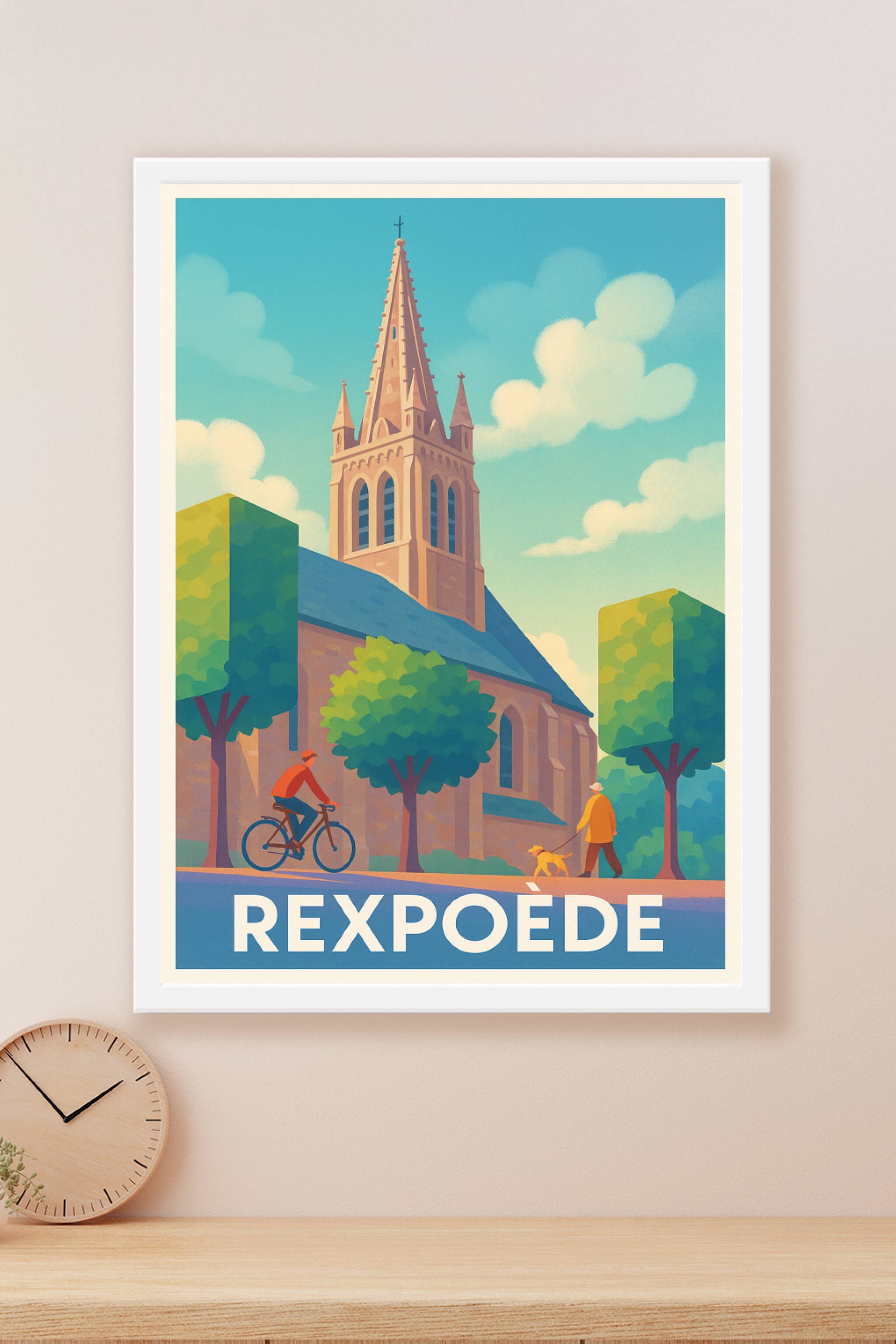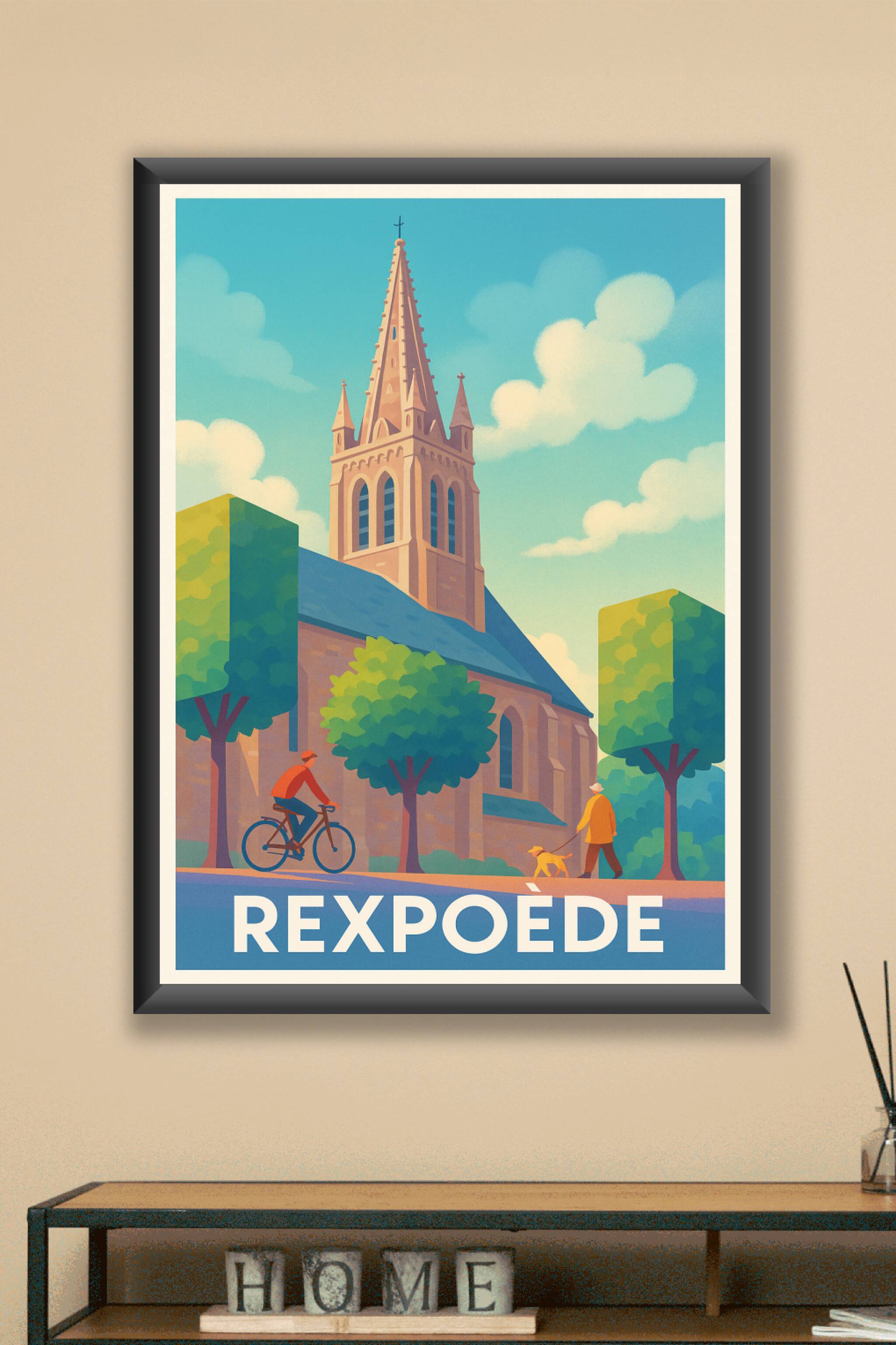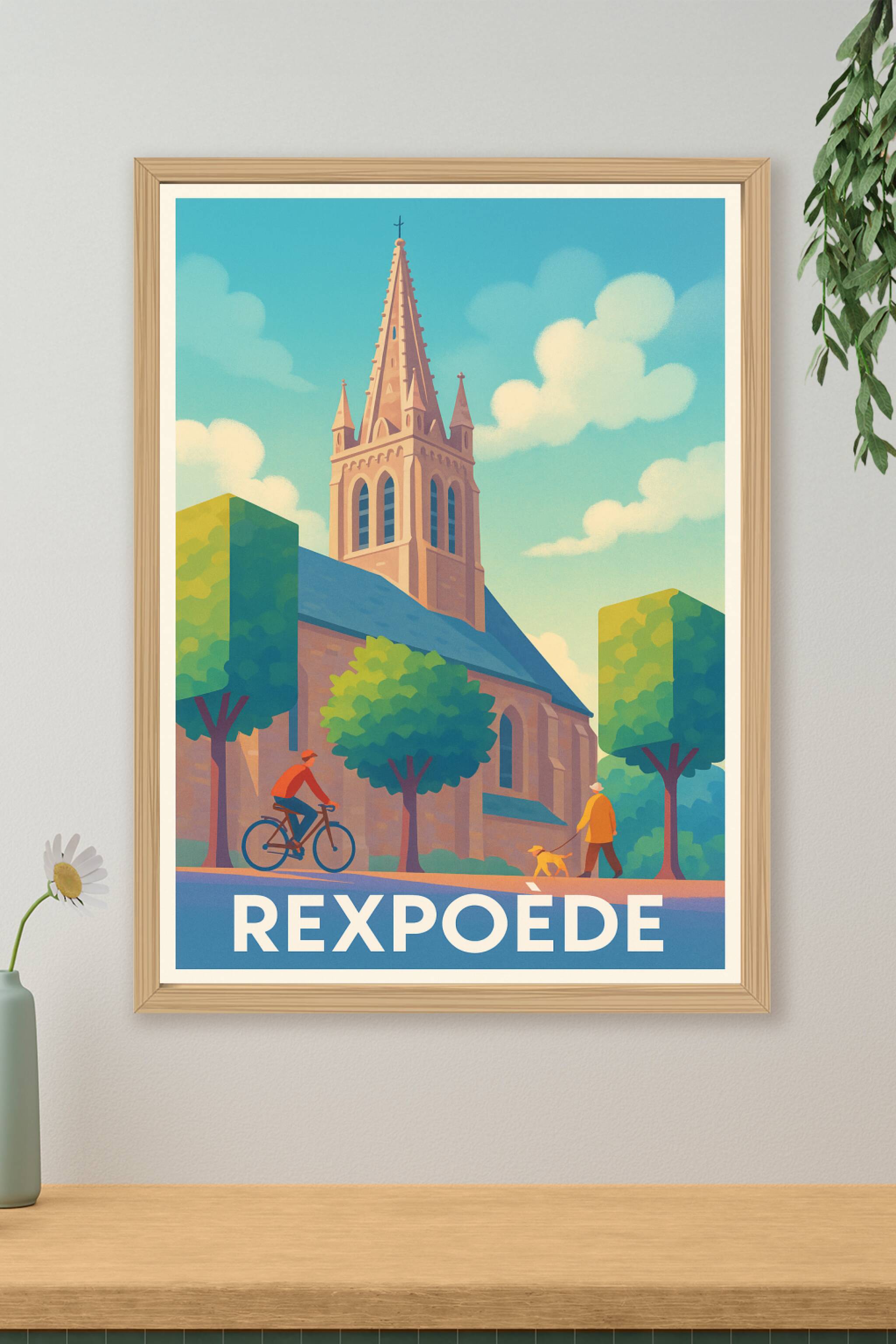 Découvrez l'atmosphère tranquille et authentique de Rexpoëde avec cette superbe affiche illustrée mettant en avant l'église emblématique de la vill...