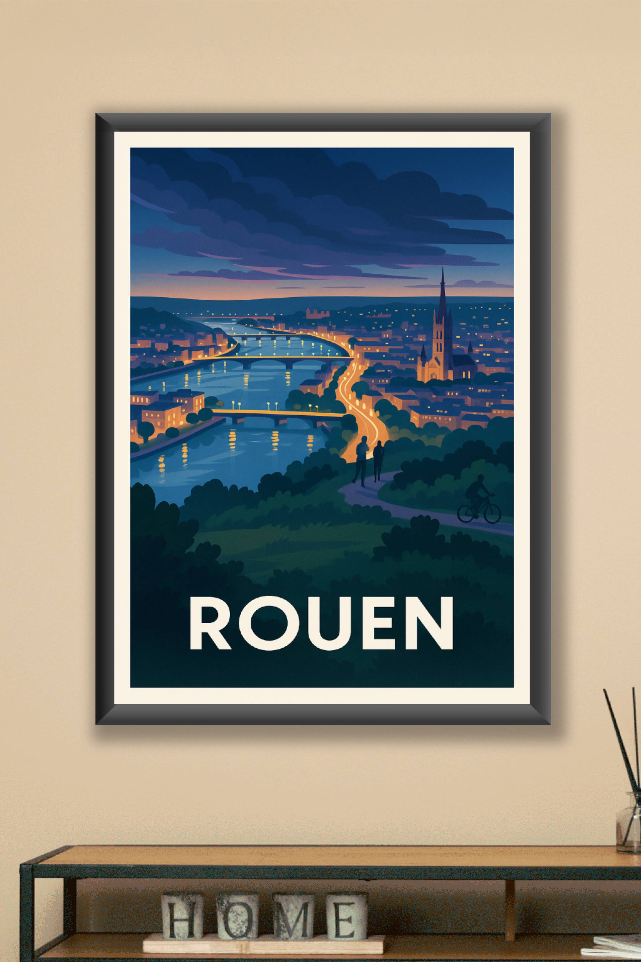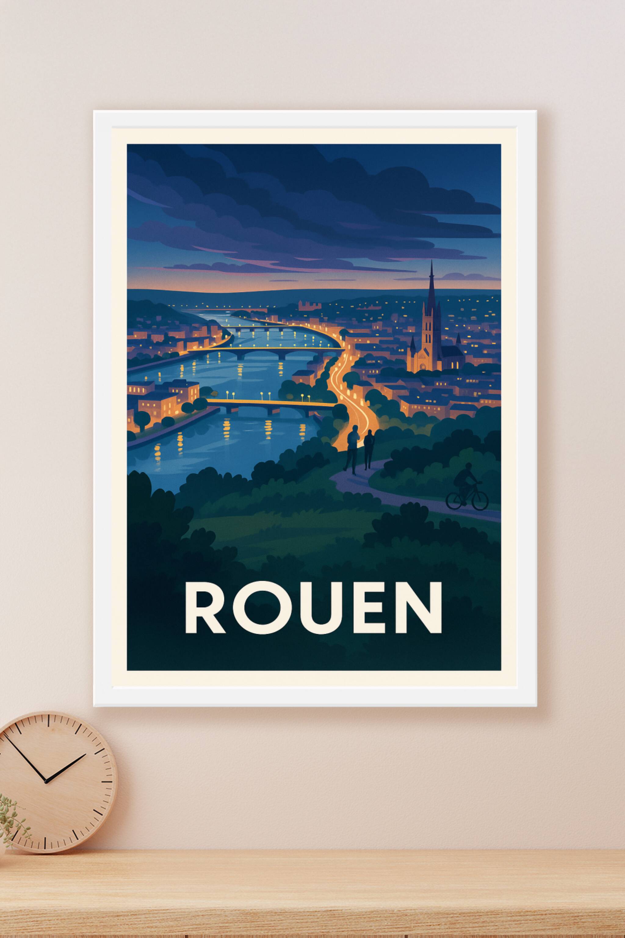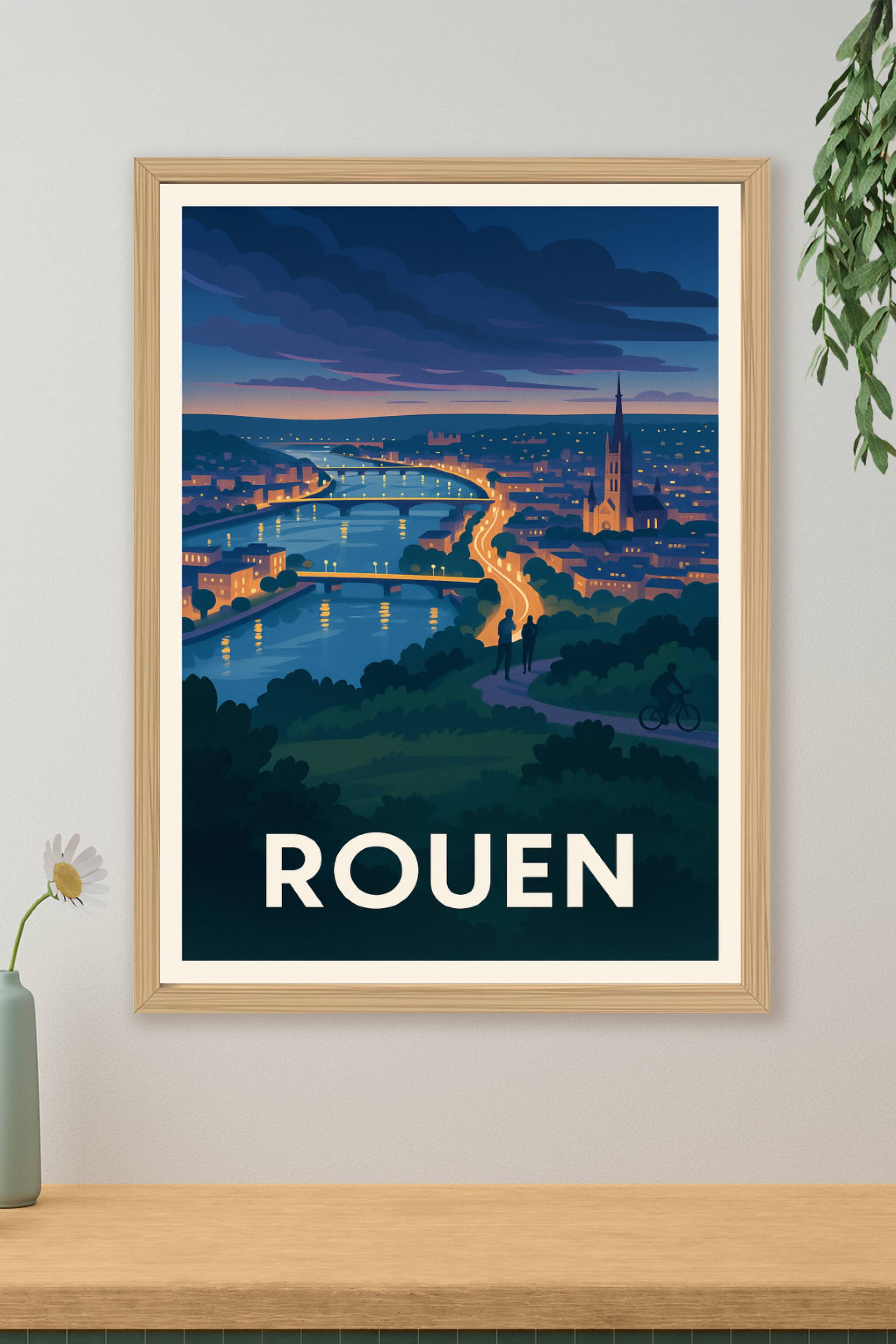 Découvrez la ville de Rouen sous une lumière apaisante avec cette affiche illustrative qui capture le charme nocturne de ses rives et de son archit...
