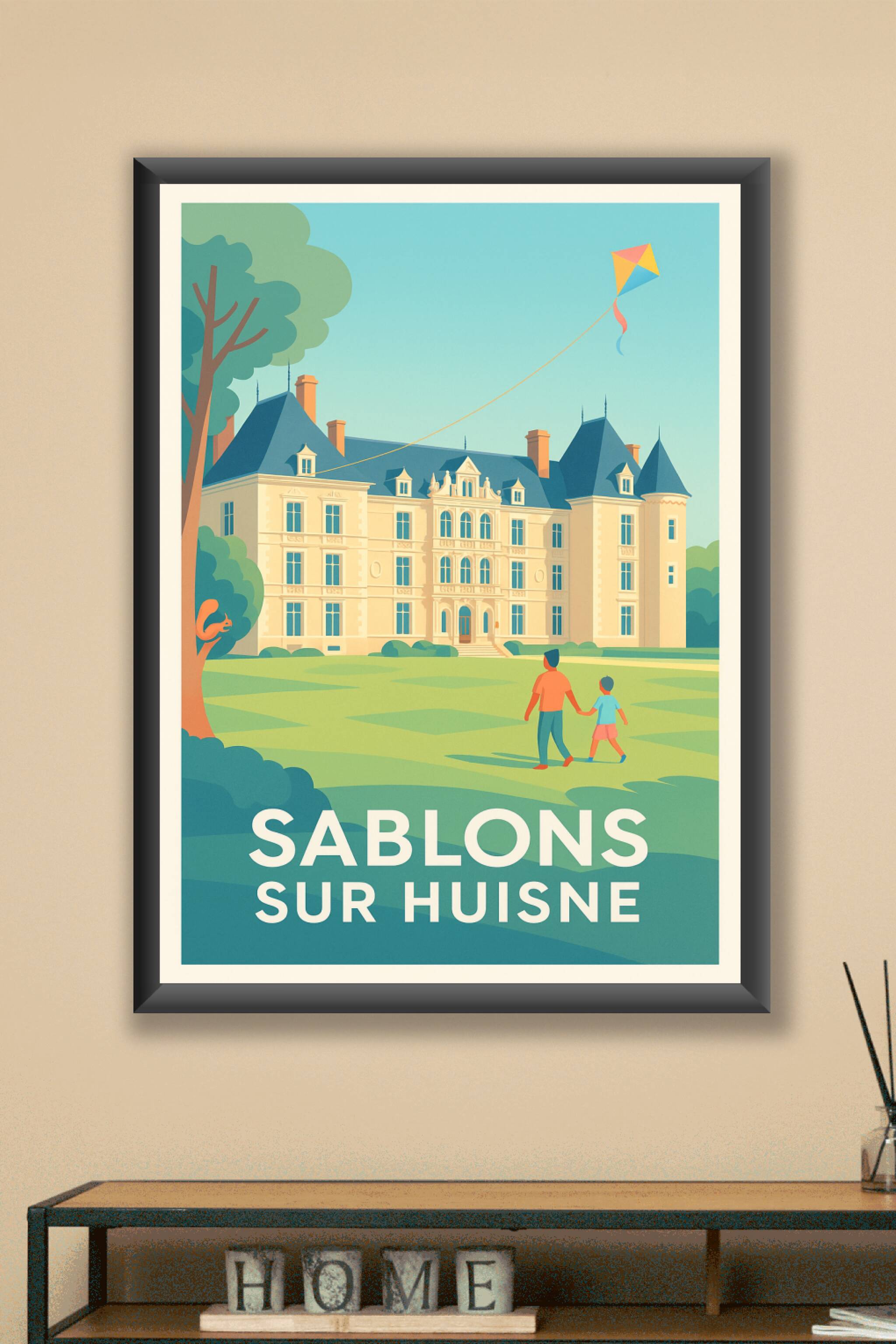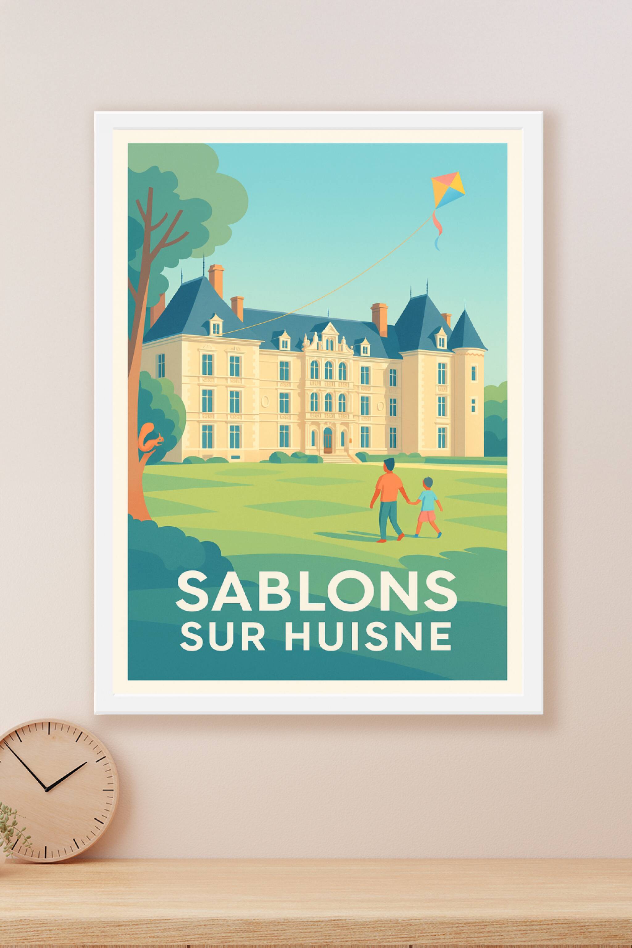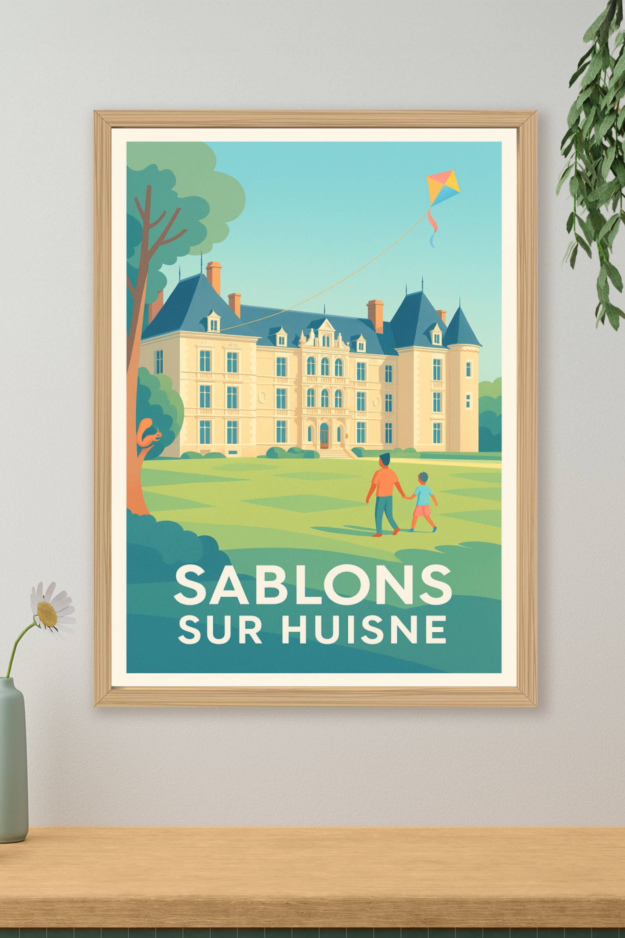 Découvrez l'élégance et la sérénité de Sablons-sur-Huisne à travers cette affiche illustrée mettant en scène son magnifique château baigné de lumiè...