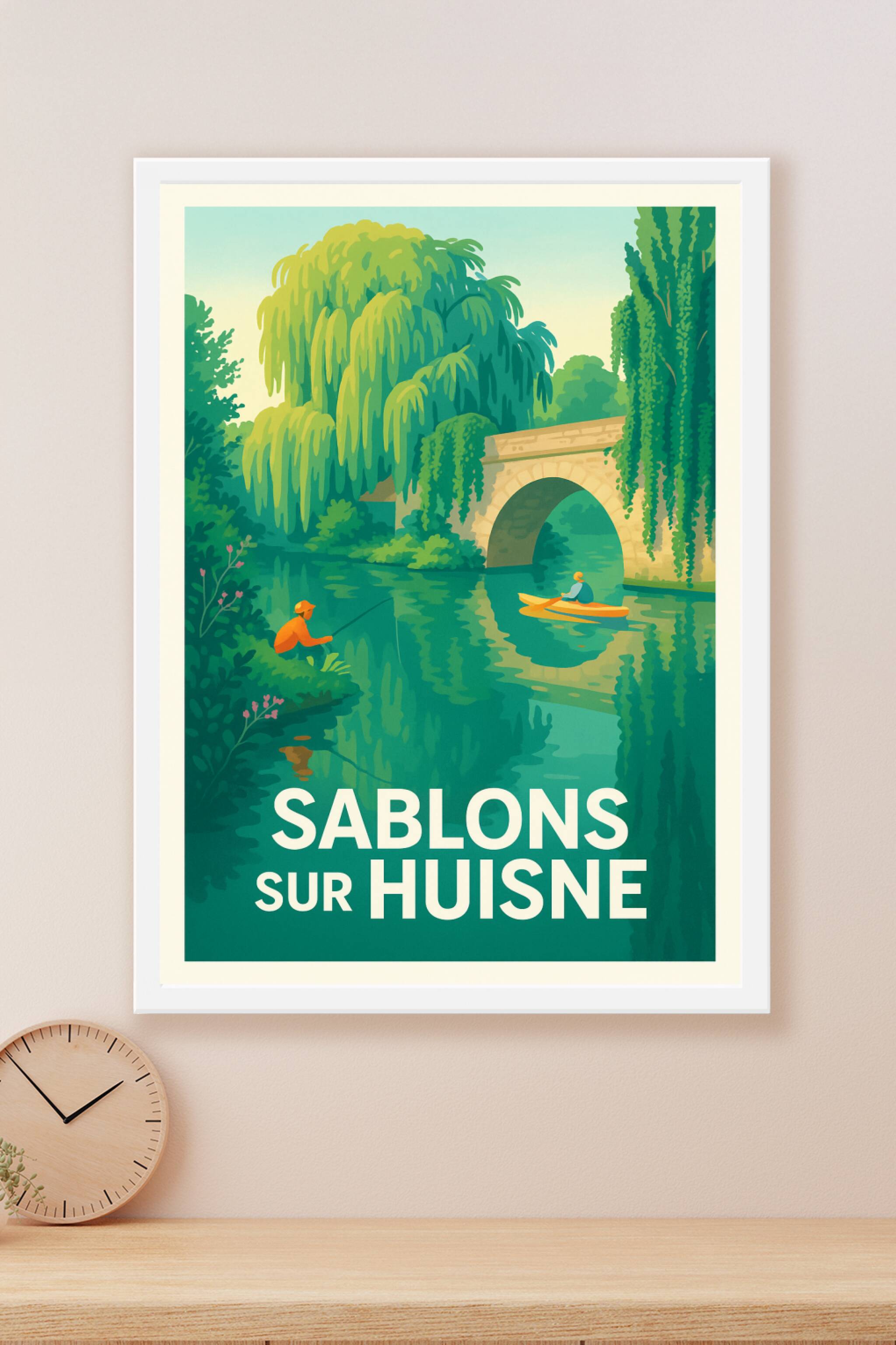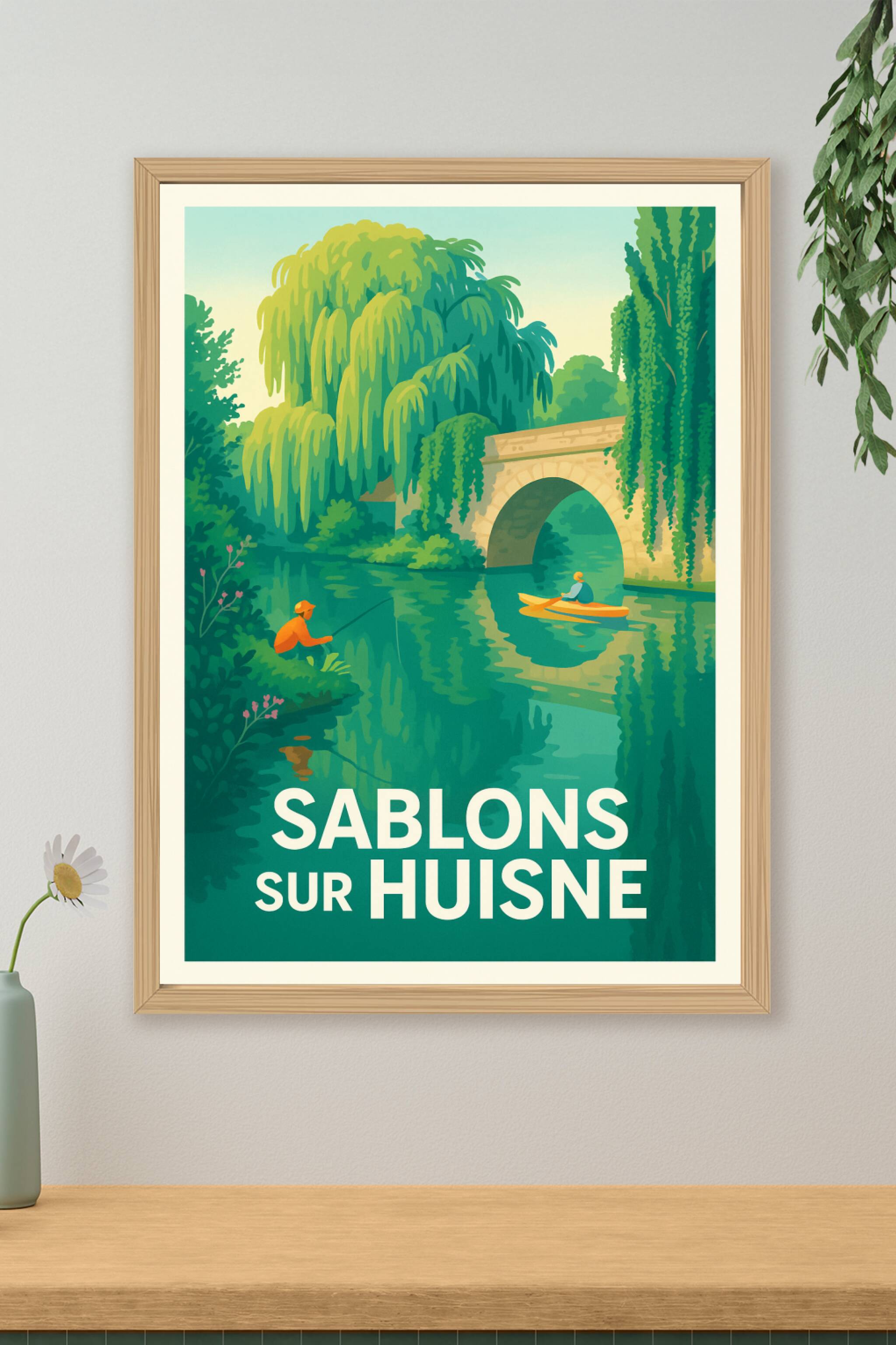 Découvrez la sérénité et la beauté naturelle de Sablons-sur-Huisne avec cette affiche d'inspiration rétro, où un pêcheur et un kayakiste évoluent p...