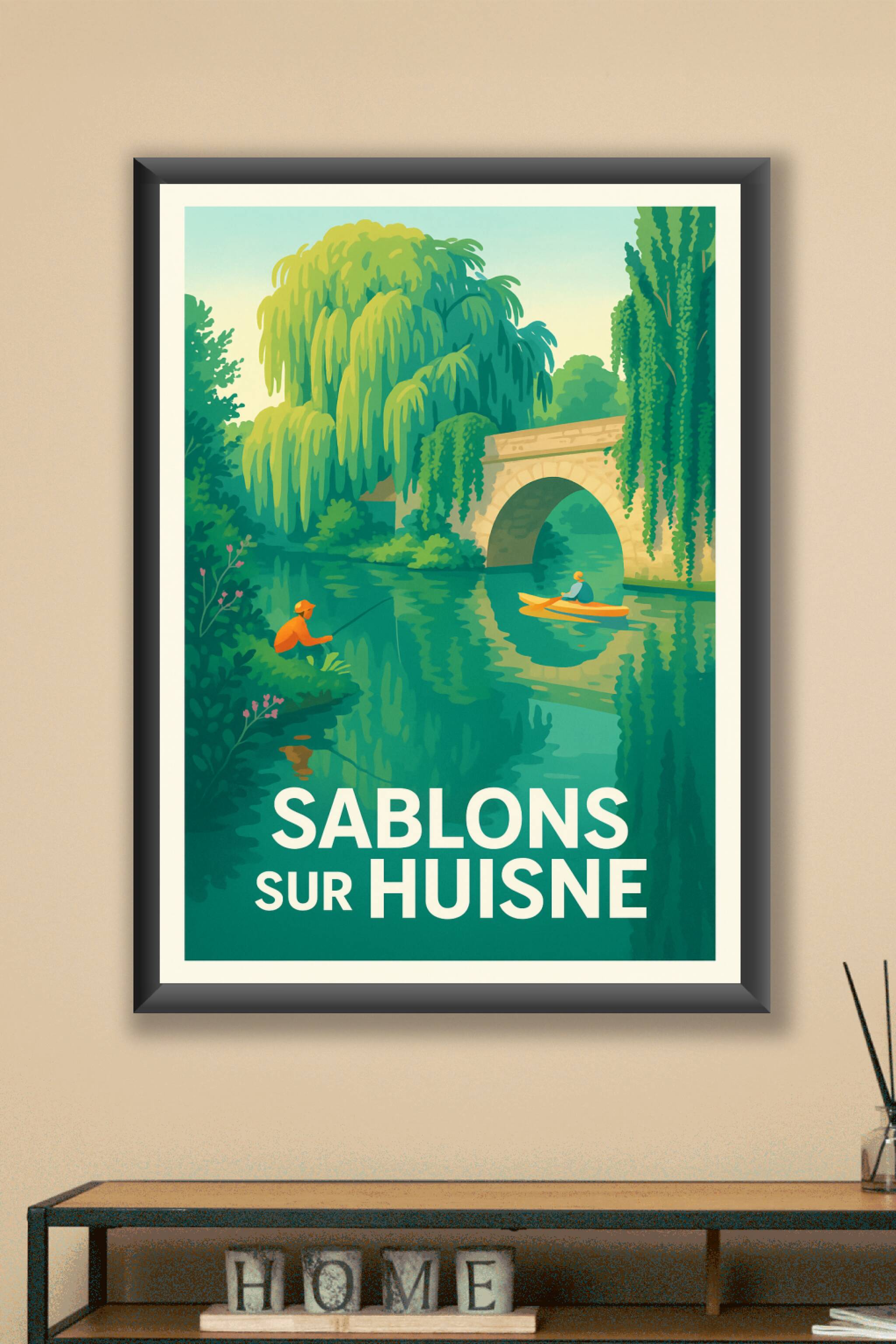 Découvrez la sérénité et la beauté naturelle de Sablons-sur-Huisne avec cette affiche d'inspiration rétro, où un pêcheur et un kayakiste évoluent paisiblement sur une rivière traversée par un pont de pierre ancien. Cette scène pittoresque invite à l'évasion et à la détente, parfait pour sublimer votre décoration intérieure.Ce poster est disponible en tirage "Fine Art" sur papier 305g coton, garantissant une qualité d'impression exceptionnelle avec des couleurs riches et durables. Choisissez votre format préféré, de l'intimiste A4 au grand format A1, avec ou sans cadre, pour adapter cette affiche à votre espace. Imprimée en France, elle constitue un cadeau idéal ou un élément décoratif raffiné pour tous les amoureux des paysages bucoliques.