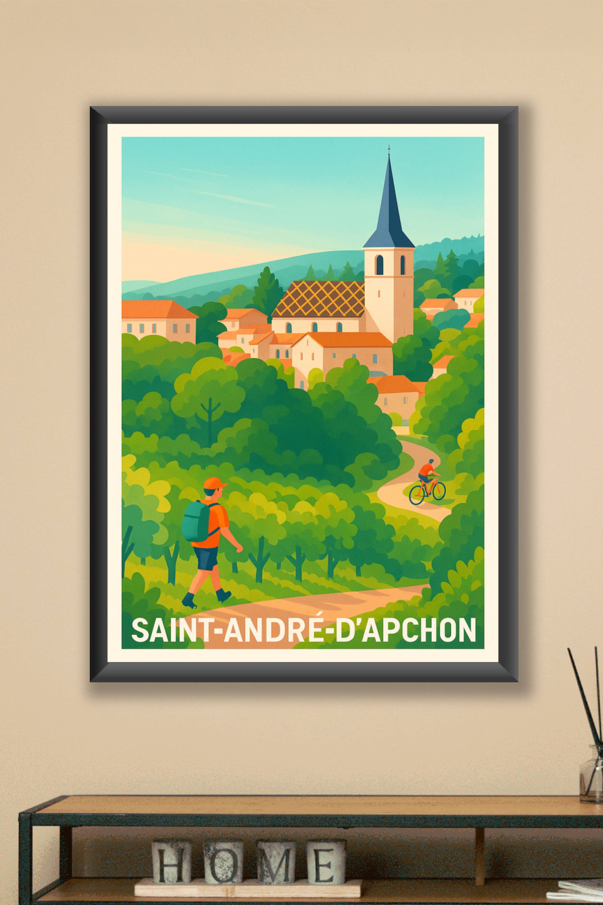 Découvrez la douceur de vivre à Saint-André-d'Apchon avec cette affiche illustrée qui met en valeur son paysage verdoyant et son village pittoresque dominé par son église au clocher caractéristique. Ce poster évoque la promenade et les balades à vélo dans un cadre naturel apaisant, parfait pour insuffler une touche de sérénité à votre intérieur. Imprimée en tirage "Fine Art" sur papier 305g coton, cette affiche garantit une qualité d'impression exceptionnelle, avec des couleurs vives et un rendu soigné. Disponible en formats A1 à A4, avec ou sans cadre, elle s'adapte à toutes vos envies déco. Faites entrer la campagne française chez vous avec ce poster haute qualité, 100% fabriqué en France, idéal pour décorer ou offrir un souvenir authentique de Saint-André-d'Apchon.
