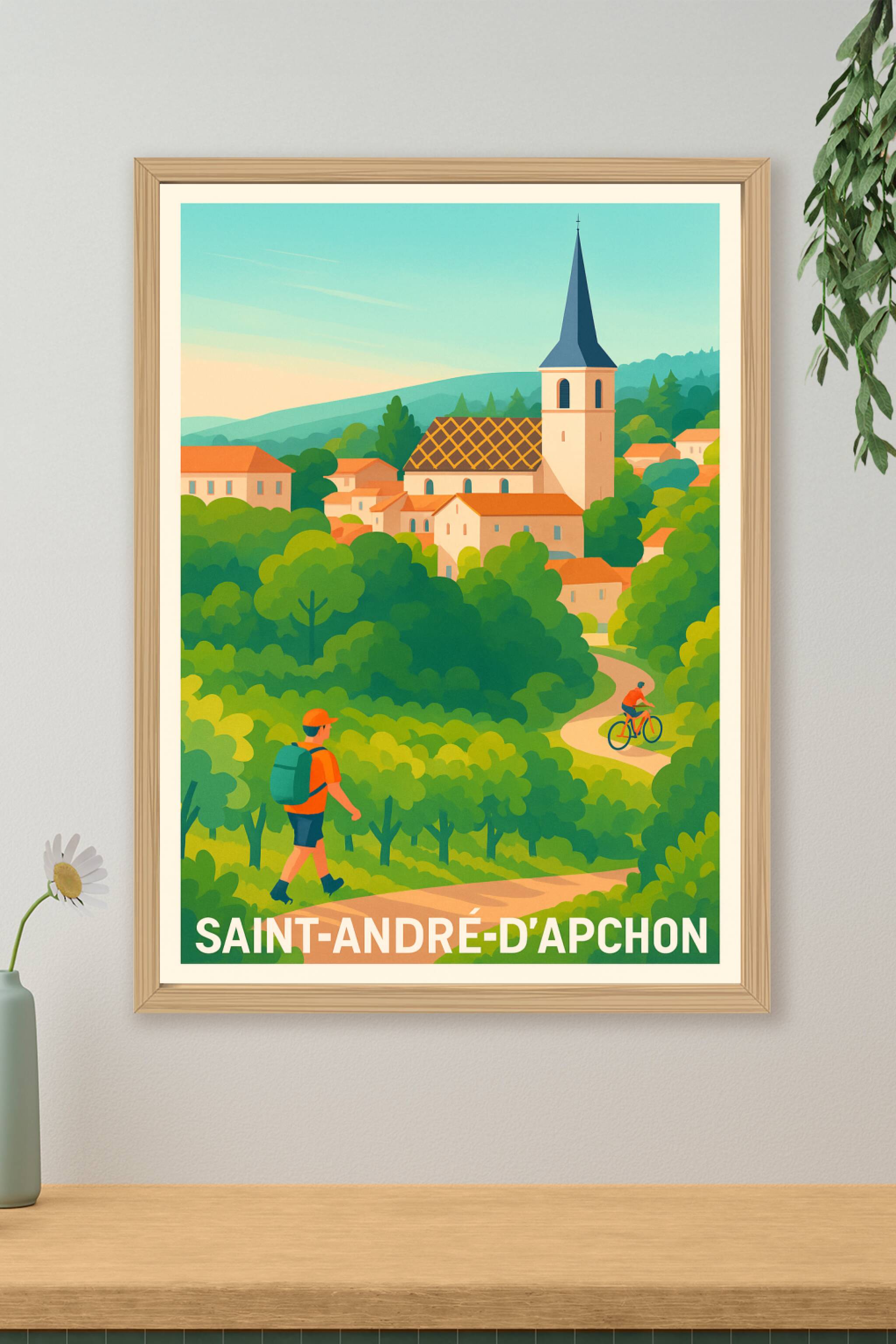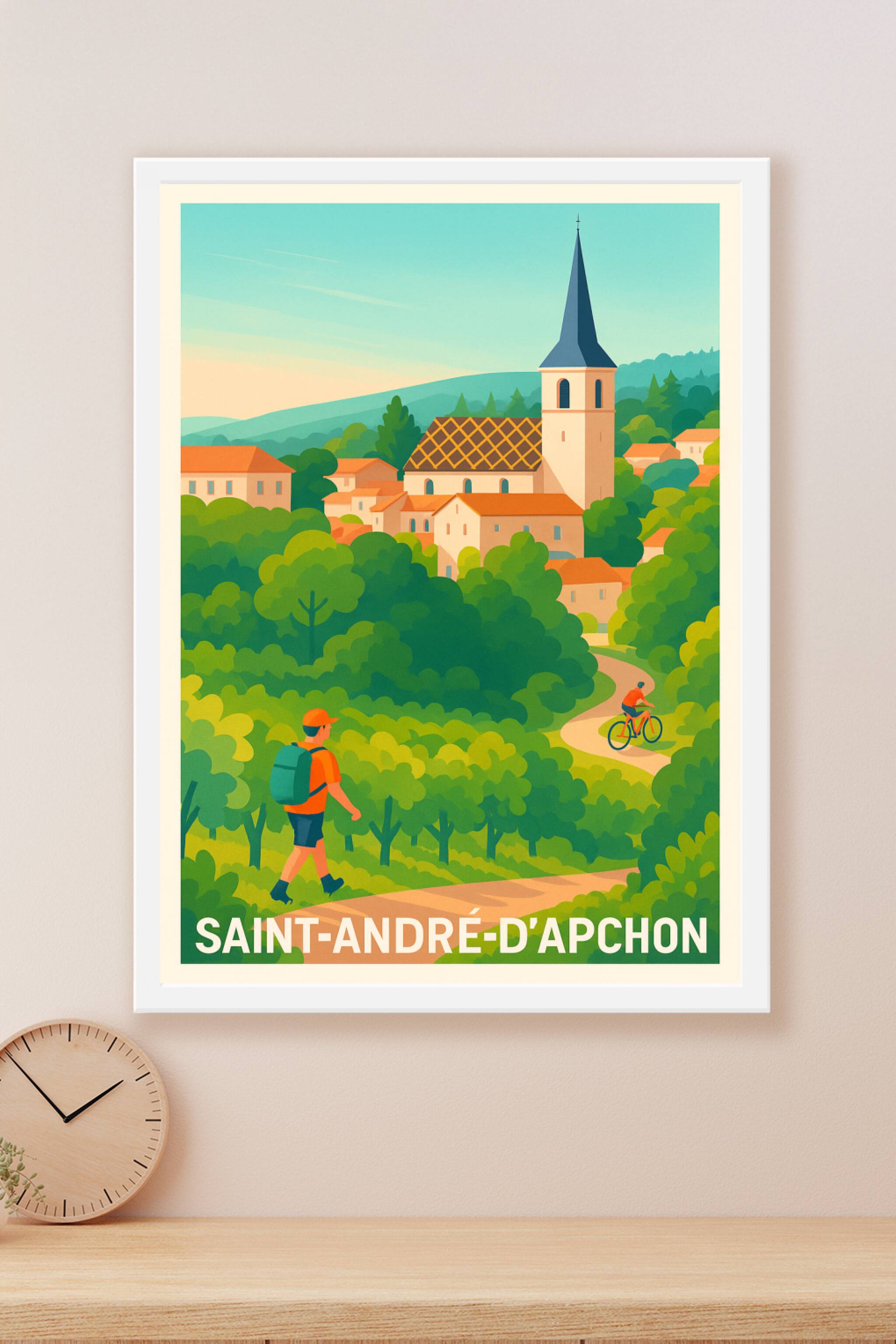 Découvrez la douceur de vivre à Saint-André-d'Apchon avec cette affiche illustrée qui met en valeur son paysage verdoyant et son village pittoresqu...
